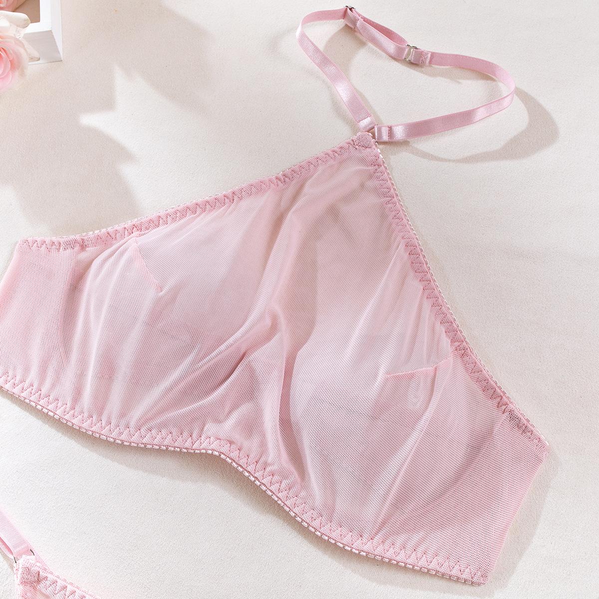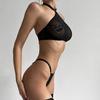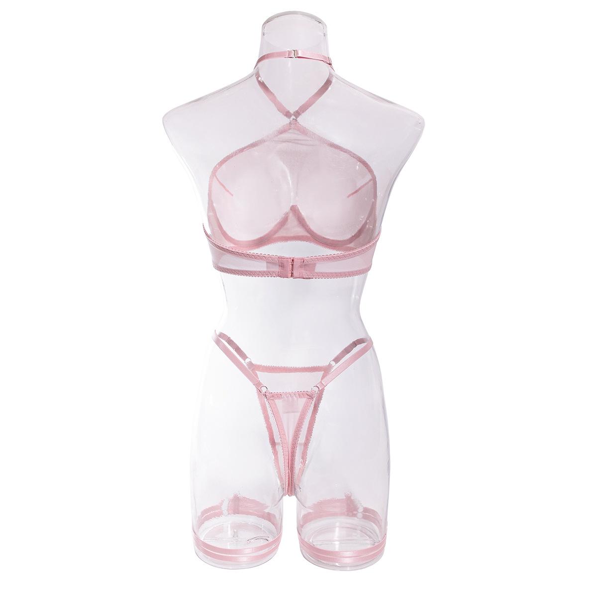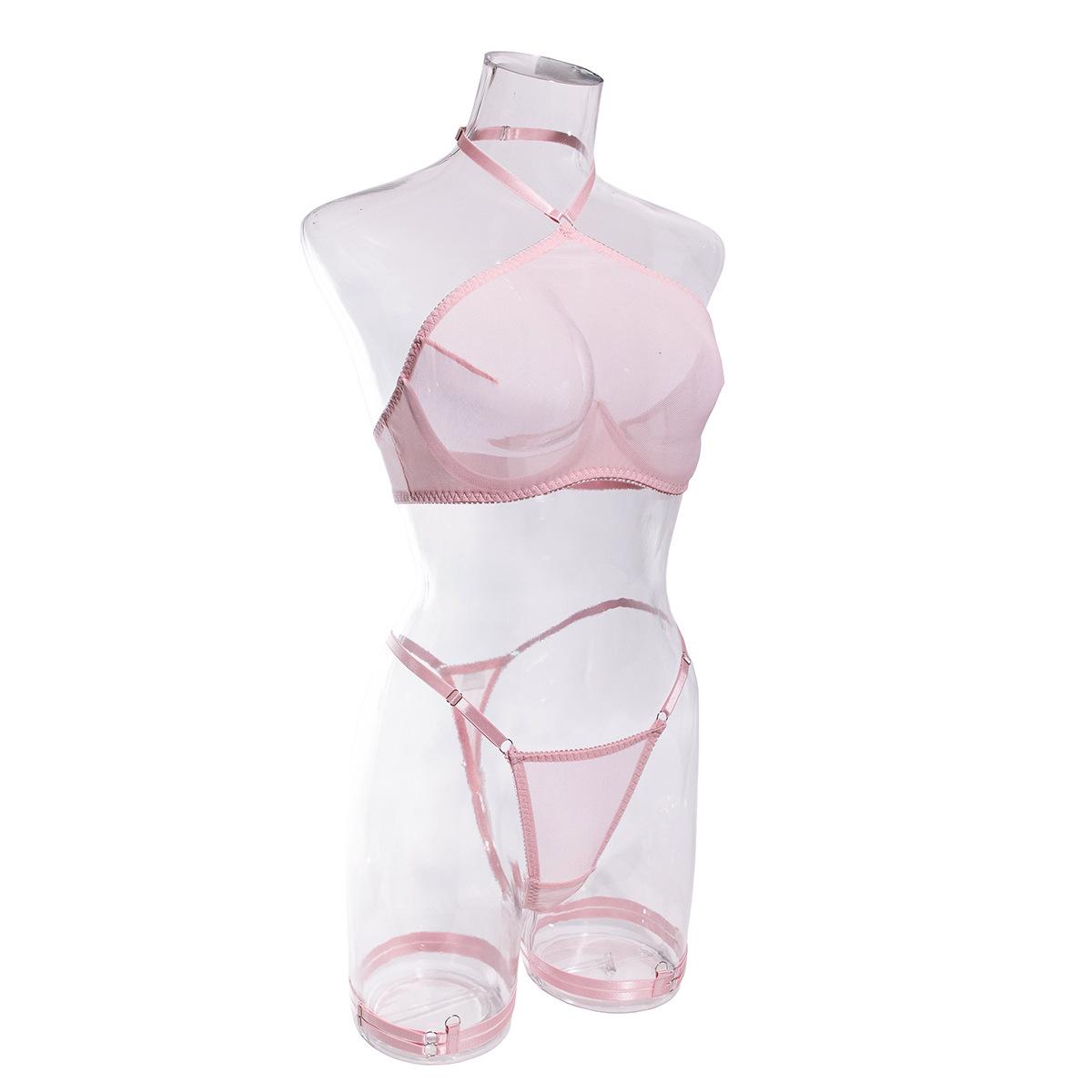 Sexy Ultradelgado Malla Transparente Aro de Acero Push-Up Halterneck Tres Piezas Íntimas con Anillos para Pierna y Bufanda en Stock Nuevo Qqny