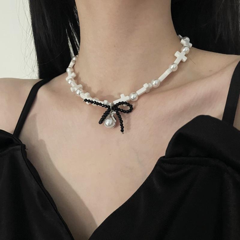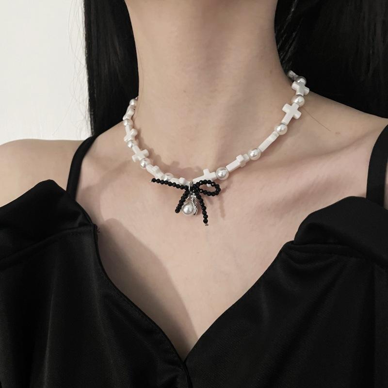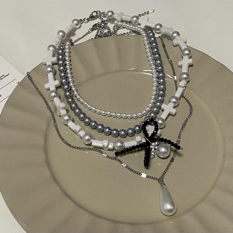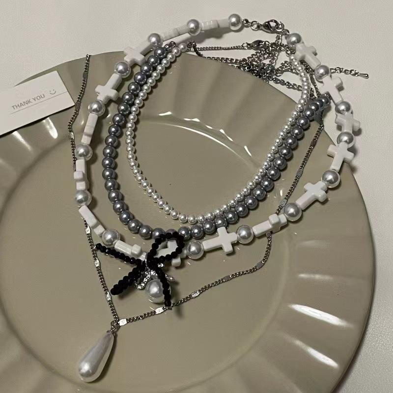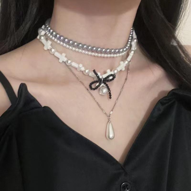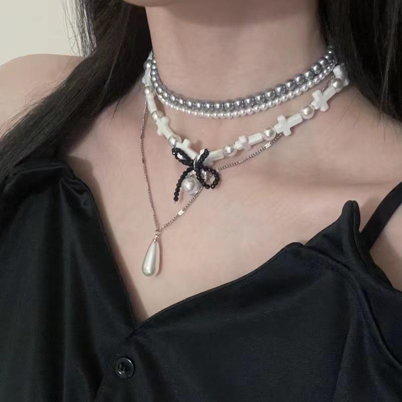 Collar de Cadena para Clavícula Multicapa con Lazo de Perla Gris, Cruz y Gotas de Agua, Moda Elegante, Diseño Nicho de Alta Gama