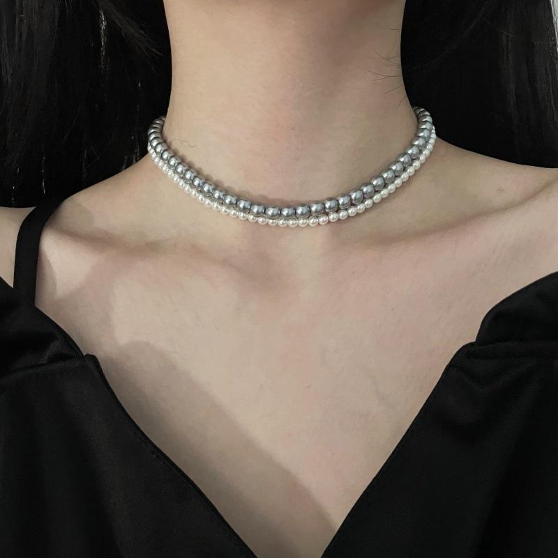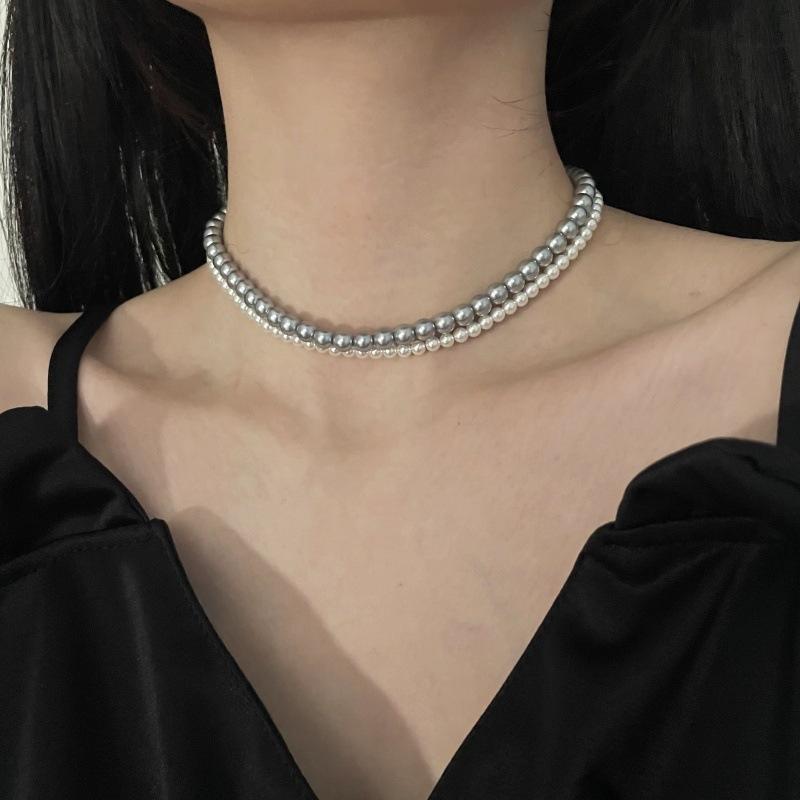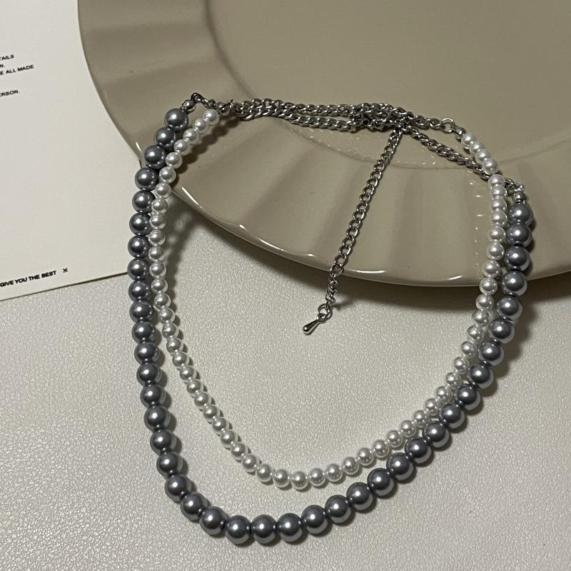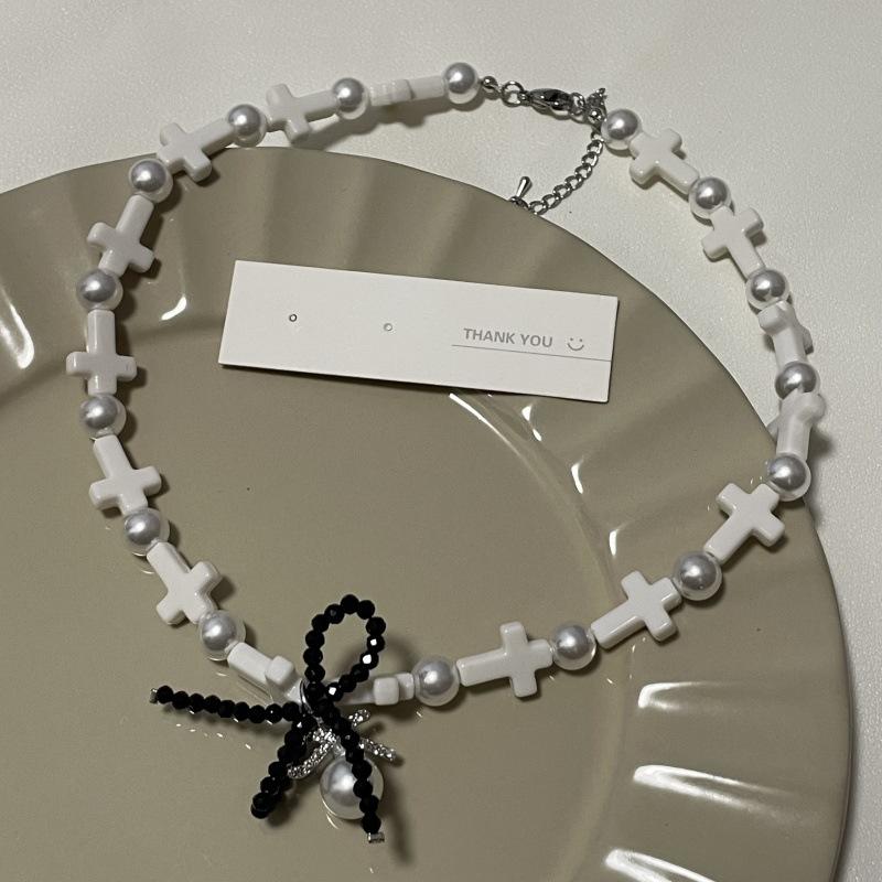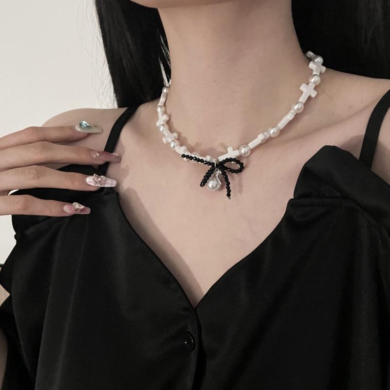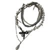 Collar de Cadena para Clavícula Multicapa con Lazo de Perla Gris, Cruz y Gotas de Agua, Moda Elegante, Diseño Nicho de Alta Gama