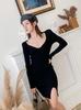 Vestido negro transparente sexy de primavera para mujer, de talla grande, de malla tejida, cuello redondo, manga larga, estilo europeo y americano.