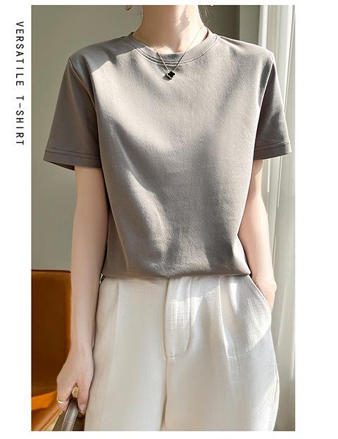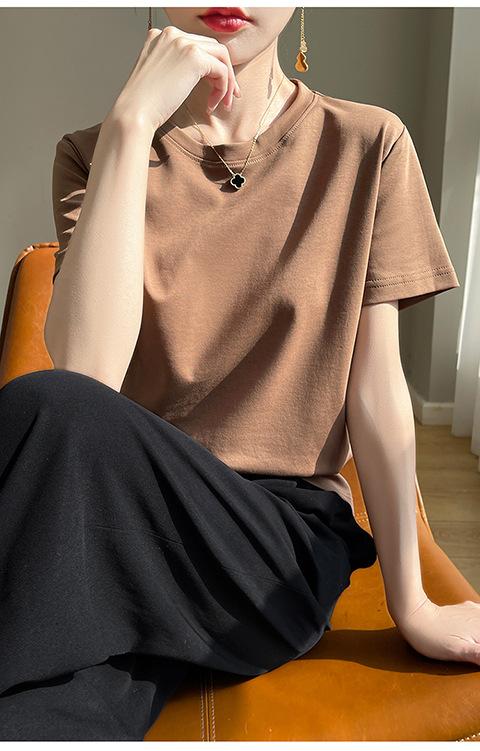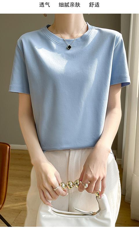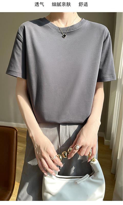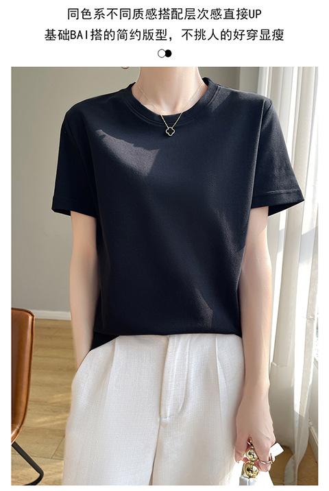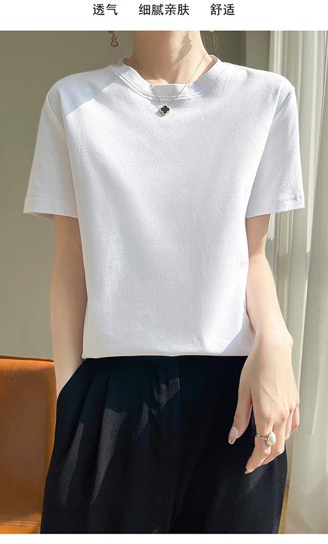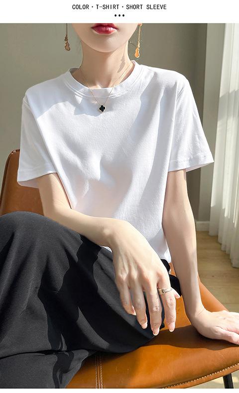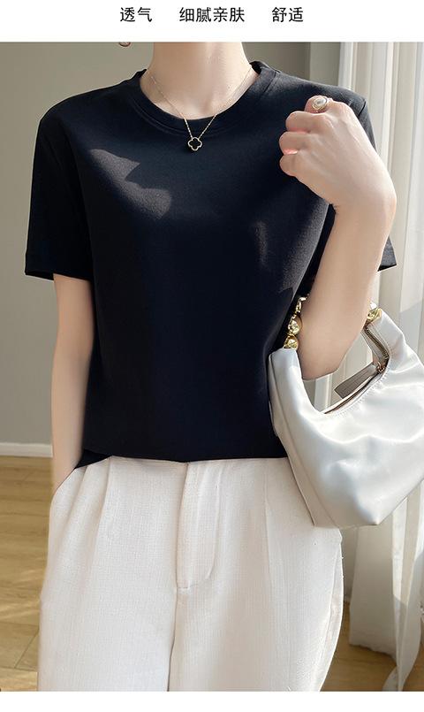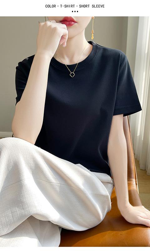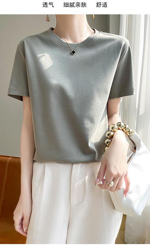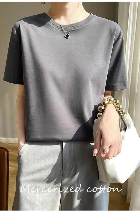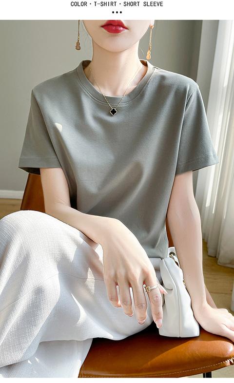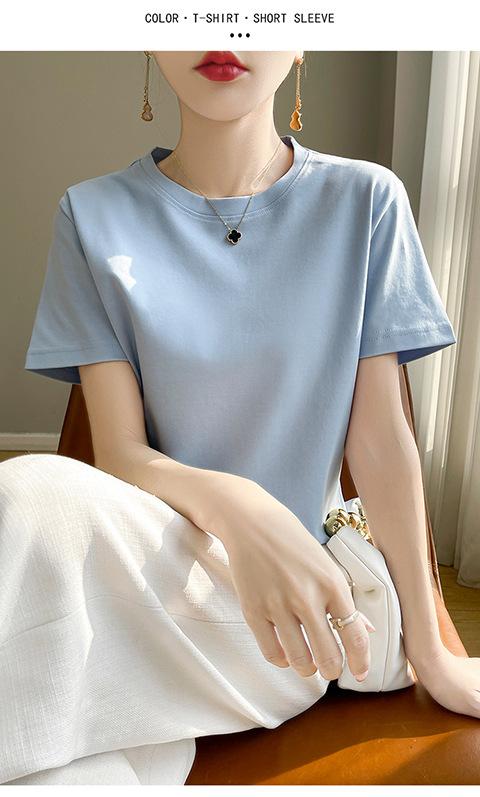 Camiseta de manga corta de algodón mercerizado para mujer, novedad de verano 2024, cuello redondo, camisa básica, suelta, ajustada, para uso exterior, top de media manga.