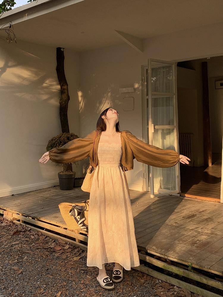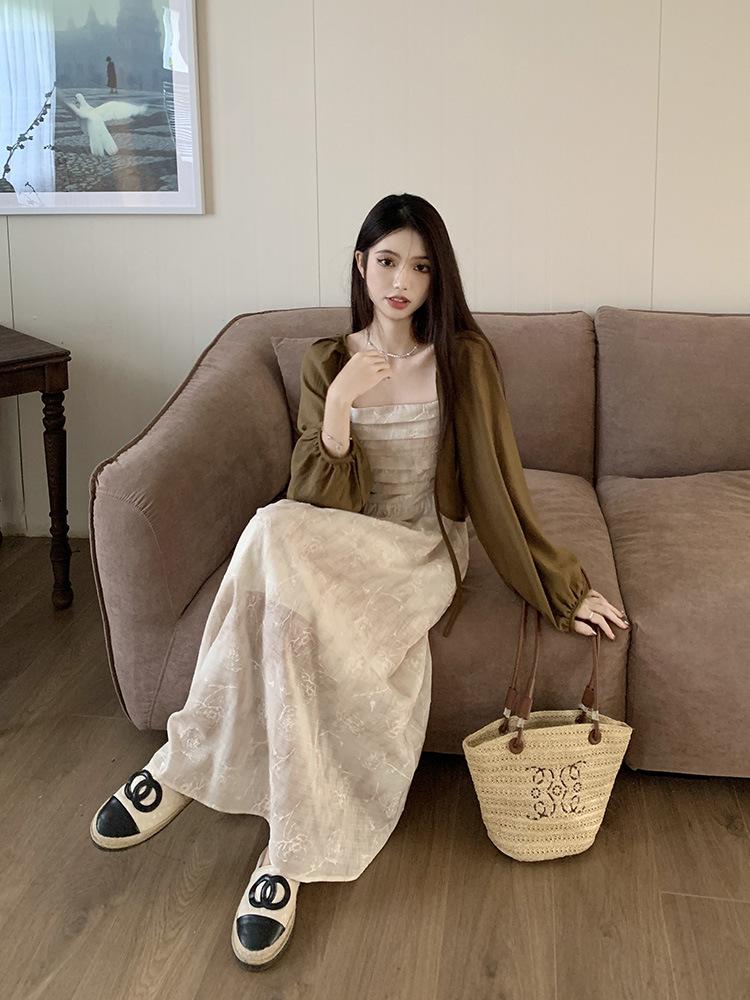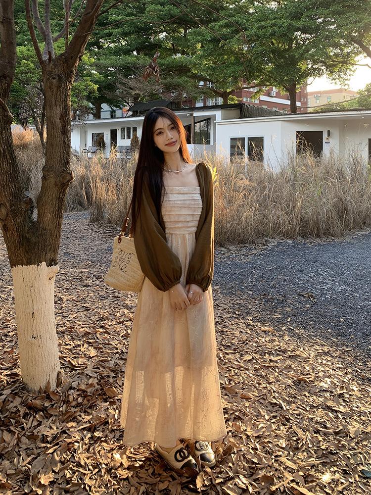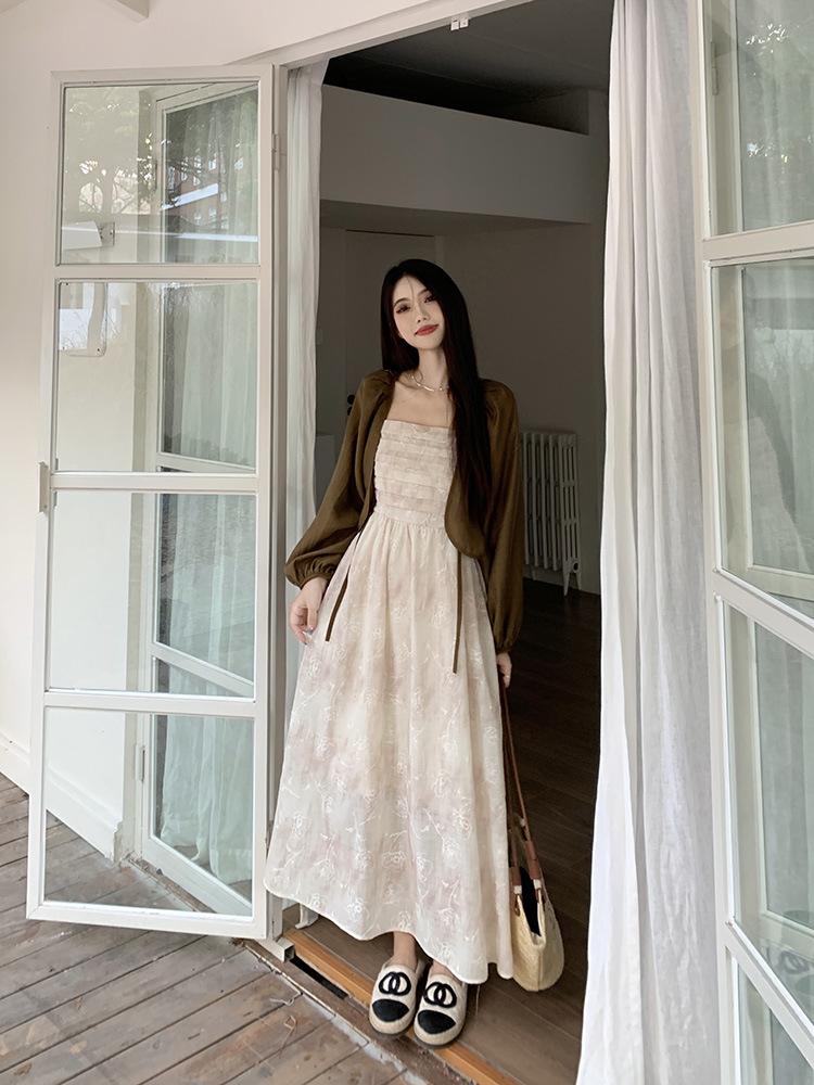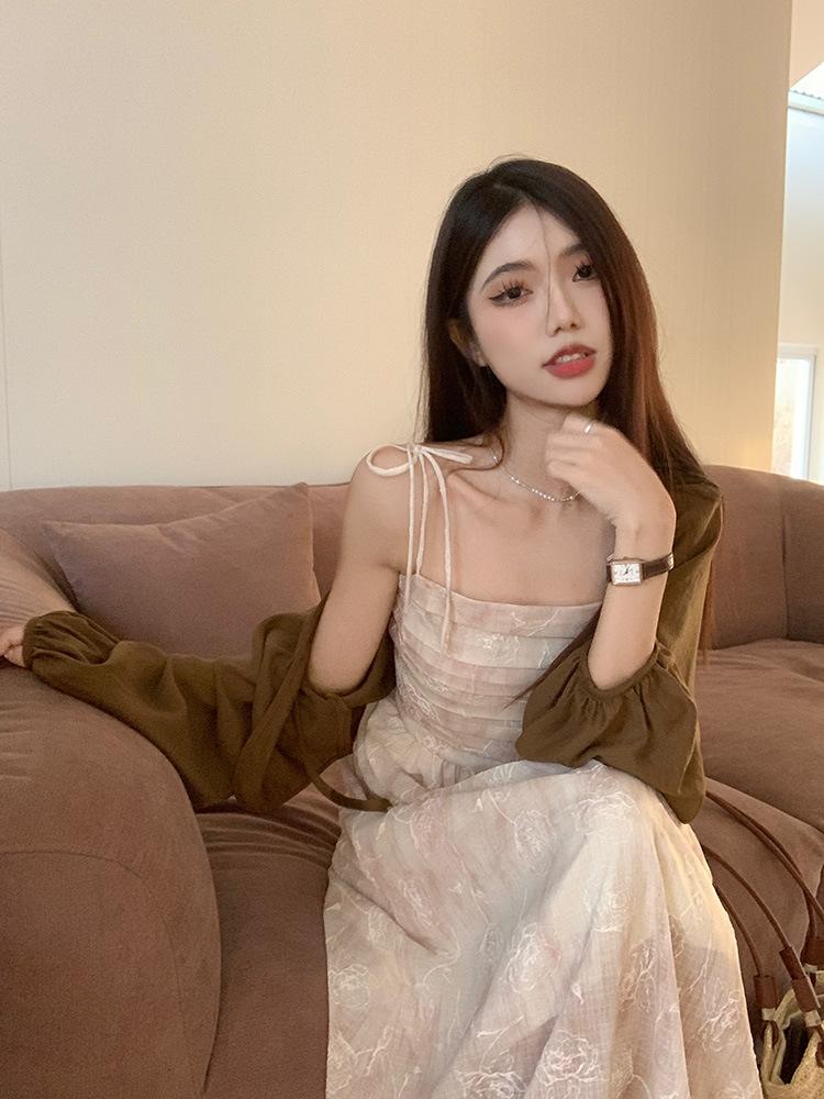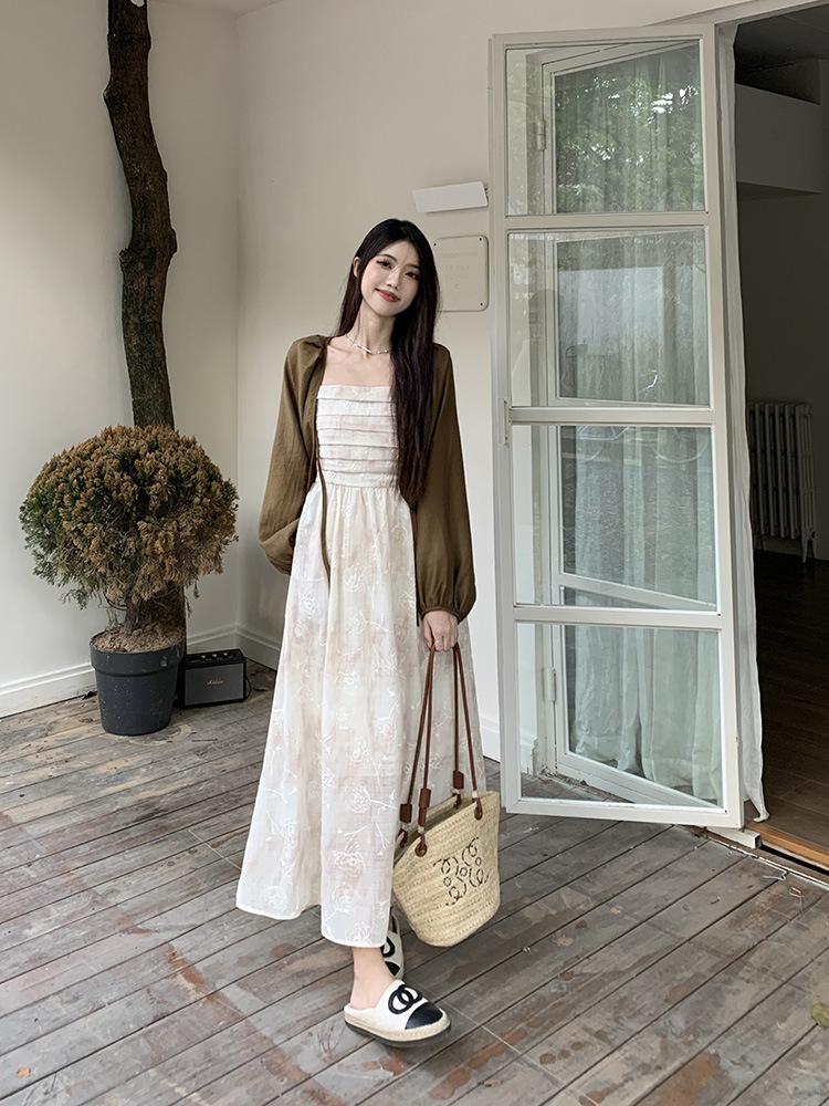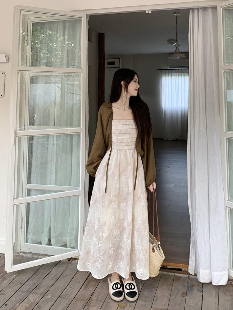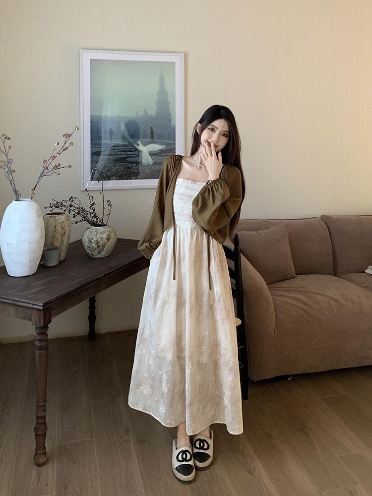Vestido de Tirantes de Encaje con Flor Crochet para Mujer Talla Grande Estilo Francés Estilo Suave Set de Cárdigan Protector Solar para Mujer