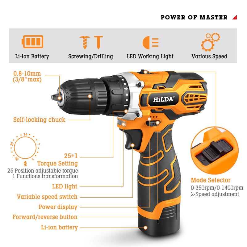 Taladro eléctrico manual, herramienta de litio, destornillador eléctrico, destornillador eléctrico, juego de taladro de impacto.
