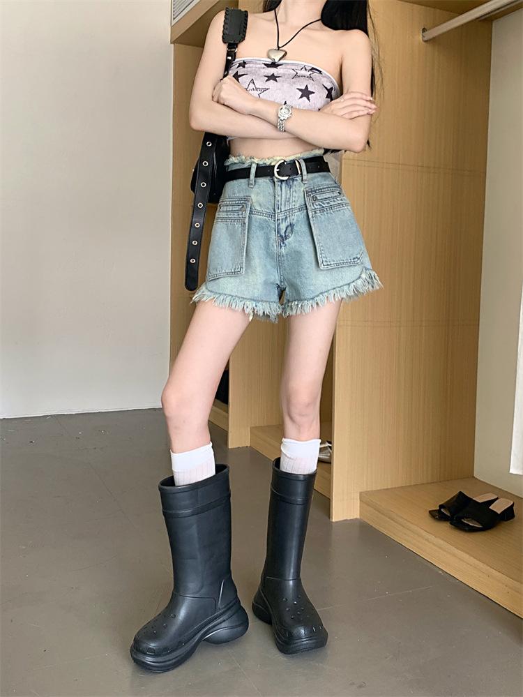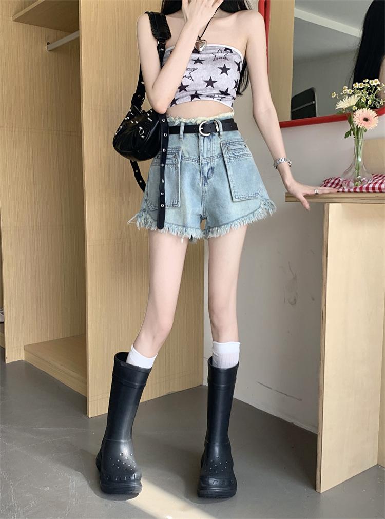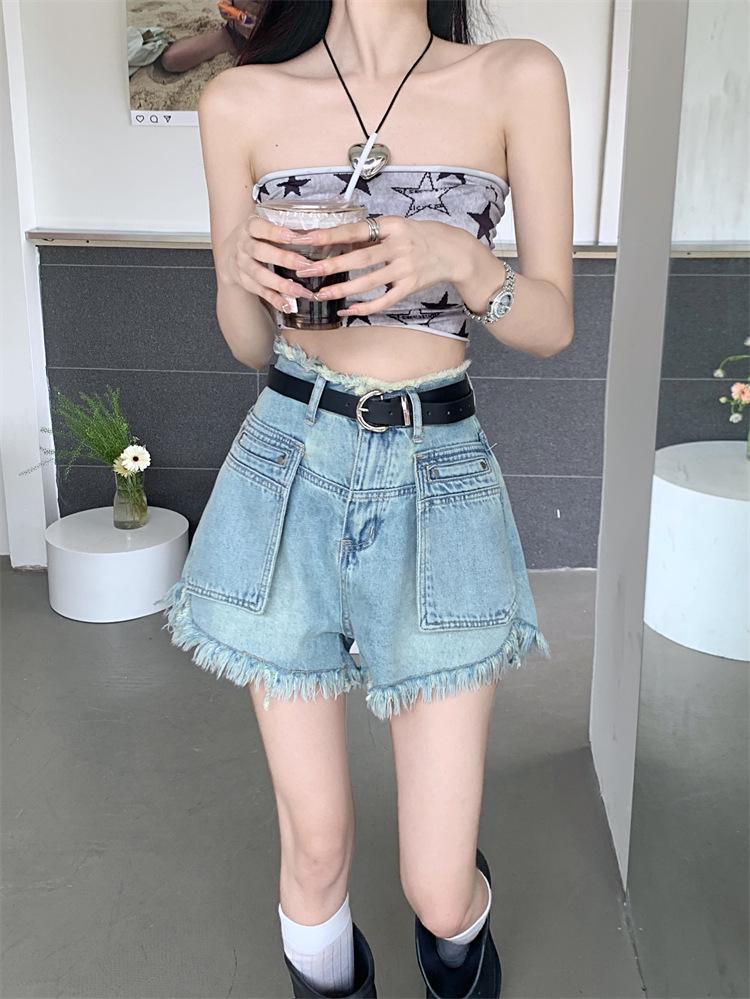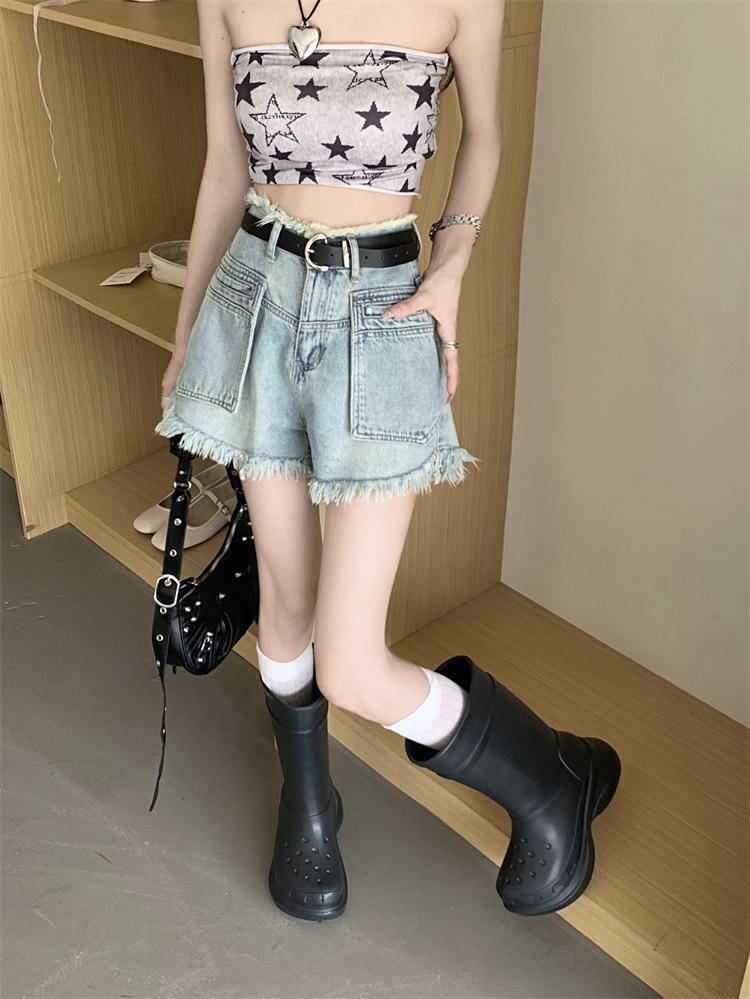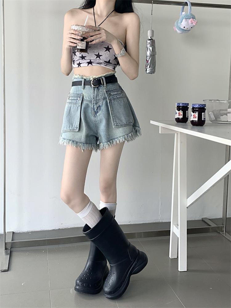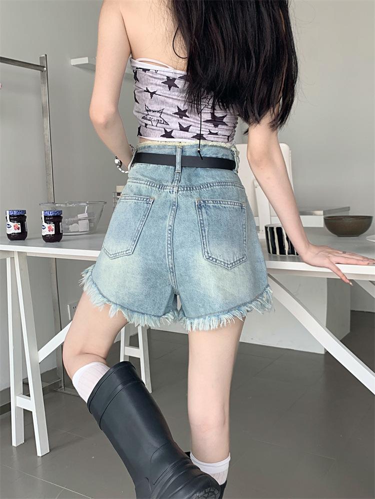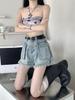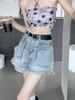 Pantalones cortos vaqueros de cintura alta para mujer, verano 2024, nuevos pantalones cortos adelgazantes con borlas y palabra A para Spice Girls.