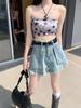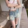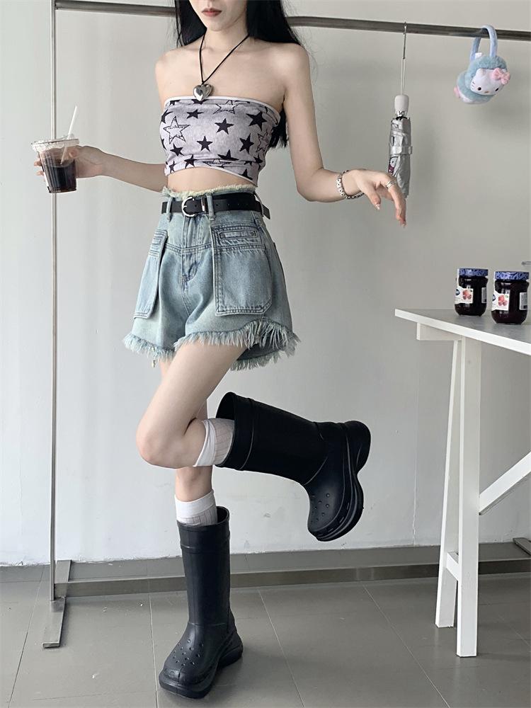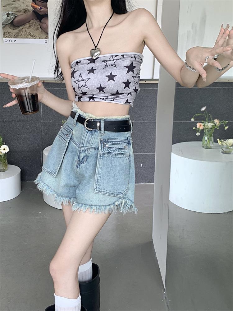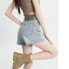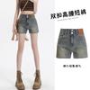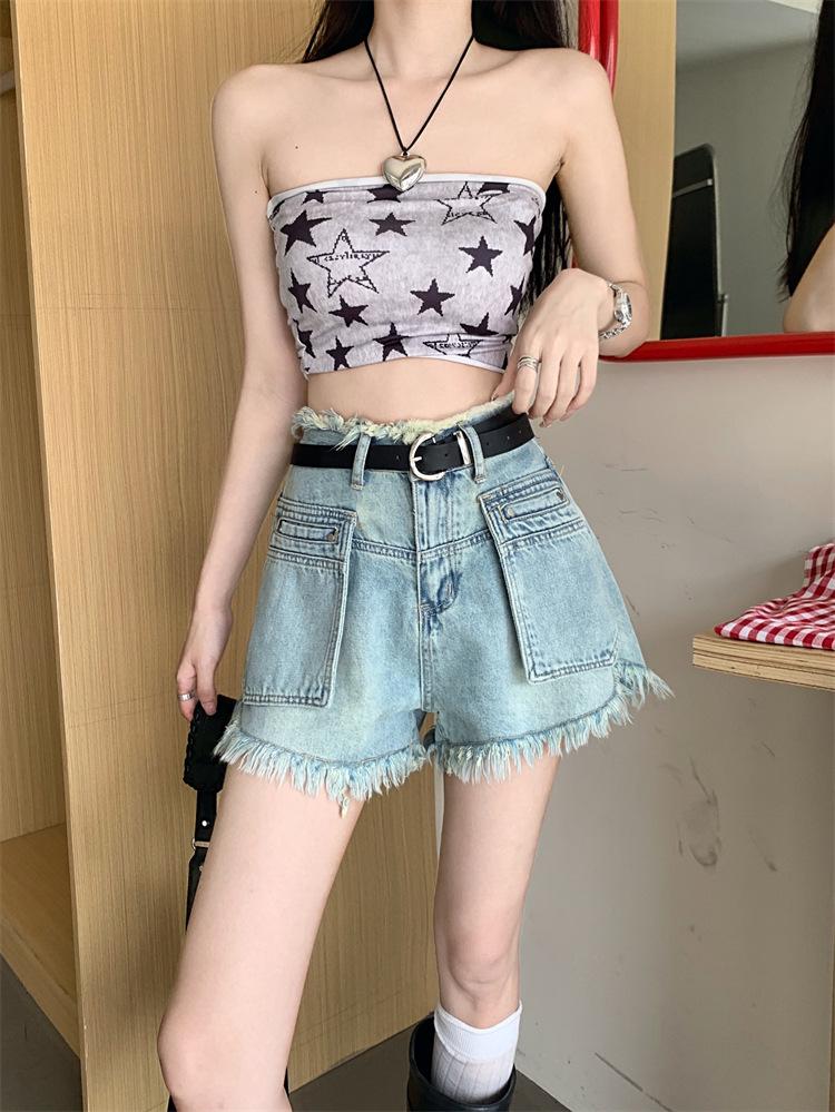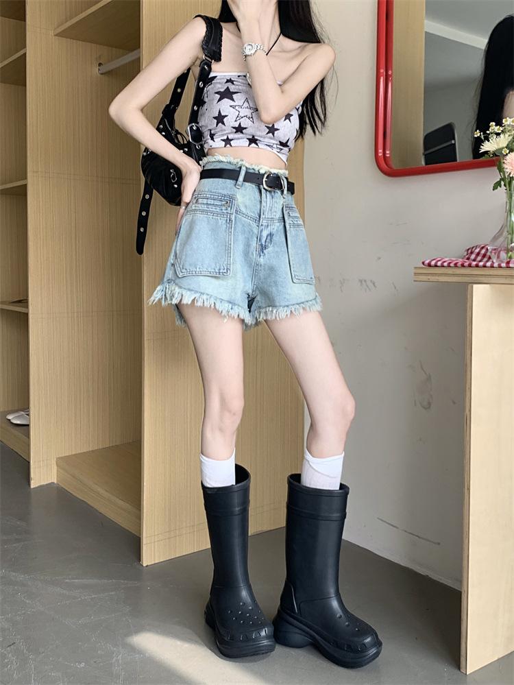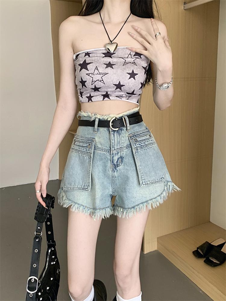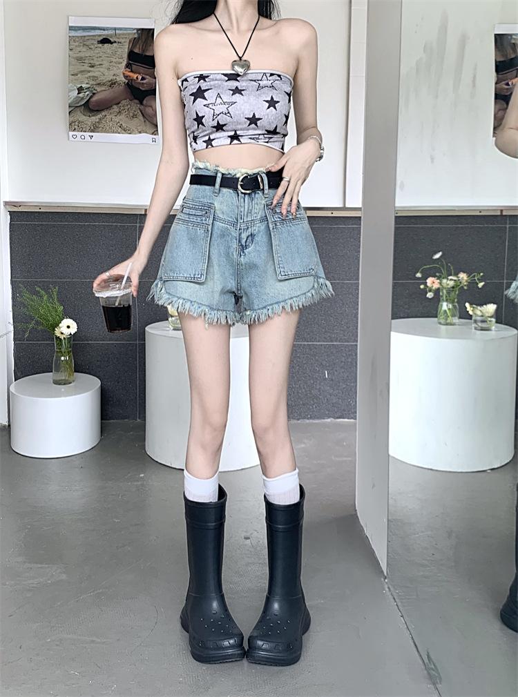 Pantalones cortos vaqueros de cintura alta para mujer, verano 2024, nuevos pantalones cortos adelgazantes con borlas y palabra A para Spice Girls.