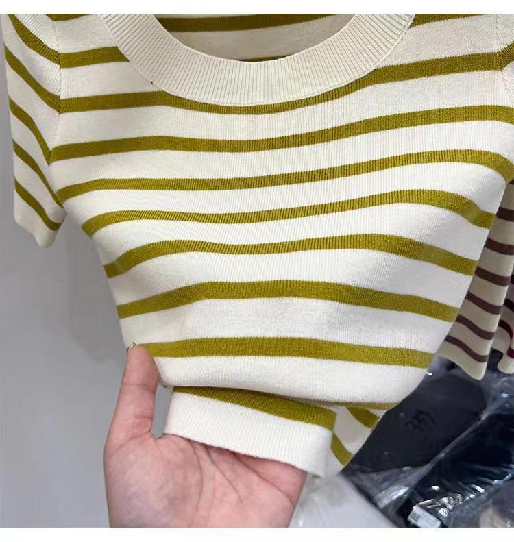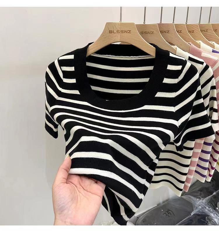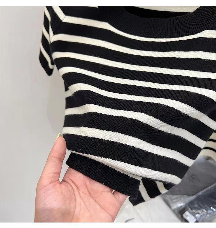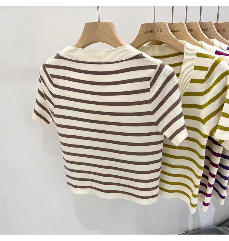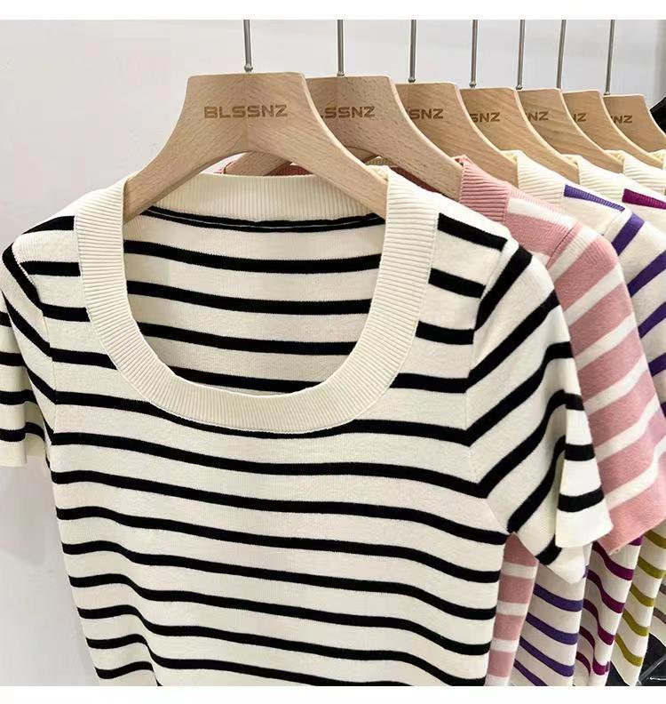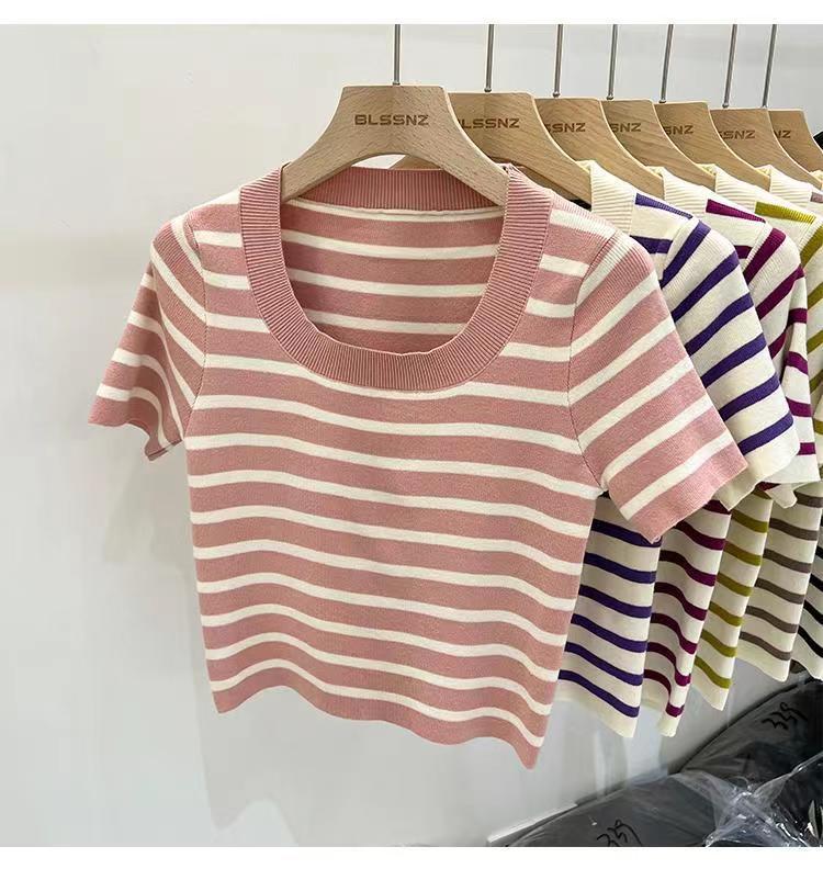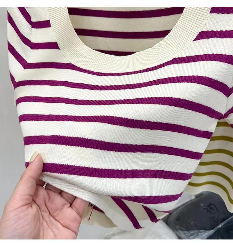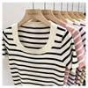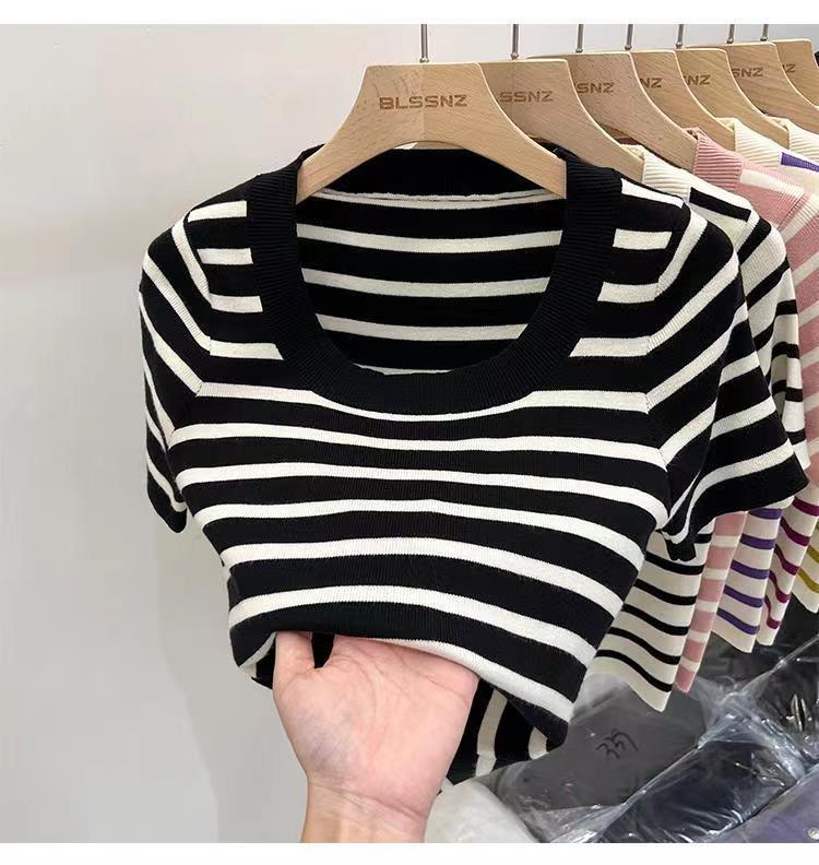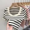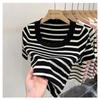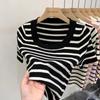 Suéter a rayas de manga corta para mujer, verano 2023, nuevo diseño único y elegante, cuello cuadrado, top corto