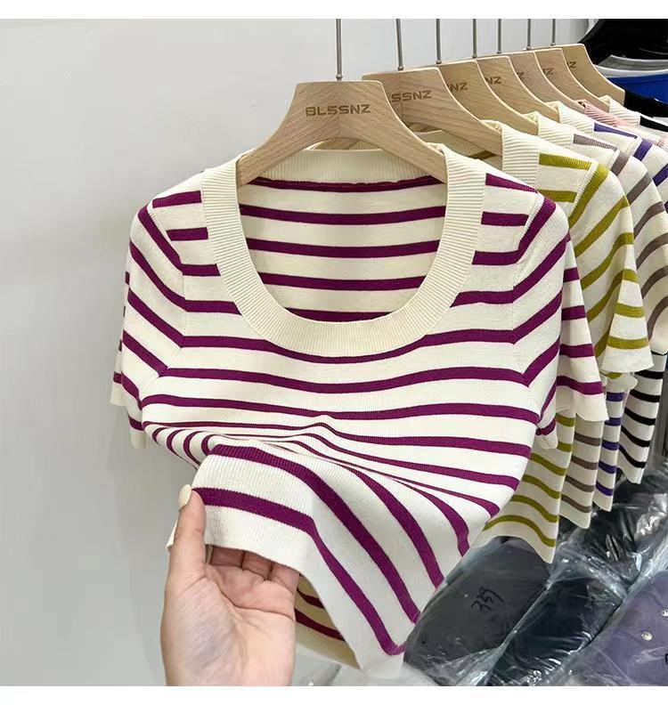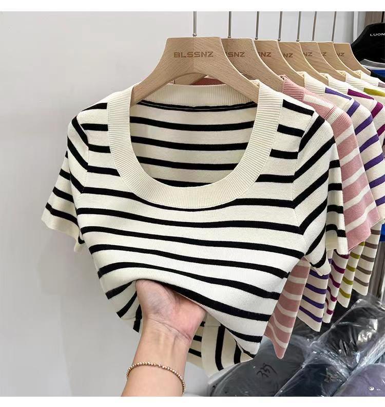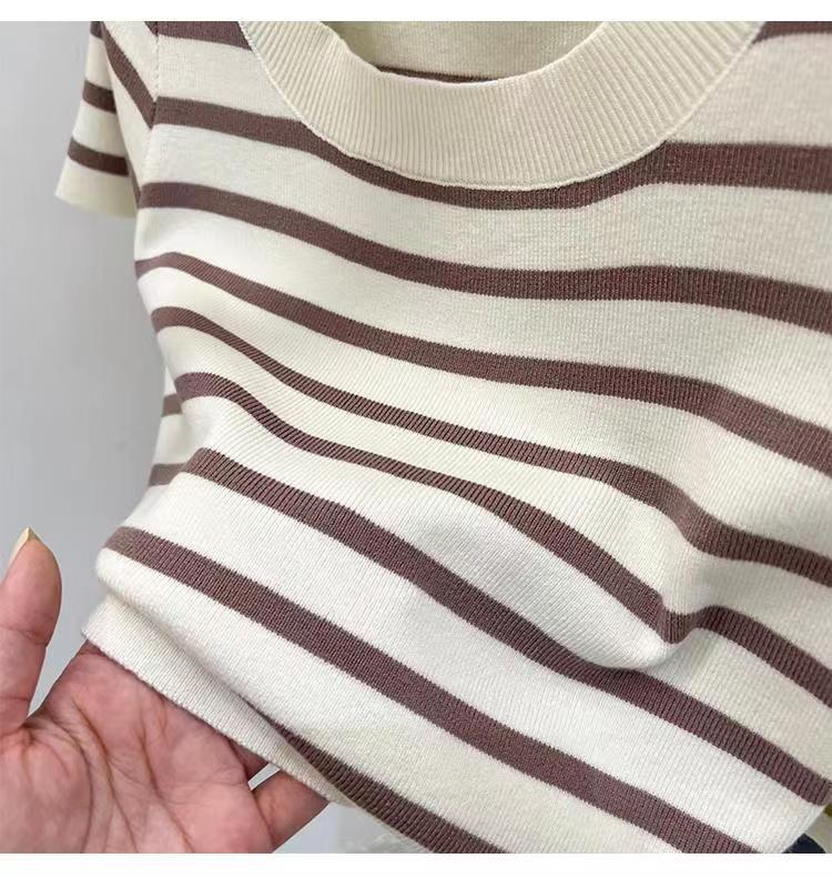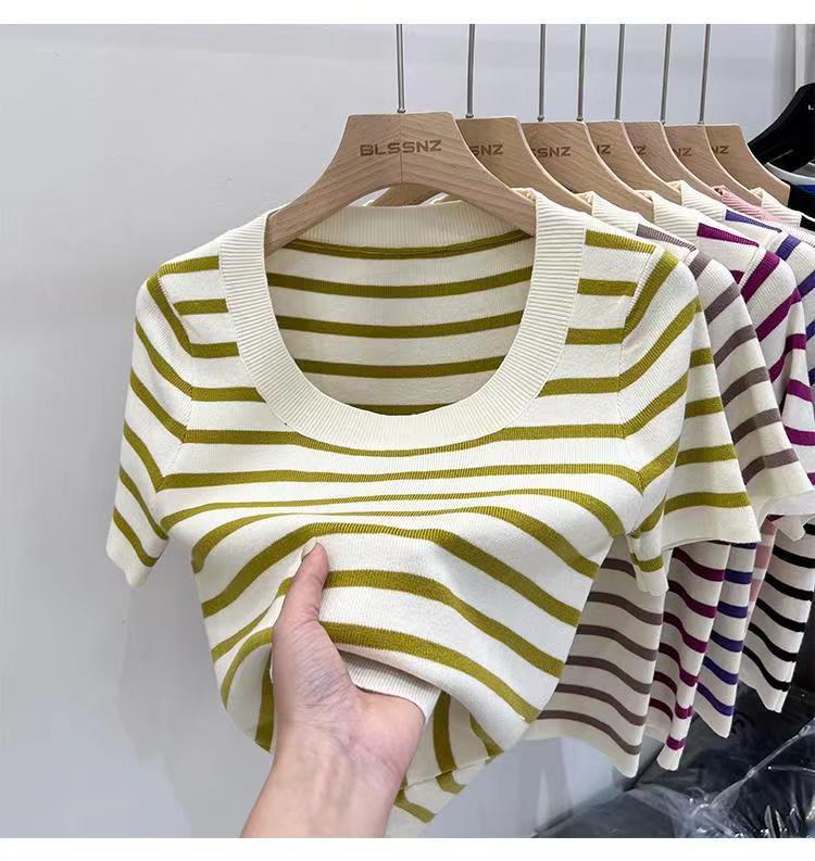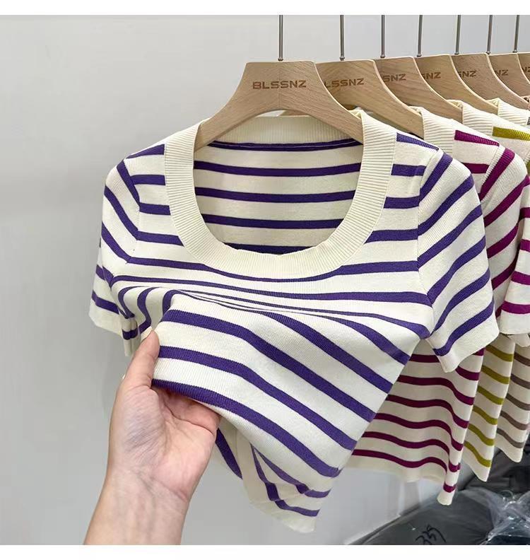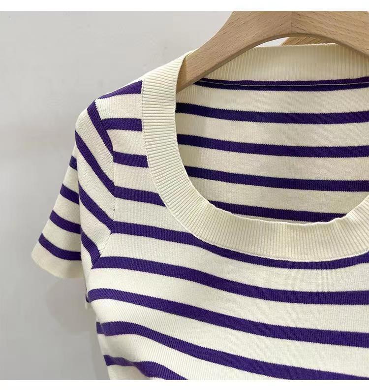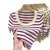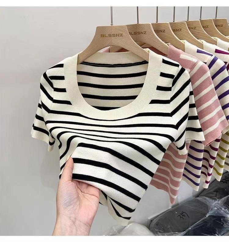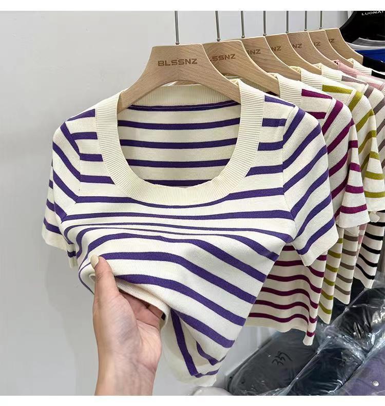 Suéter a rayas de manga corta para mujer, verano 2023, nuevo diseño único y elegante, cuello cuadrado, top corto