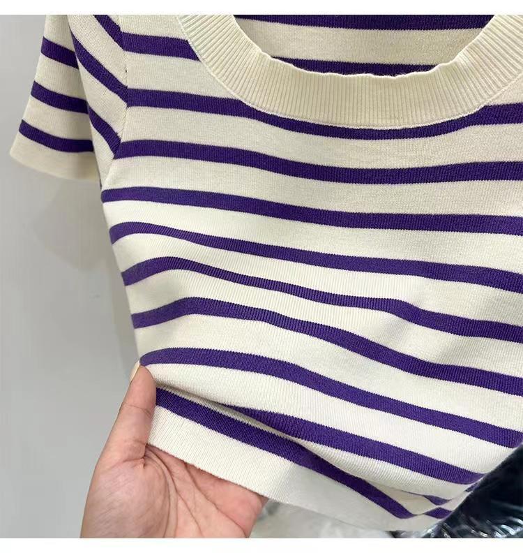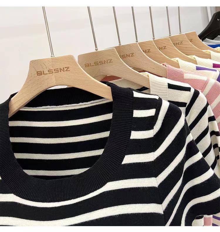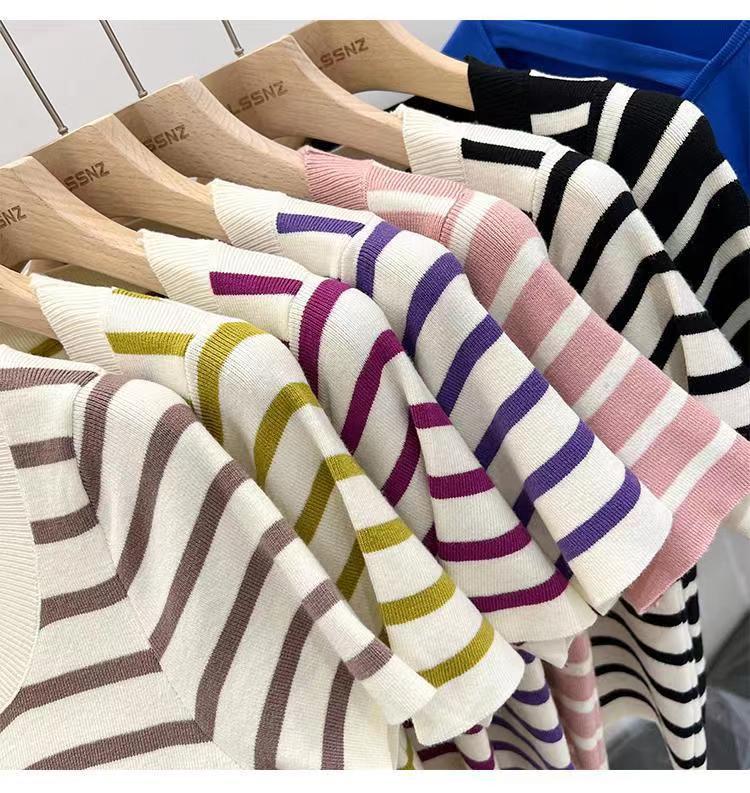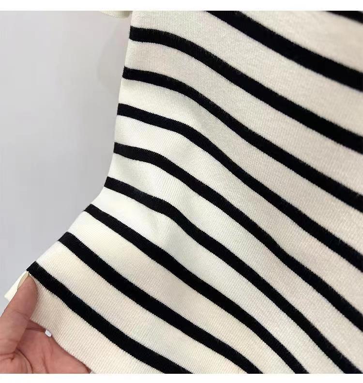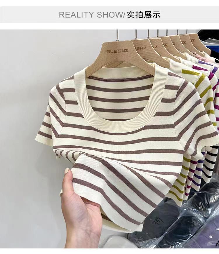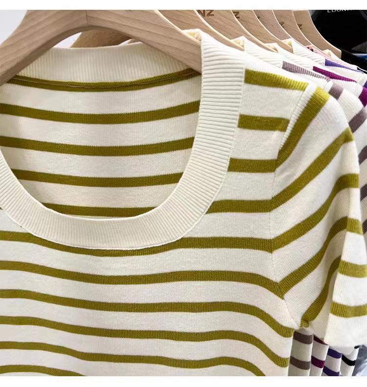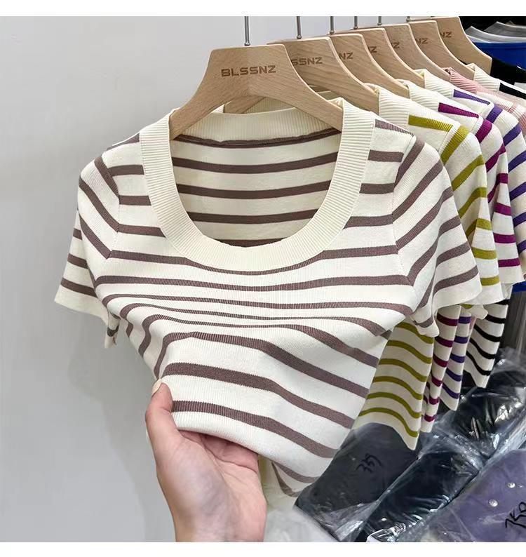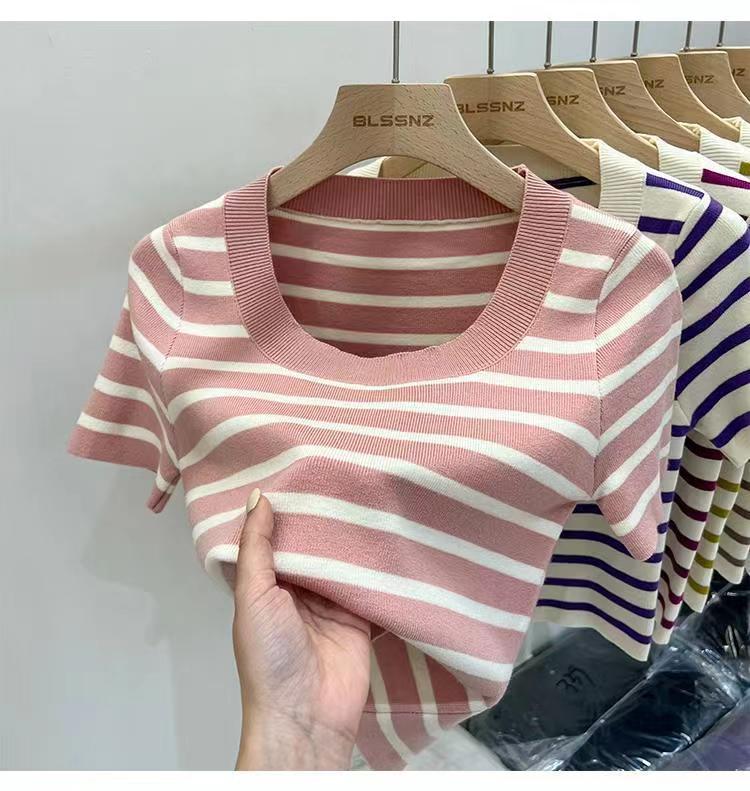 Suéter a rayas de manga corta para mujer, verano 2023, nuevo diseño único y elegante, cuello cuadrado, top corto