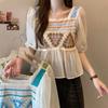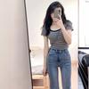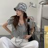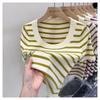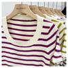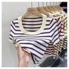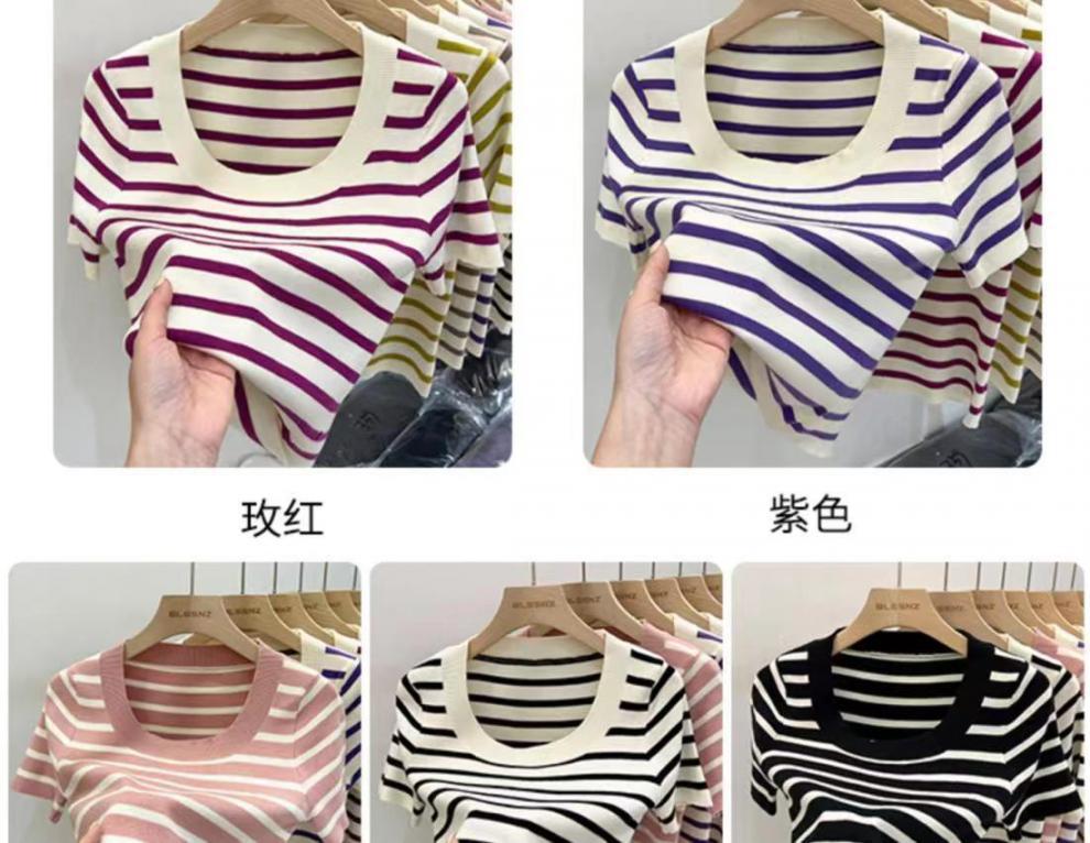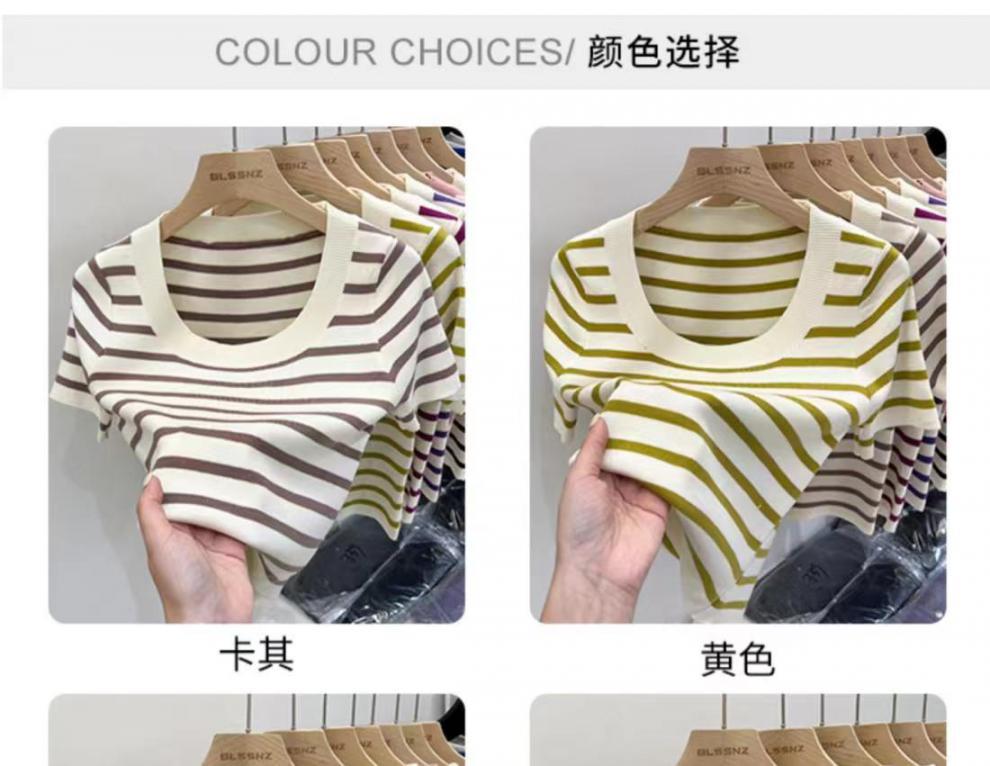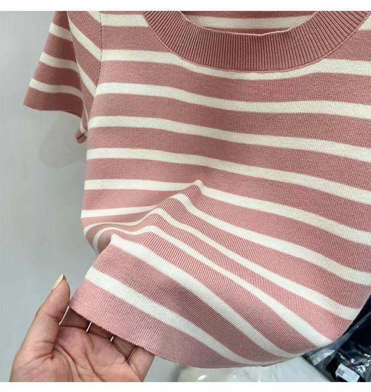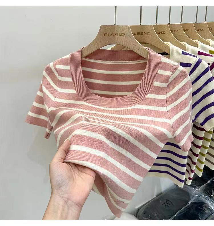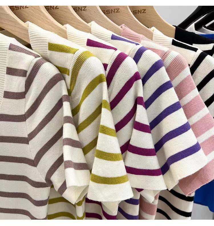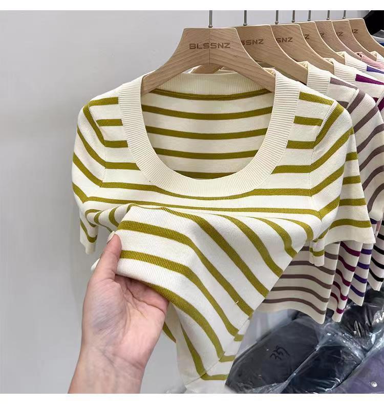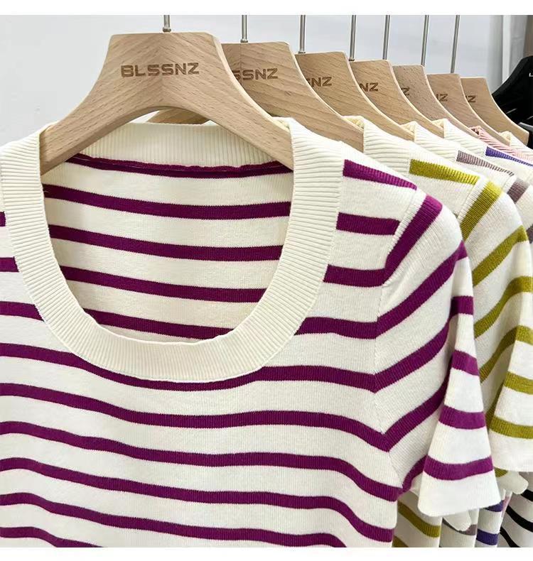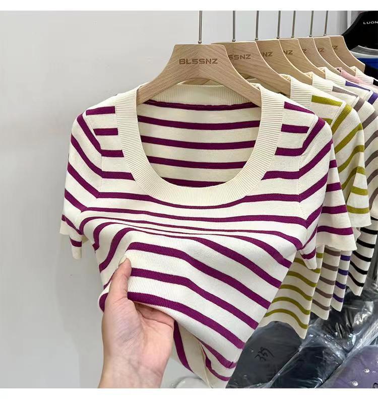 Suéter a rayas de manga corta para mujer, verano 2023, nuevo diseño único y elegante, cuello cuadrado, top corto