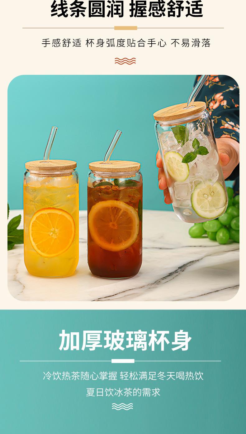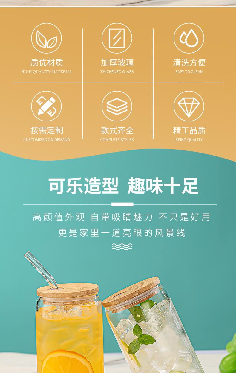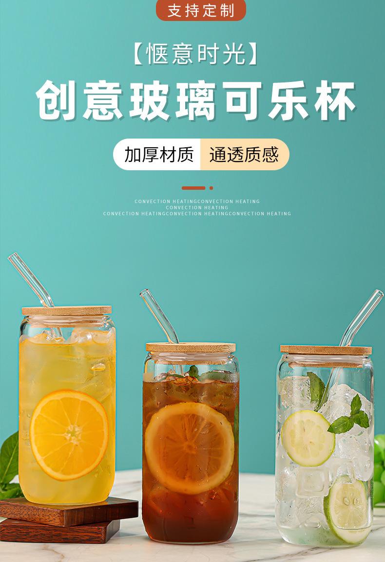 Vaso de vidrio de borosilicato con tapa de bambú, vaso para jugo con pajita, vaso de Coca-Cola de vidrio transparente de alta apariencia, estilo creativo ins