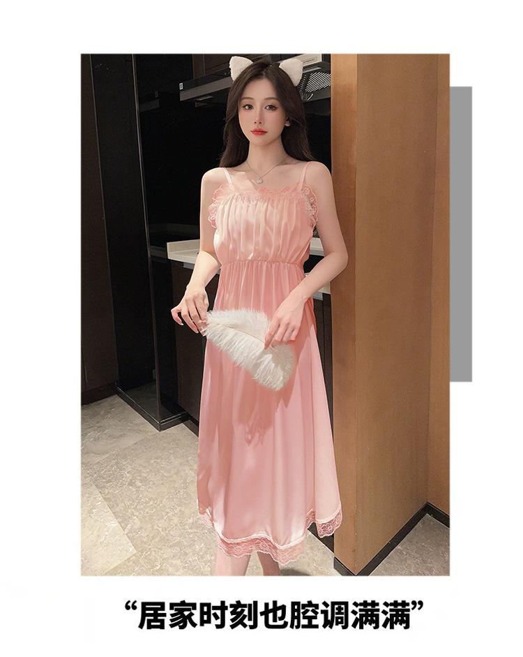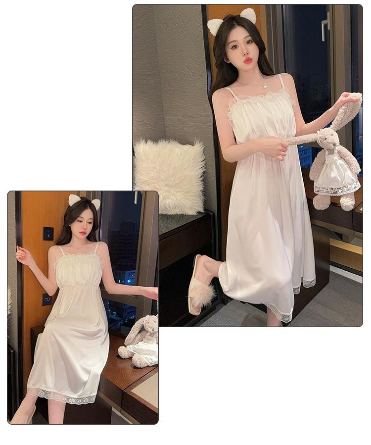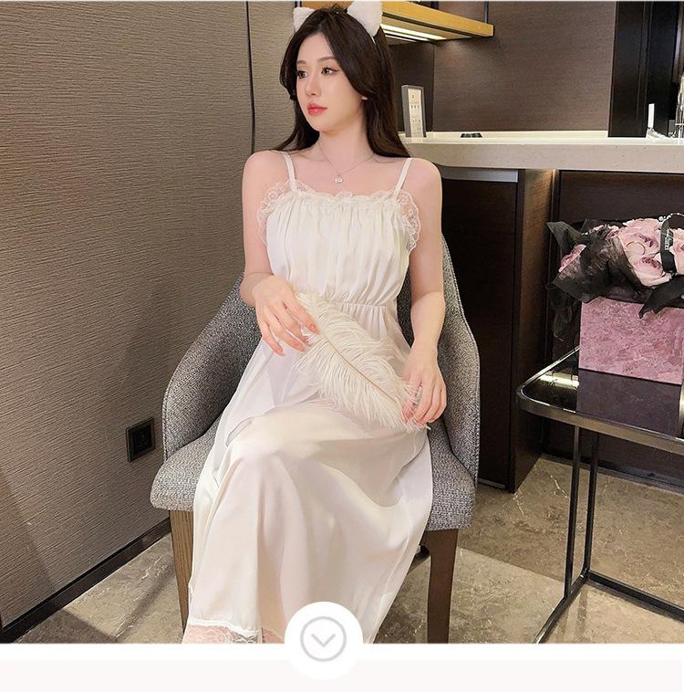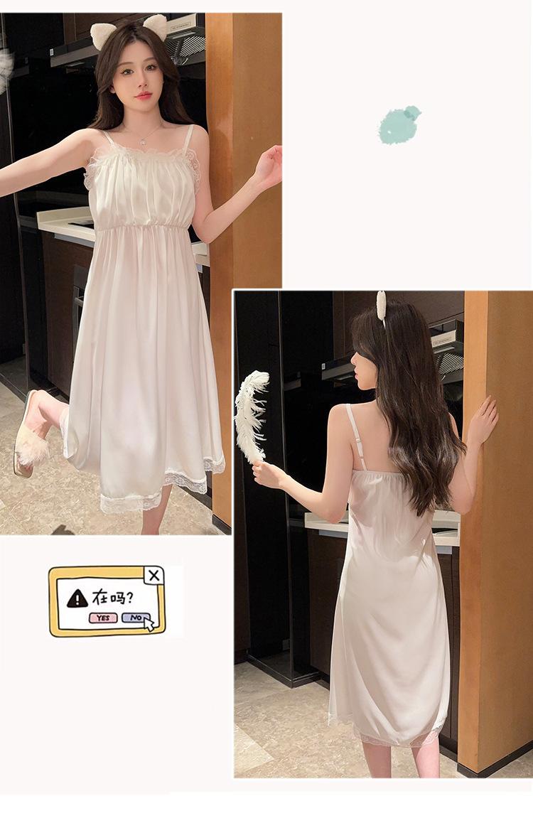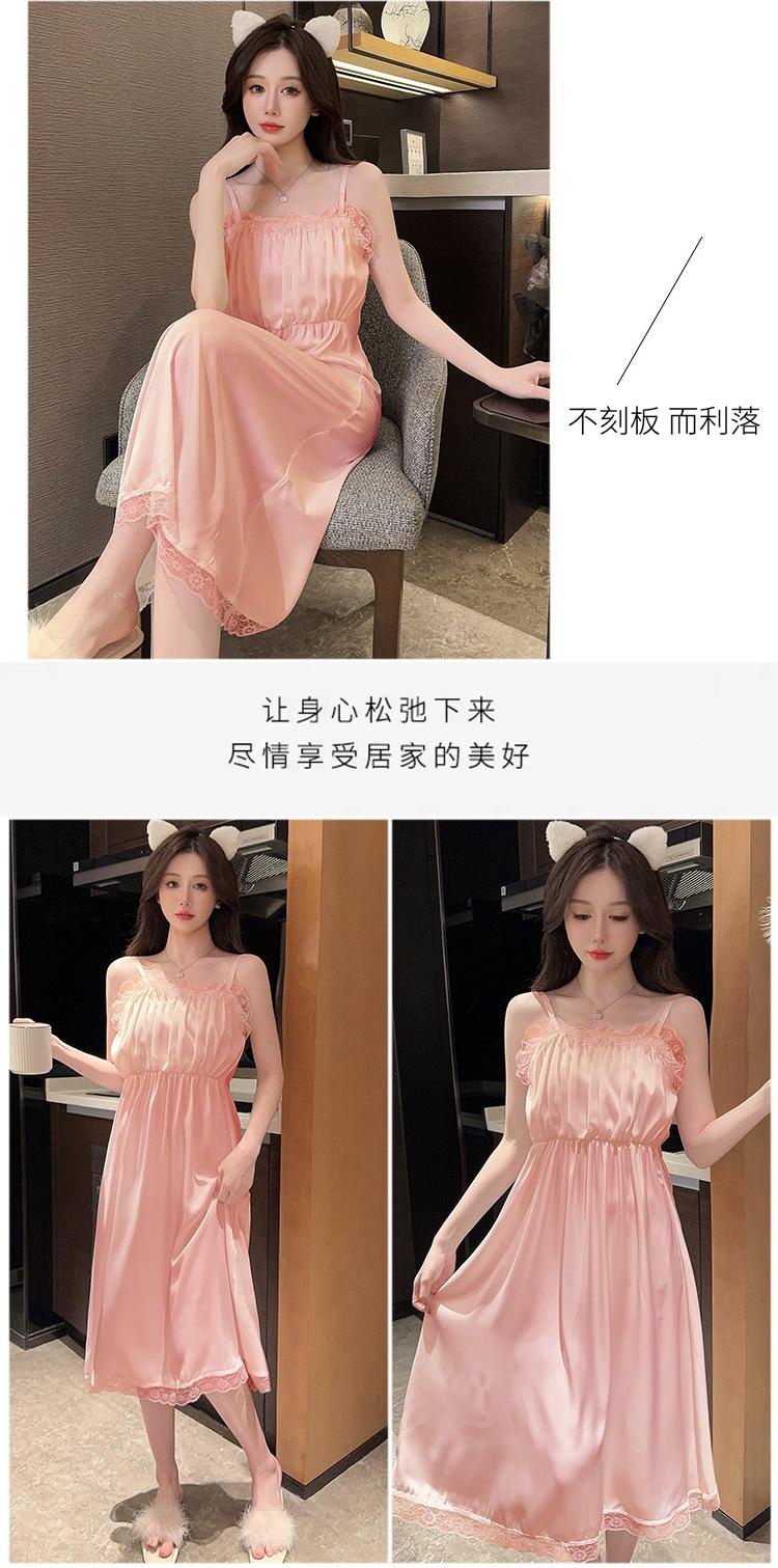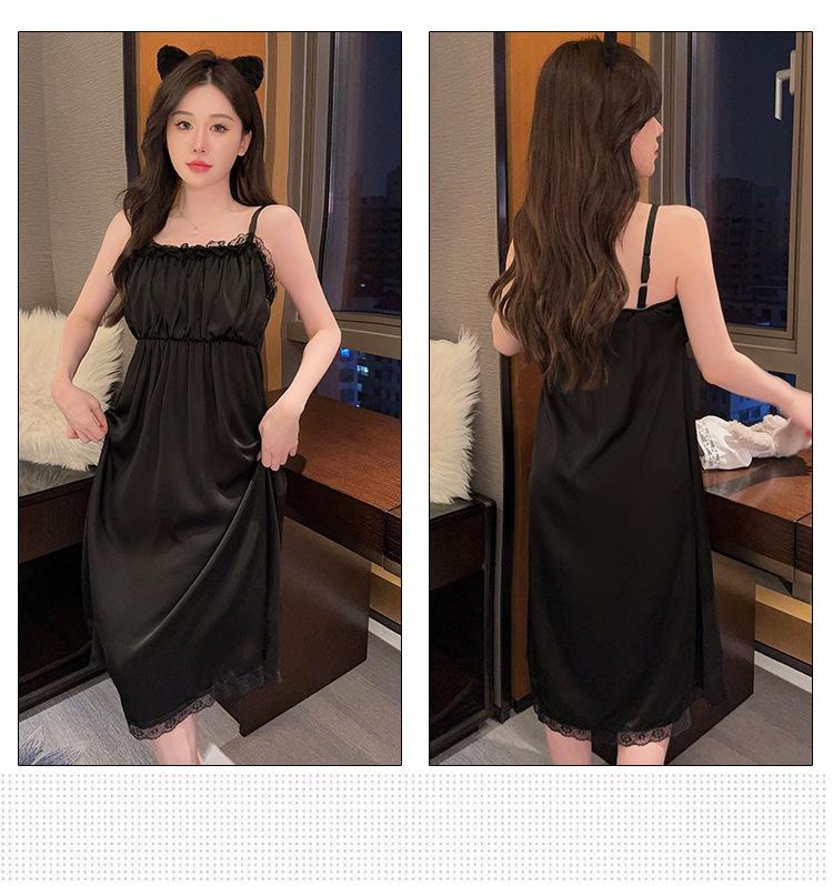 Camisón de verano 2024 para mujer, de seda fina con encaje de color liso, largo medio, holgado, para uso en casa
