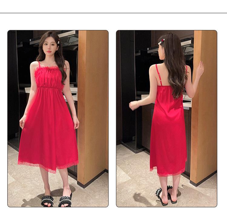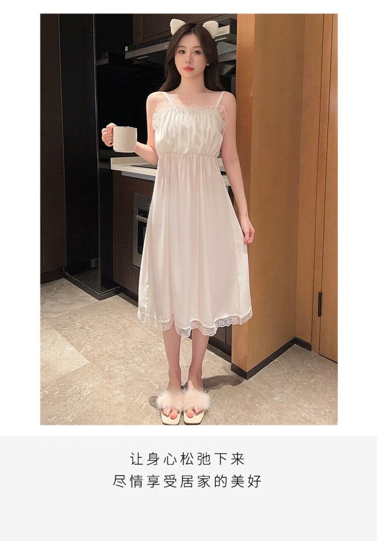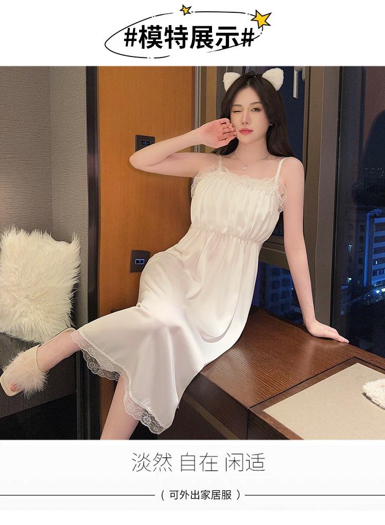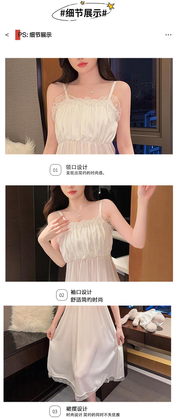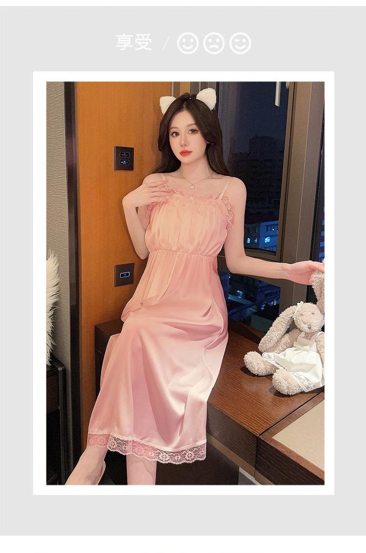 Camisón de verano 2024 para mujer, de seda fina con encaje de color liso, largo medio, holgado, para uso en casa