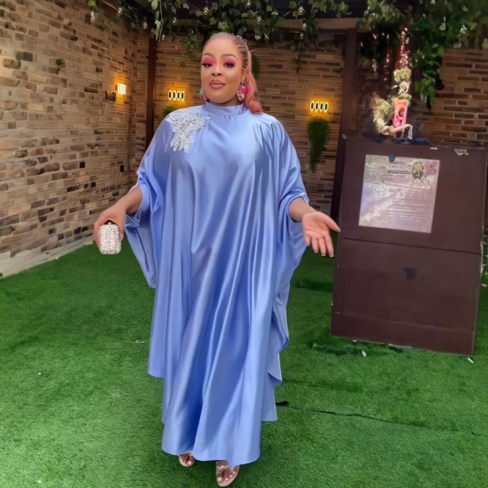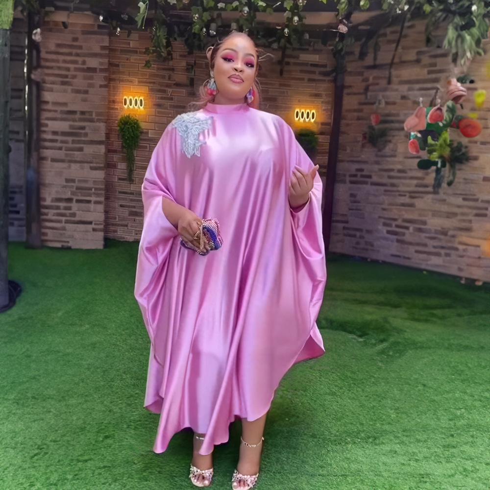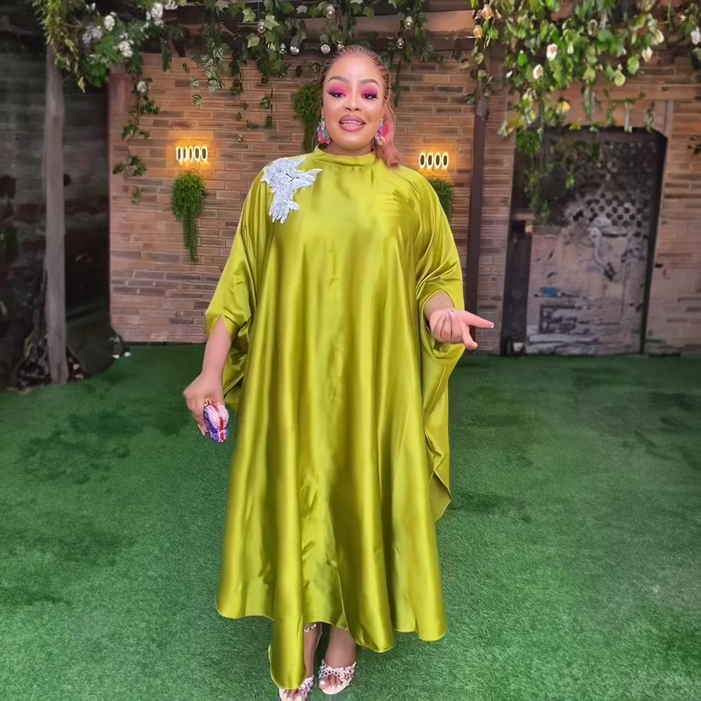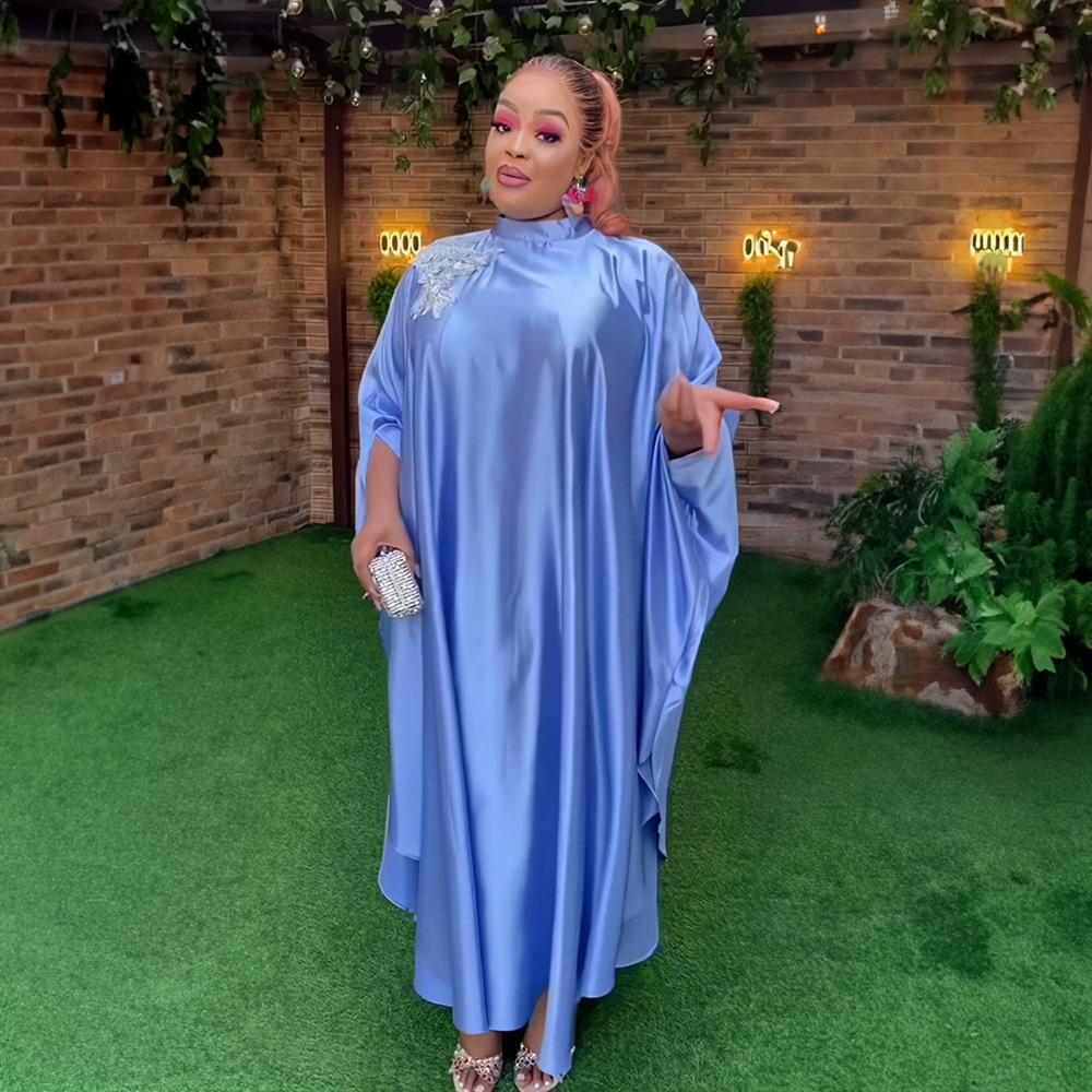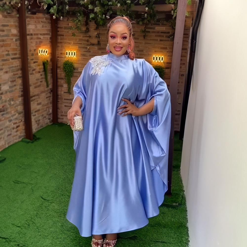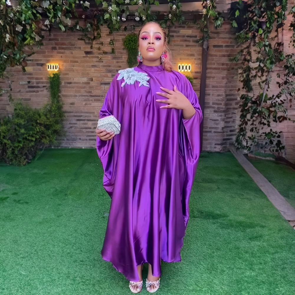 Vestido Africano de Moda y Elegante Talla Grande Rayón Cuello Mao Mangas Murciélago Cuello Mao con Aplicación de Diamantes Falda con Dobladillo Grande
