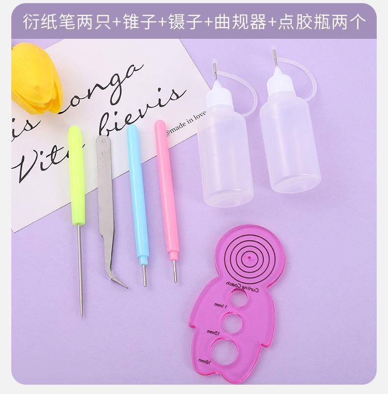 1 light blue pen +1 light chalk + pink curved gauge + Tweezers +2 Dispensing Bottles + awl color random