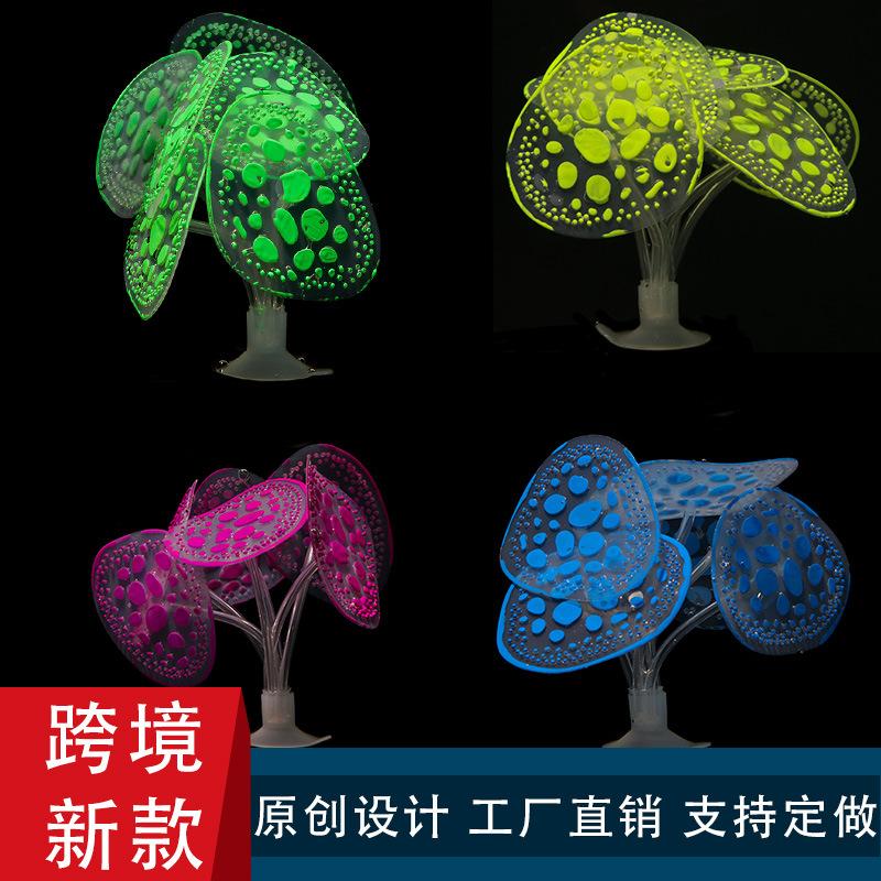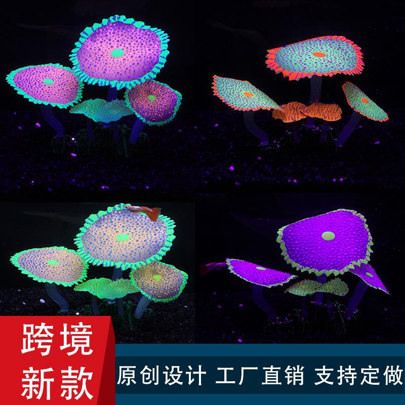 Decoración de paisaje de pecera transfronteriza de silicona suave fluorescente hongo marino coral plástico plantas de agua falsas simulación plantas de agua