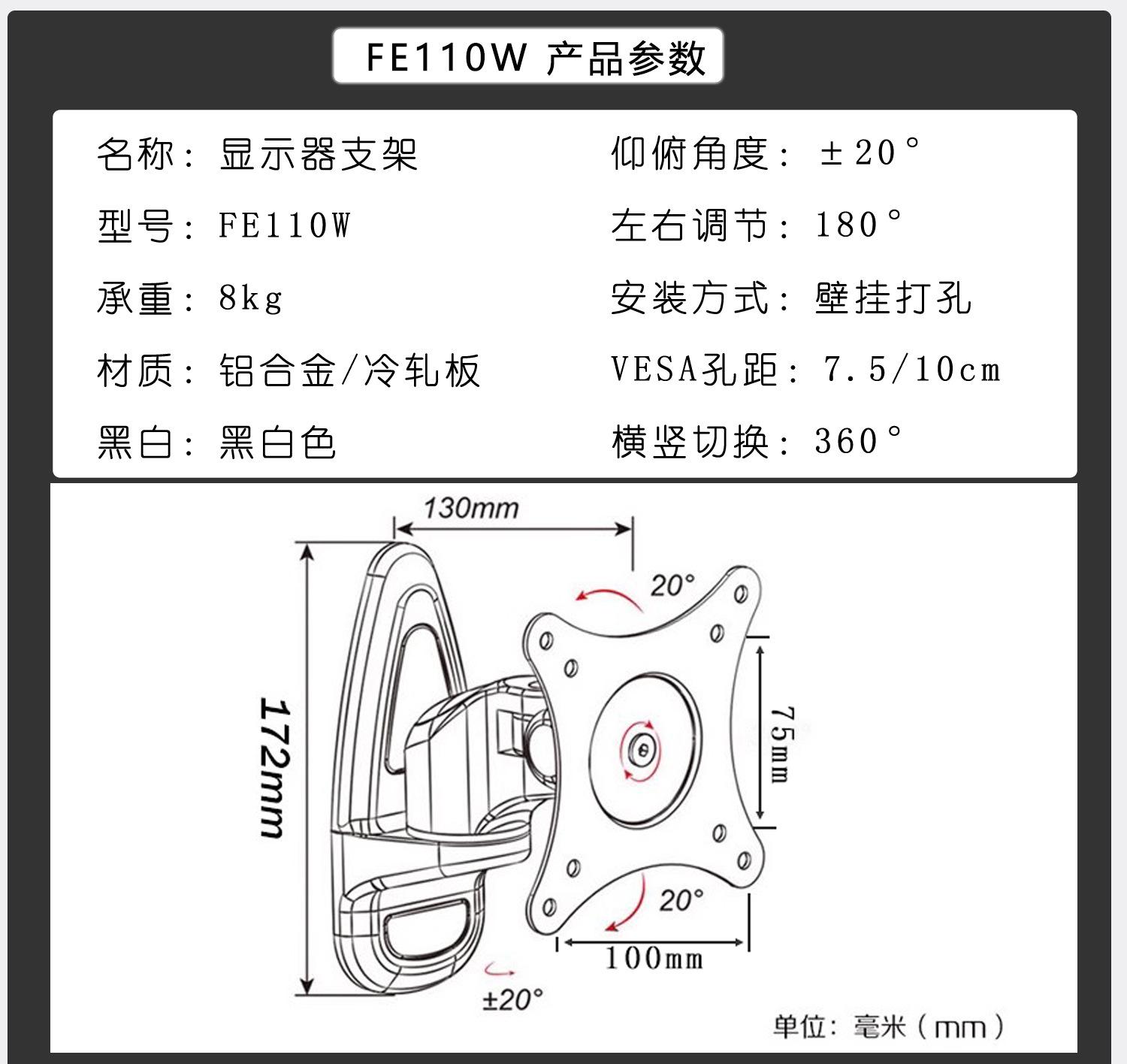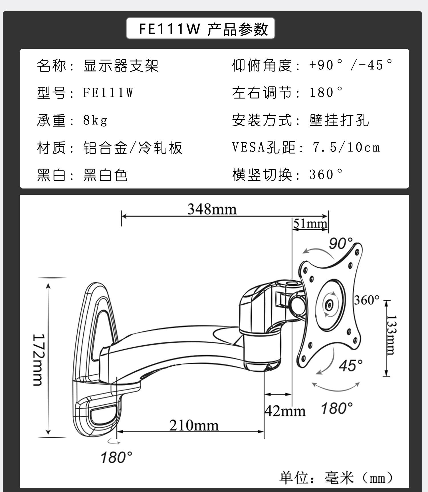 FE111W black one-section arm