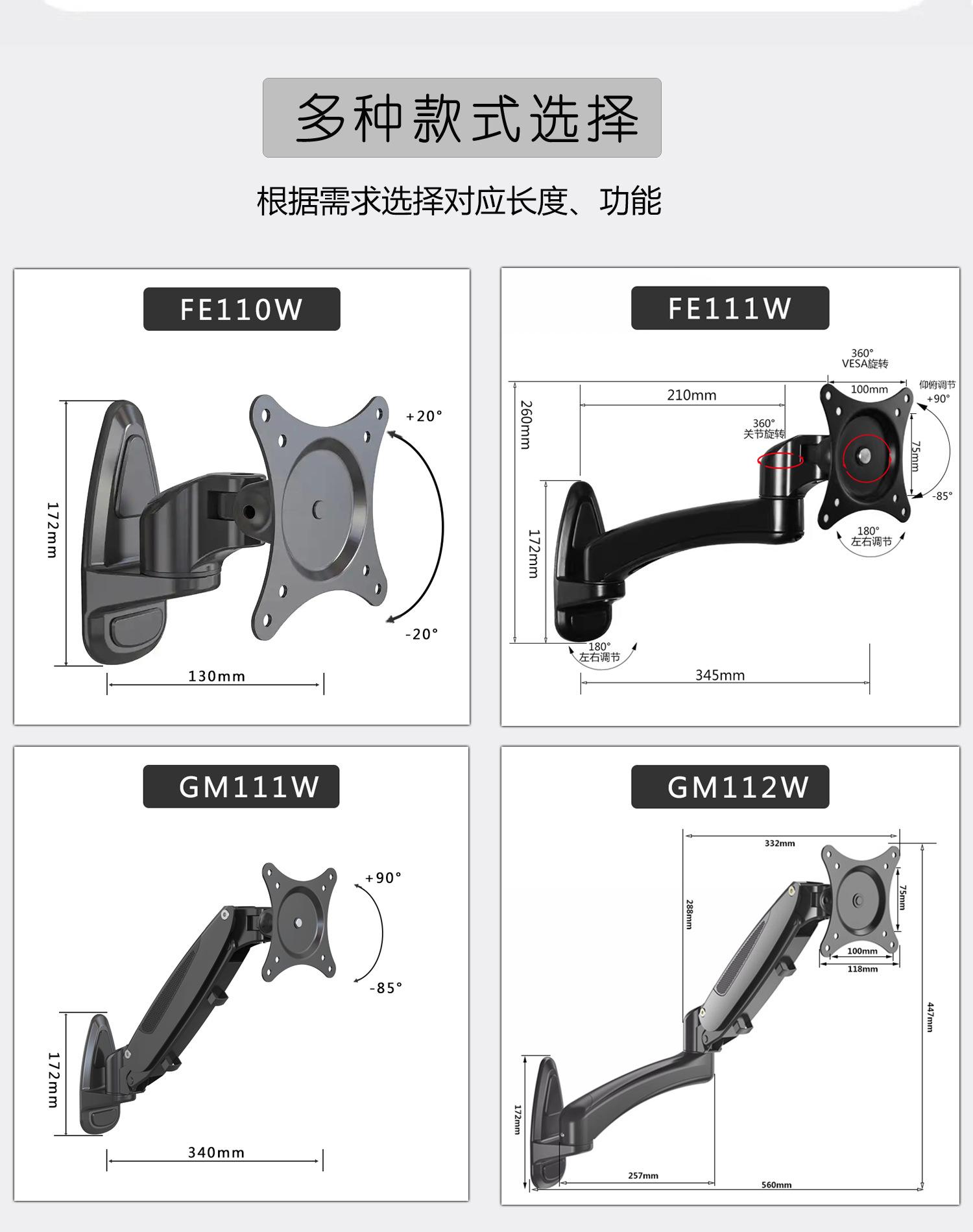 FE110W black armless, FE111W black one-section arm, GM111W black pressure one-section arm, GM112W black pressure two-section arm