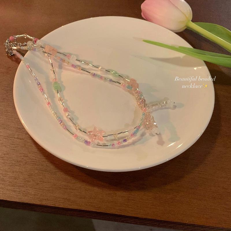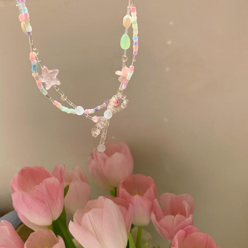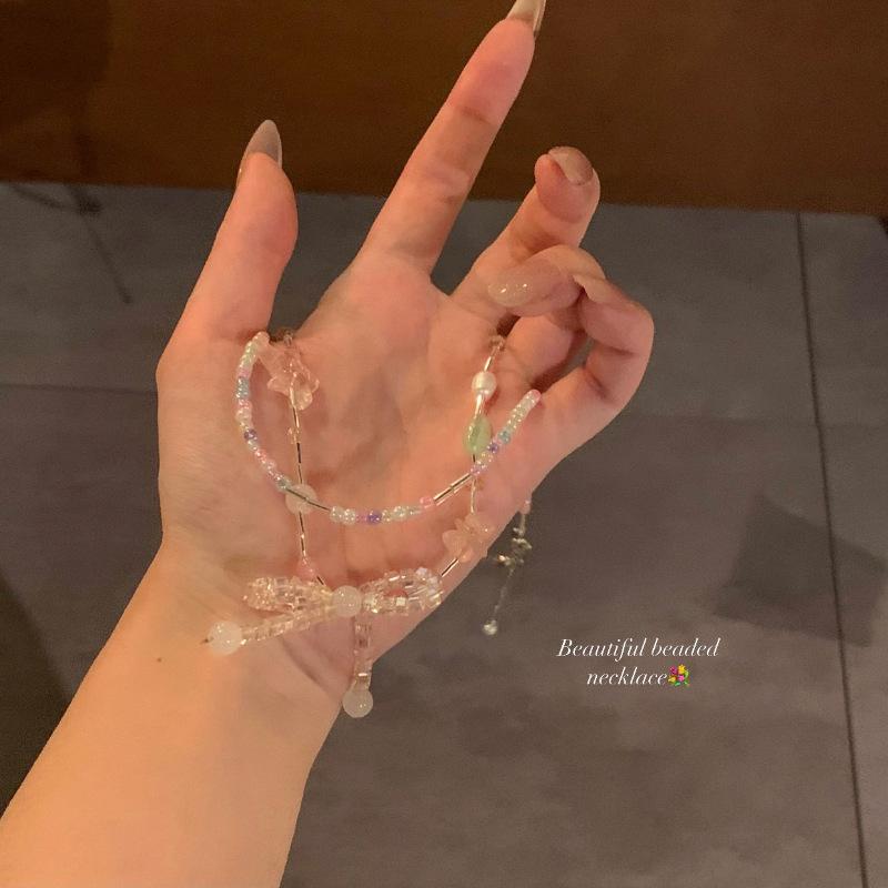 Collar de cuentas con lazo colorido hecho a mano de primavera, collar de flores con perlas de cristal, cadena de clavícula de nicho de lujo ligera para mujer