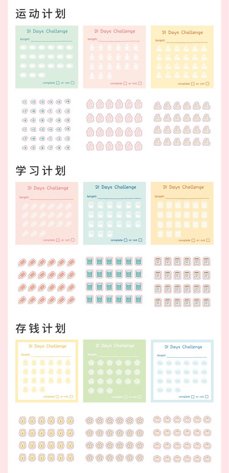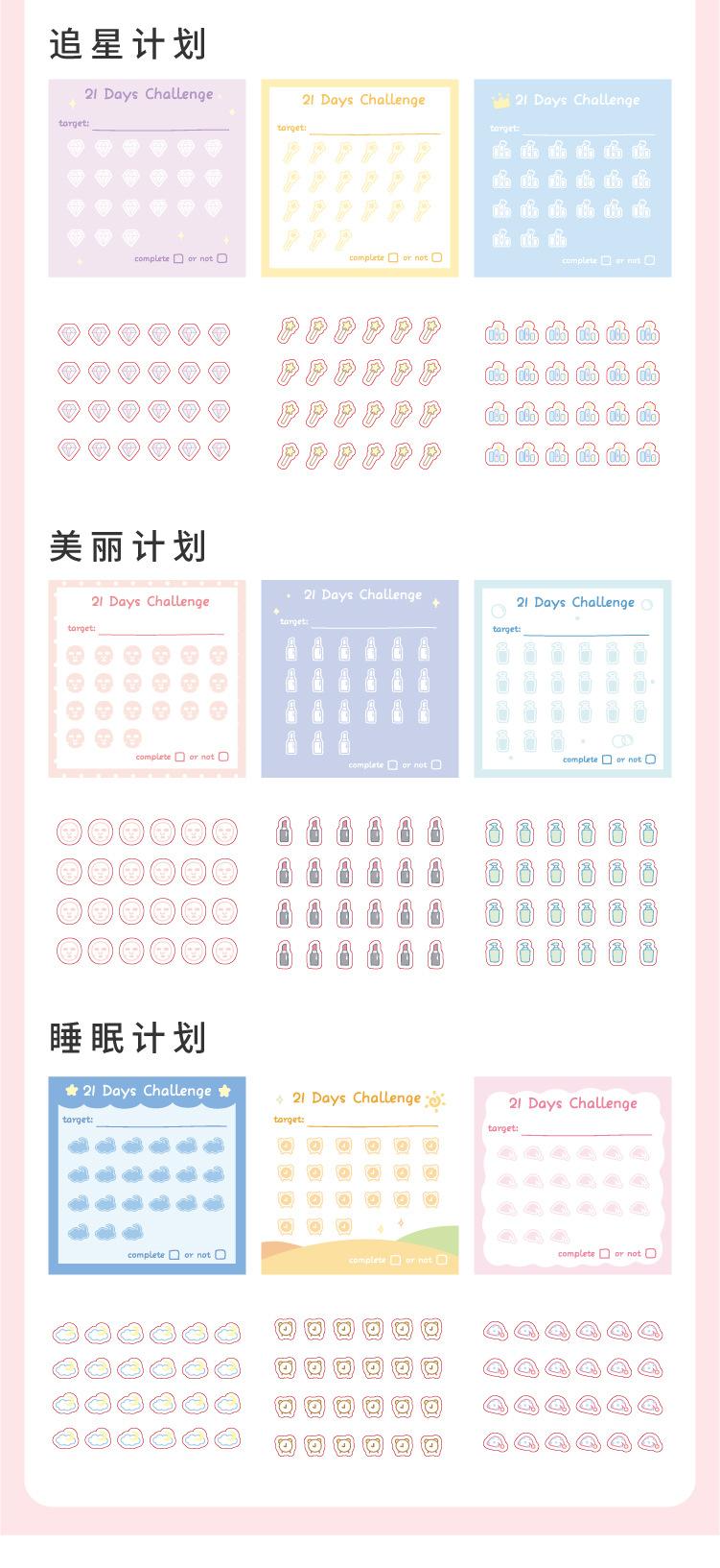 Drinking water plan, Diet Plan, Learning Plan, Sleep Plan, Saving plan, Star Chasing Plan, Exercise Plan, Beautiful Plan