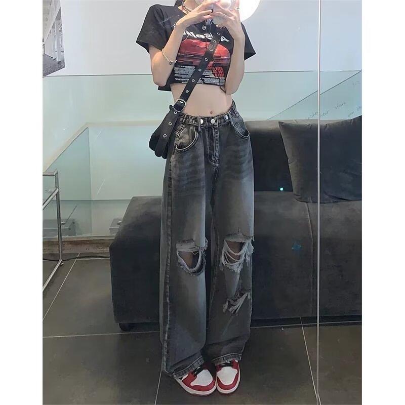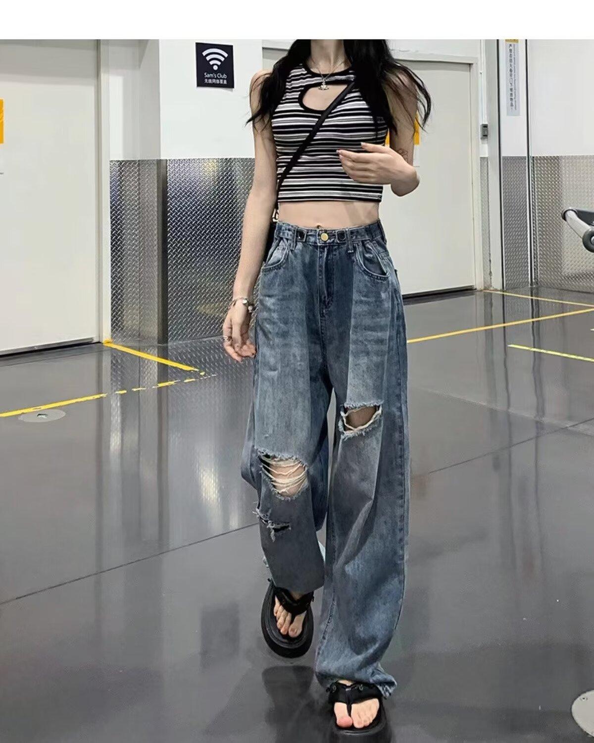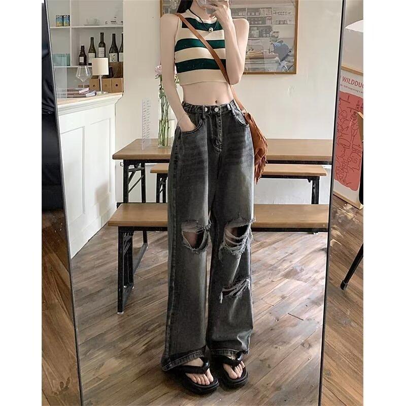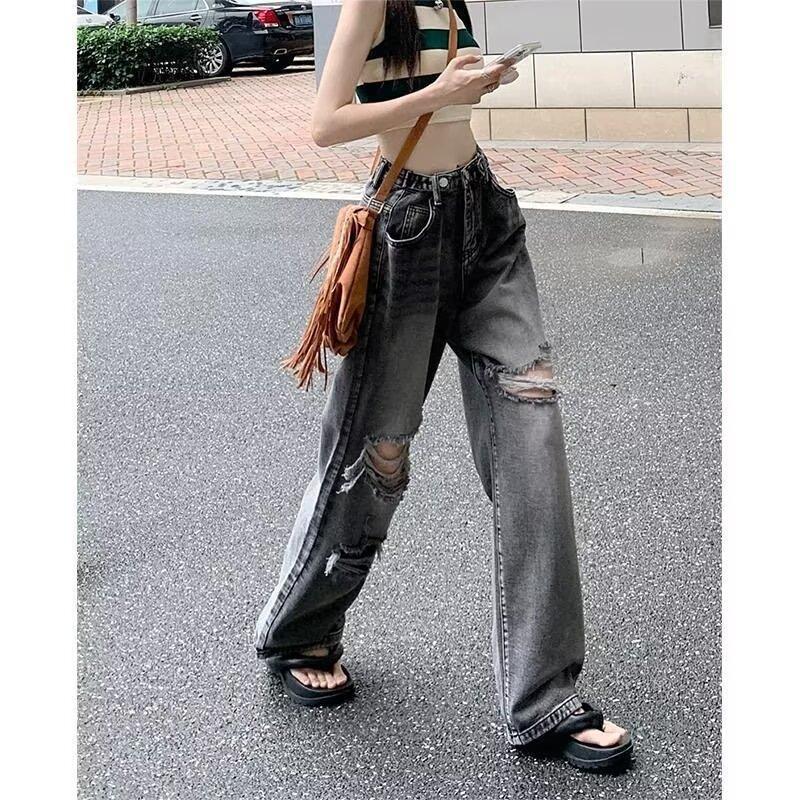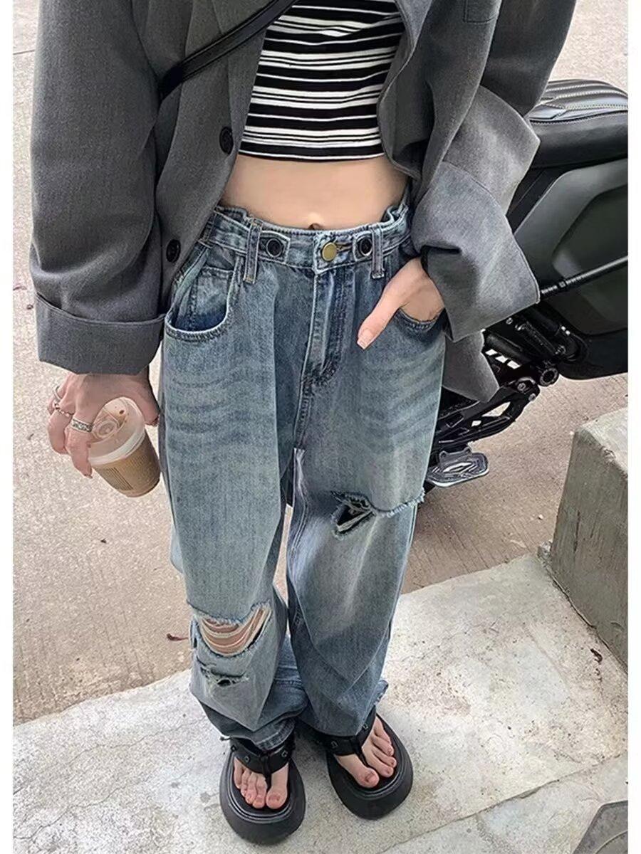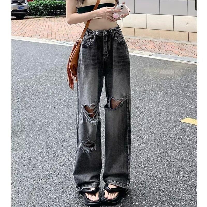 Pantalones vaqueros finos rotos para mujer, novedad de verano 2024, pantalones de cintura alta, rectos, holgados y de pierna ancha, estilo Spice Girl