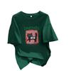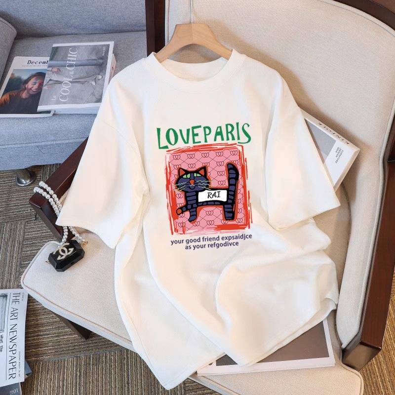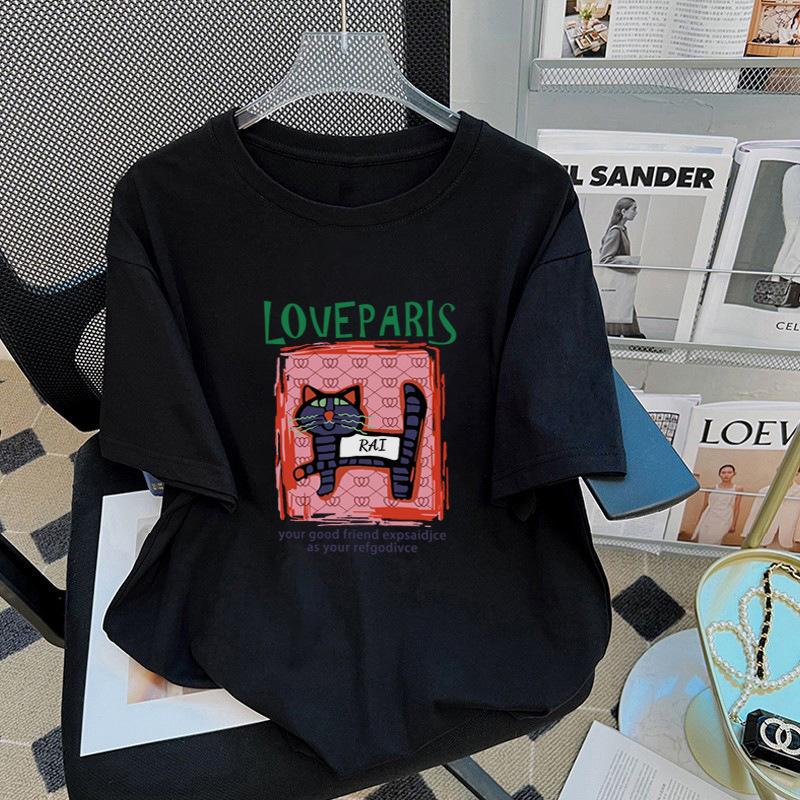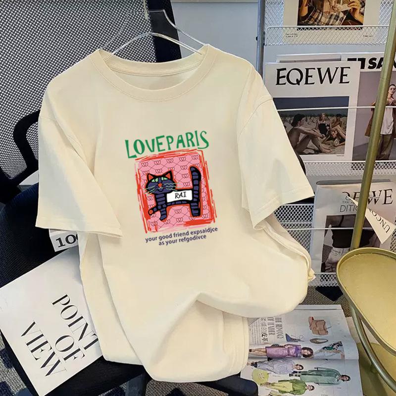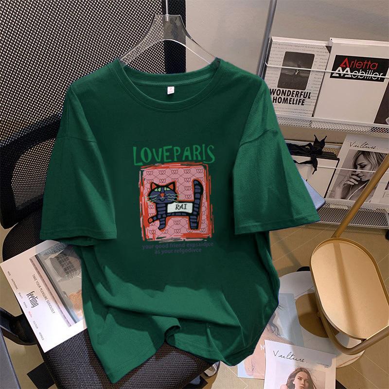 Camiseta informal de manga corta con dibujo de gato para mujer, nueva camiseta de verano con cuello redondo, holgada, de talla grande, con diseño de media manga y nicho.