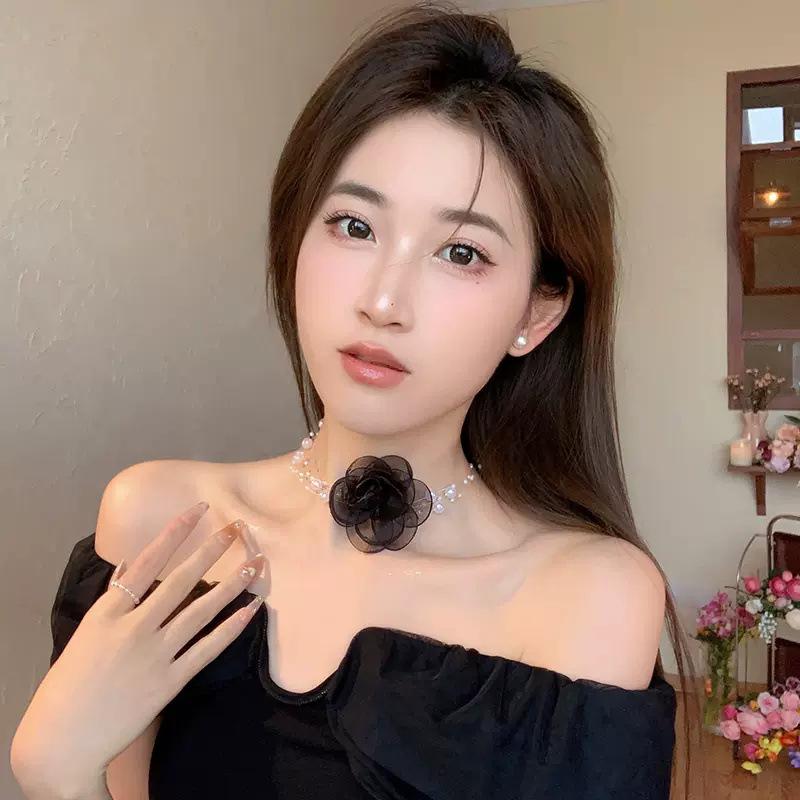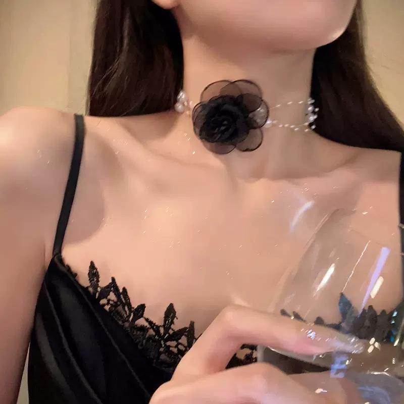 Black Flower Three-layer Pearl Necklace