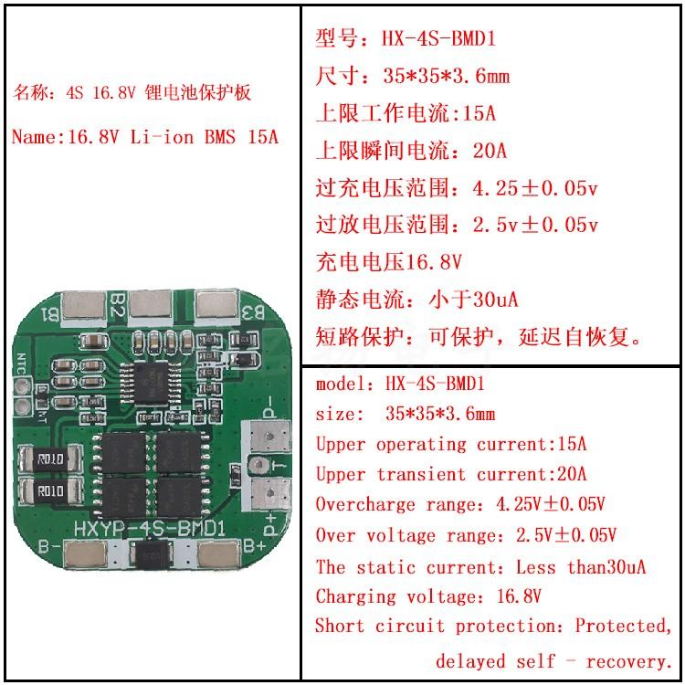 Placa de protección de batería de litio 16.8V18650 de 4 cadenas, 14.8v, protección contra sobrecarga y sobredescarga, protección contra cortocircuitos, 15A-20A.