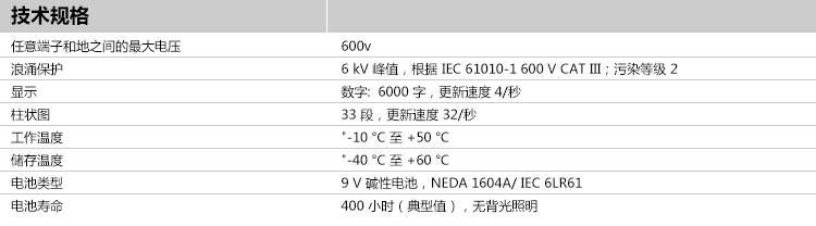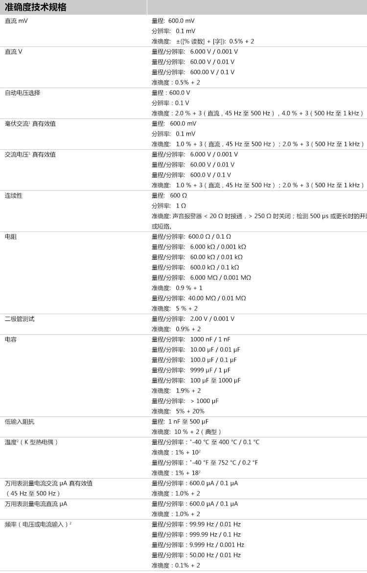 | 1. Todos los rangos de voltaje CA (excepto Auto-V/LoZ) se especifican del 1% al 100% del rango. El rango de inicio de Auto-V/LoZ se especifica en 0.0 V. 2. El error de temperatura (precisión) no incluye el error de la sonda del termopar. 3. La frecuencia es de 5 Hz a 50 kHz para voltaje de CA cuando se acopla CA. La frecuencia es de 45 Hz a 5 kHz para corriente de CA cuando se acopla CC. 4. Rango de temperatura/resolución: -40 °F a 752 °F / 0,2 °F. |