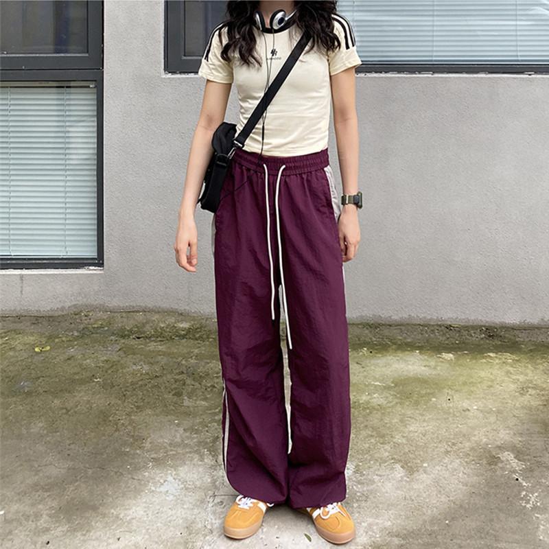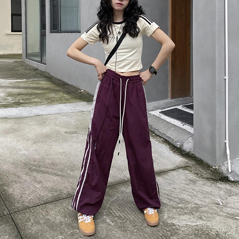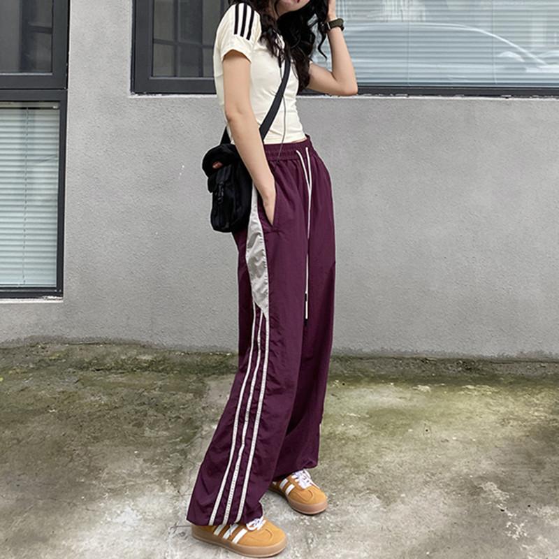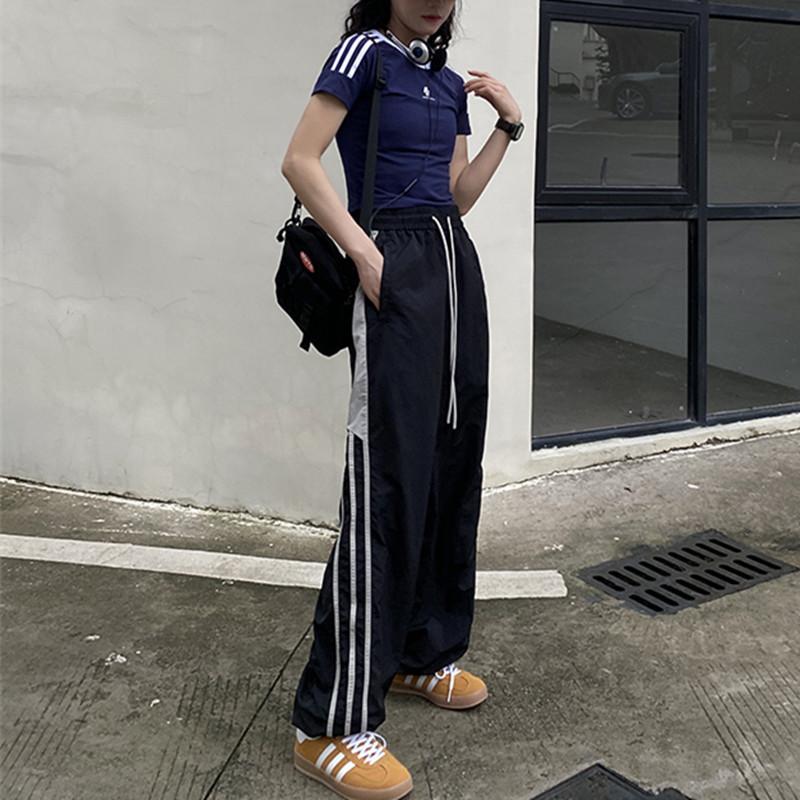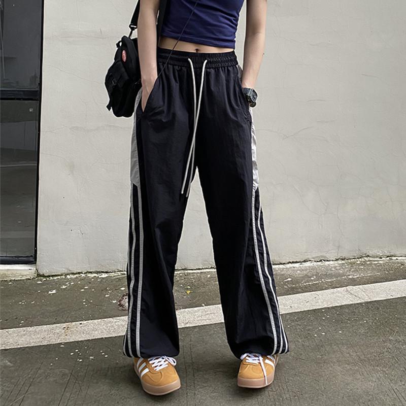 Pantalones casuales de calle americanos para mujer, nuevos pantalones deportivos rectos y sueltos con rayas laterales de otoño, pantalones deportivos de cintura alta con cordón, moda