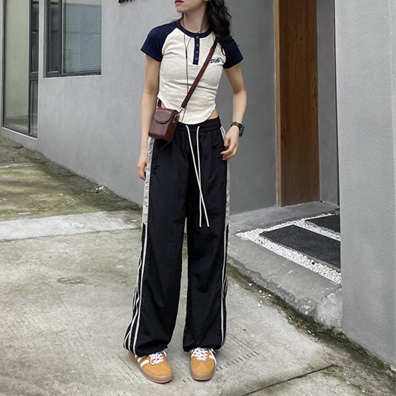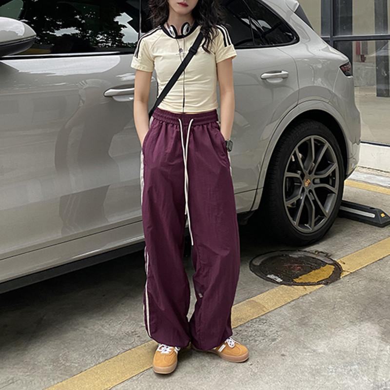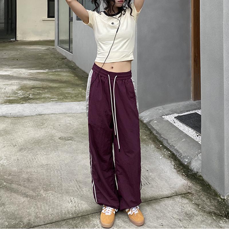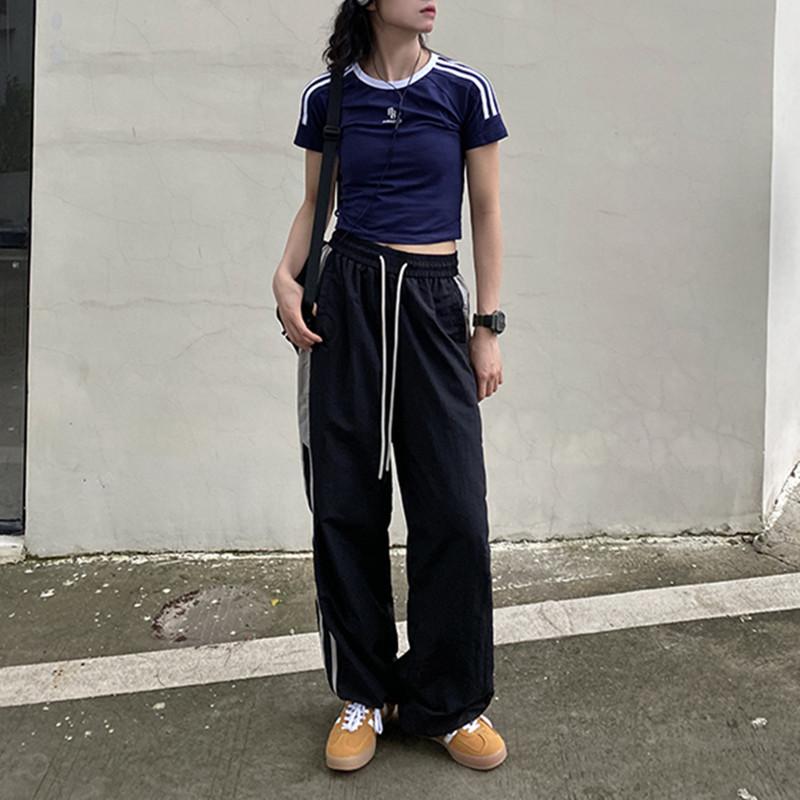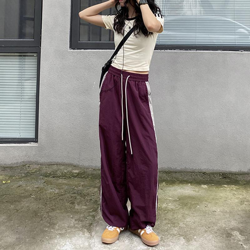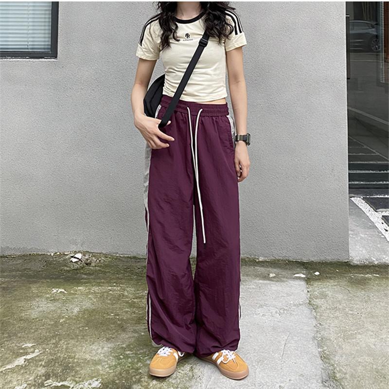 Pantalones casuales de calle americanos para mujer, nuevos pantalones deportivos rectos y sueltos con rayas laterales de otoño, pantalones deportivos de cintura alta con cordón, moda