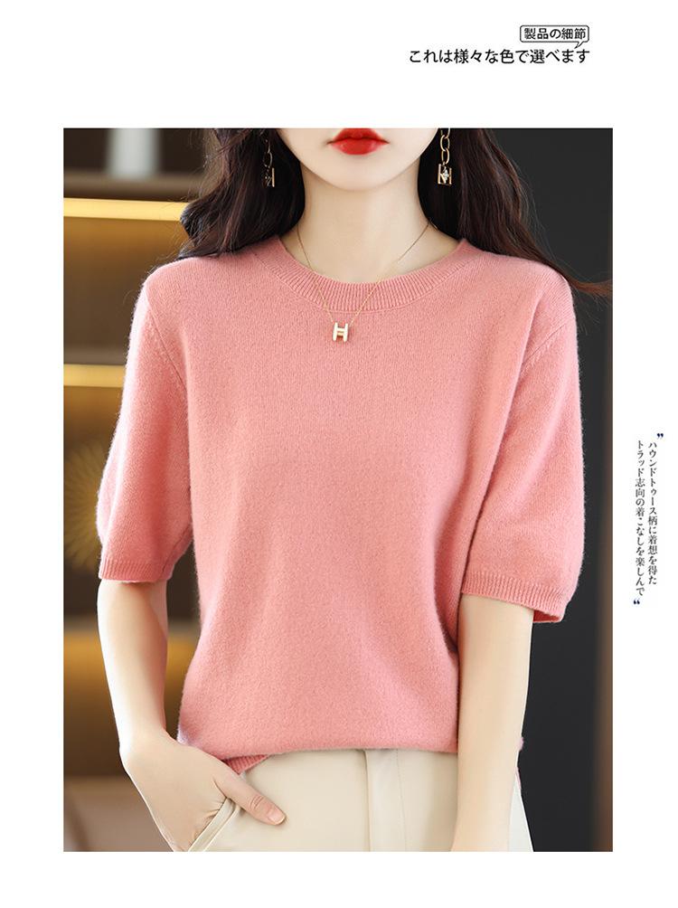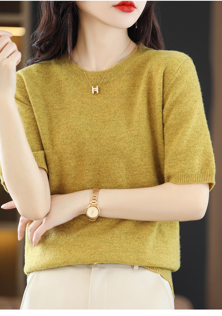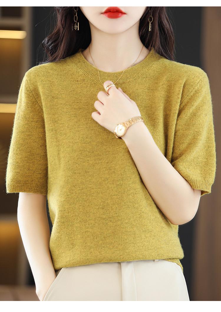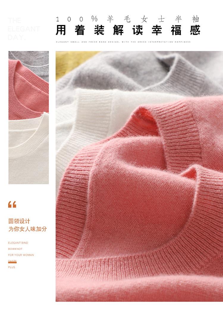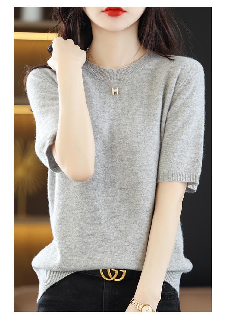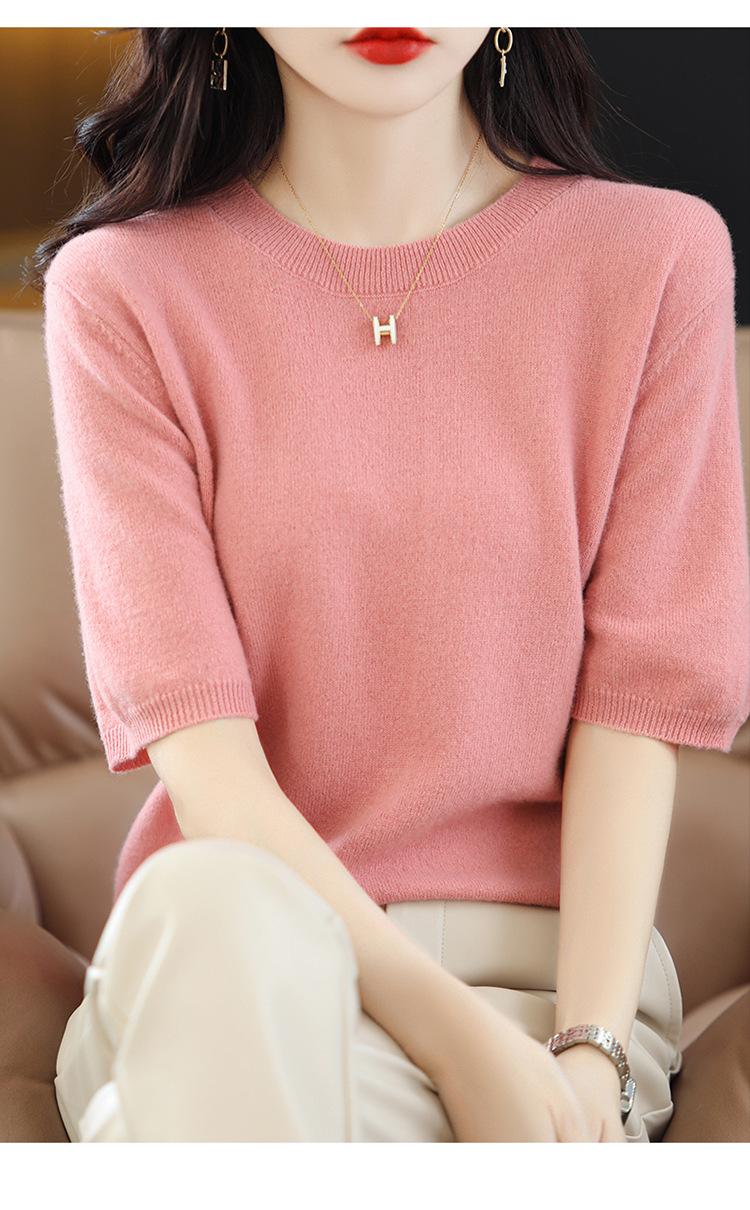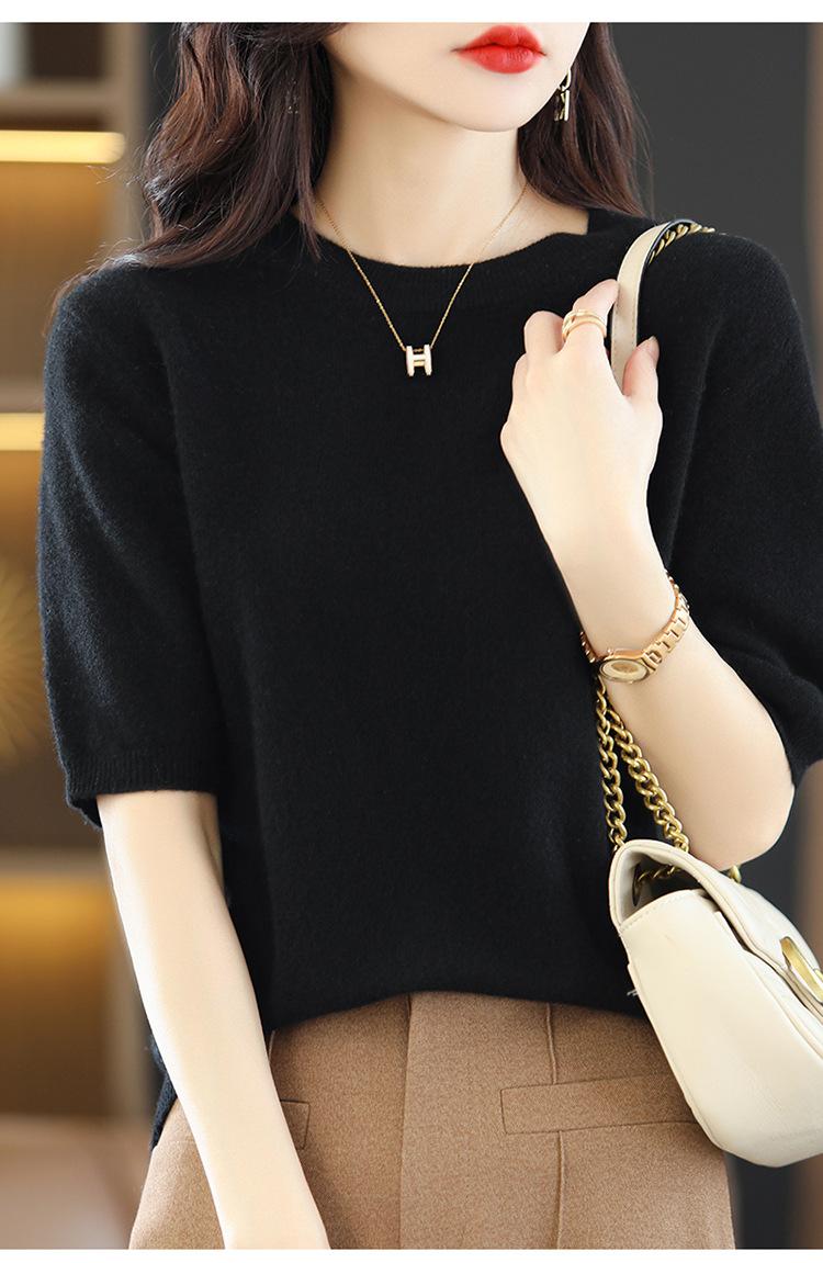 Suéter de primavera para mujer 100% lana pura cuello redondo manga media color sólido manga corta top de cachemira de punto para fondo