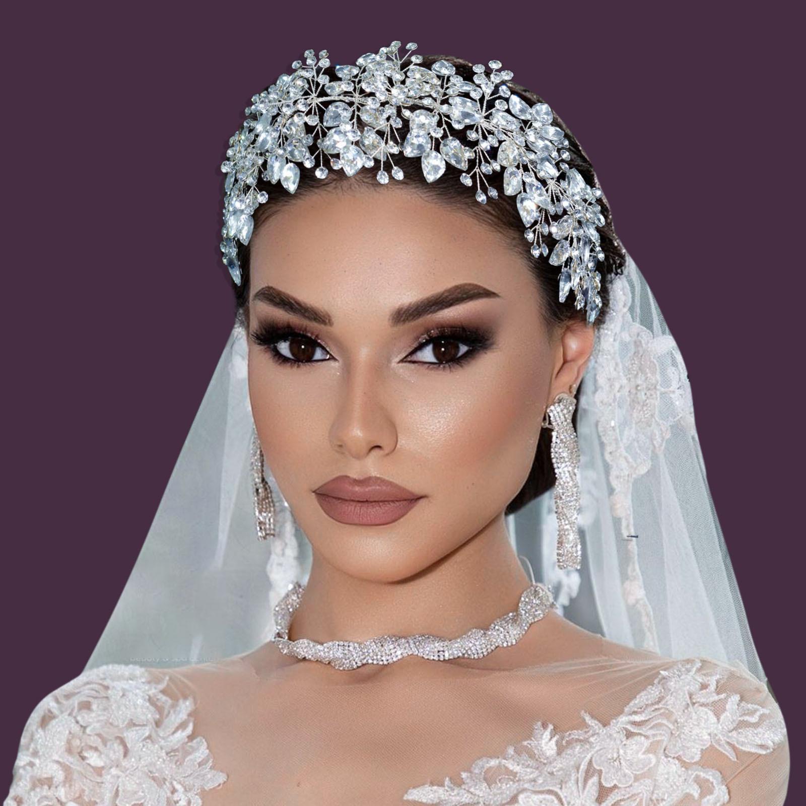 Tocado nupcial de pedrería de comercio exterior diadema prensapelo tejida a mano diamante en forma de corazón corona para el cabello con velo accesorios para el cabello DZ068
