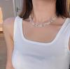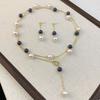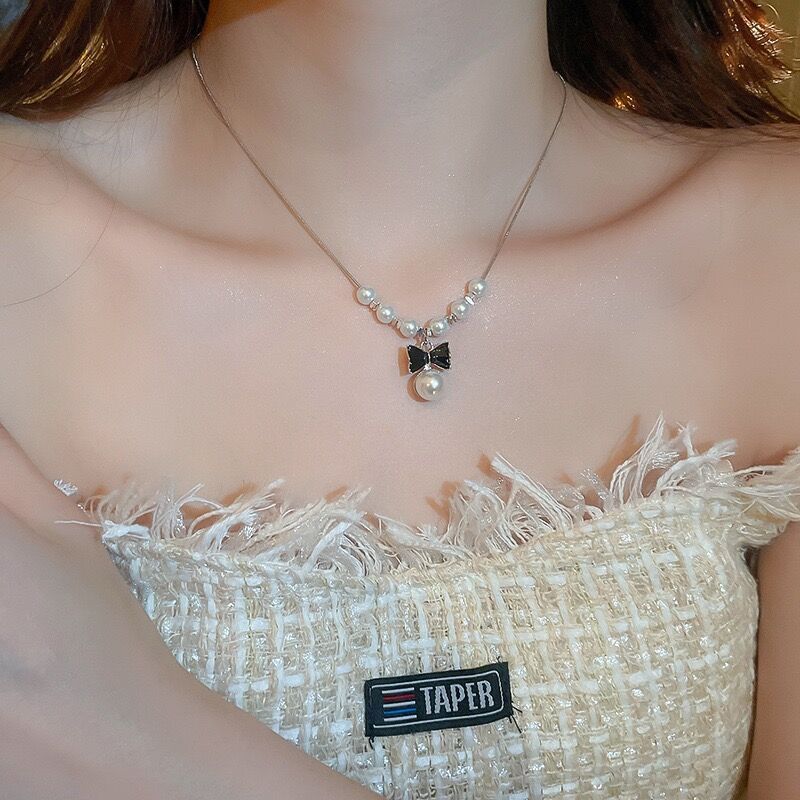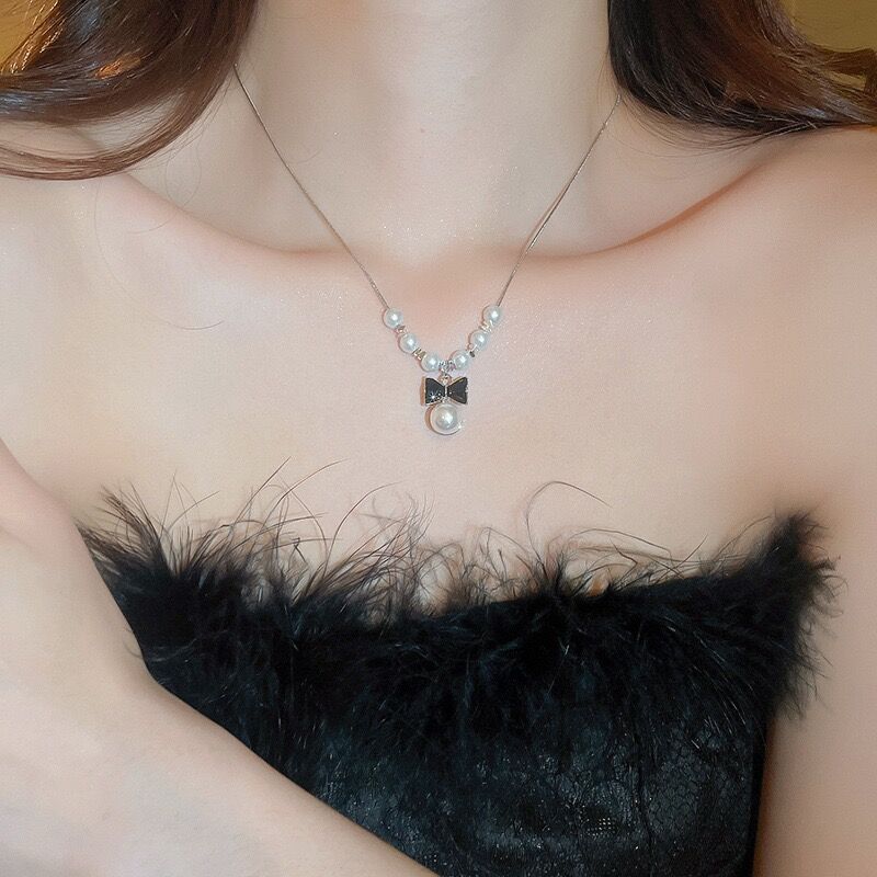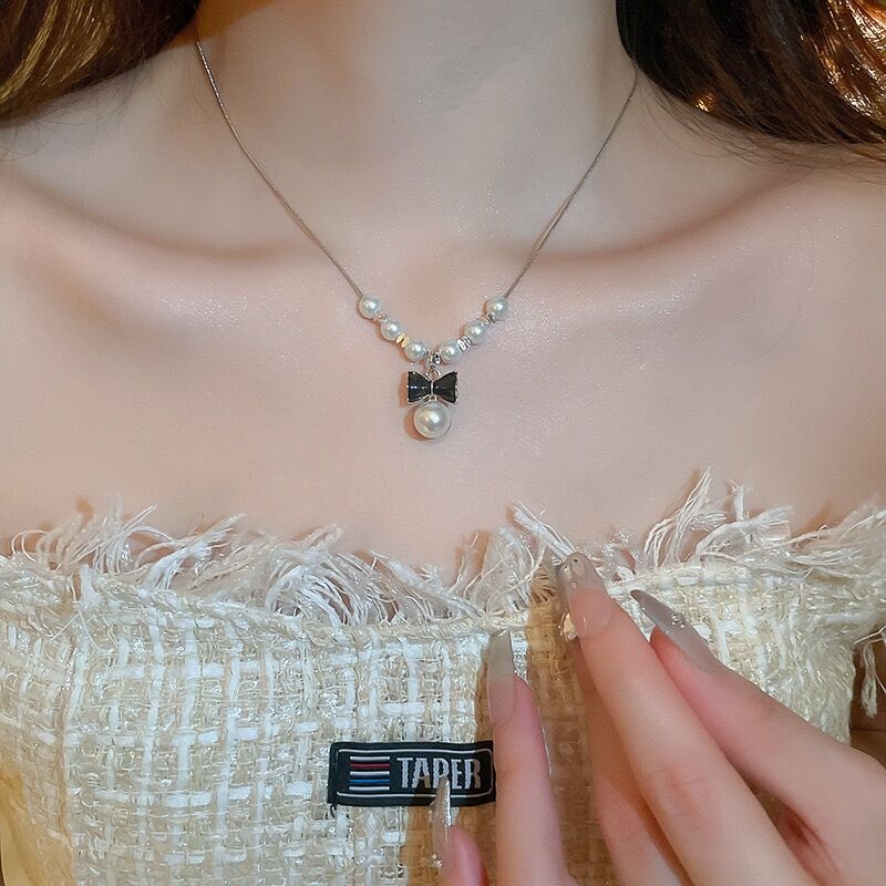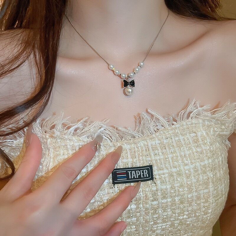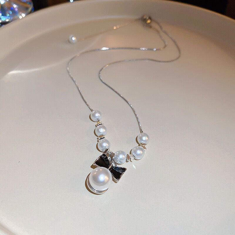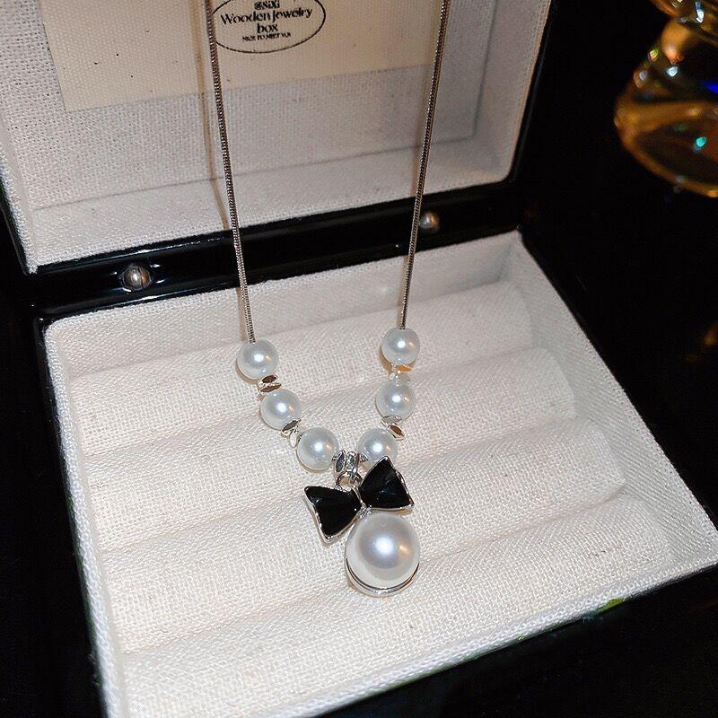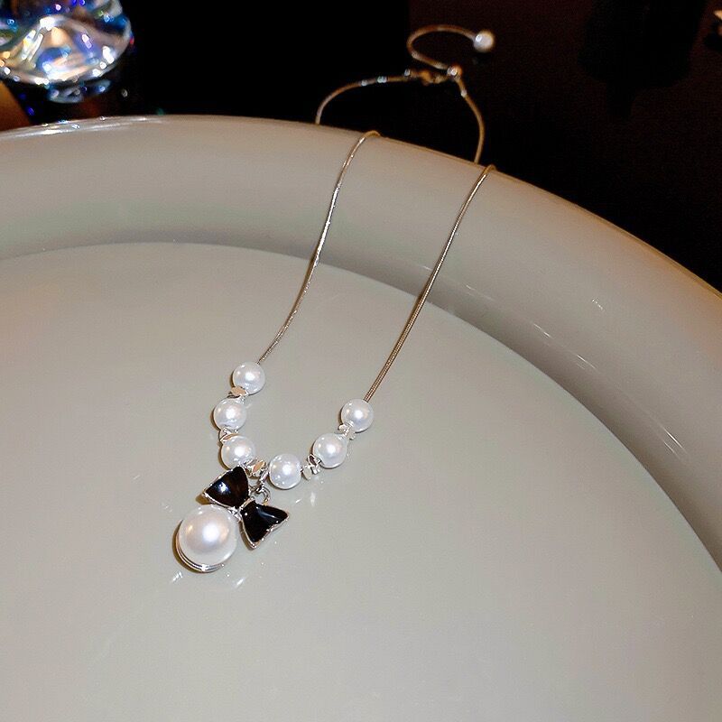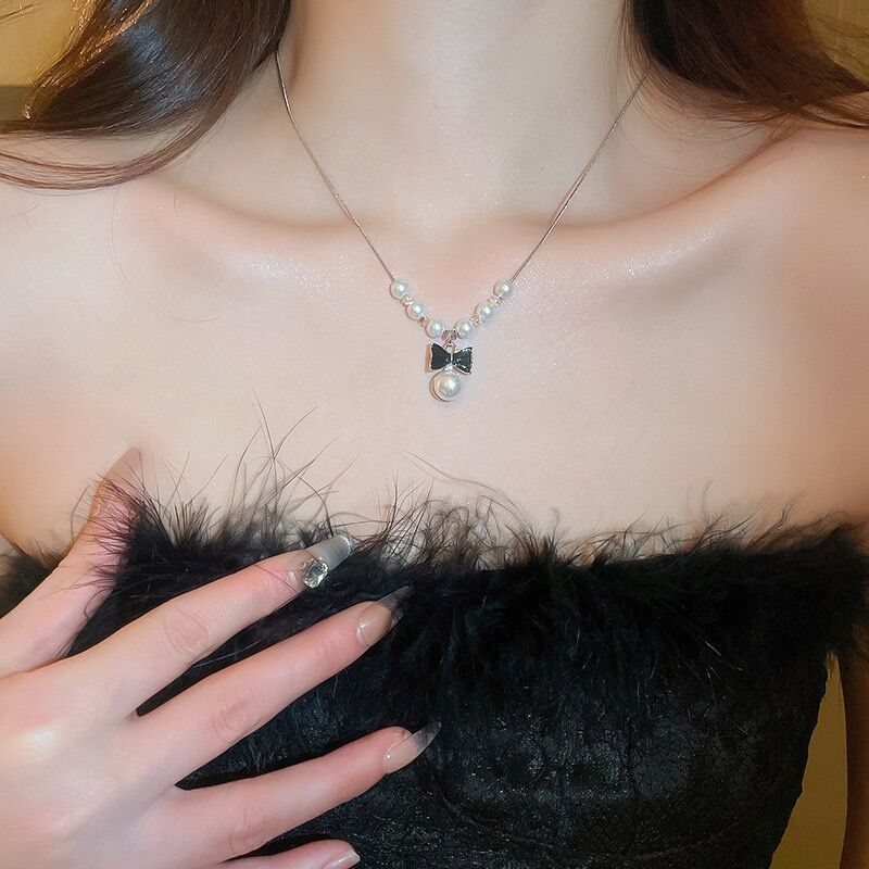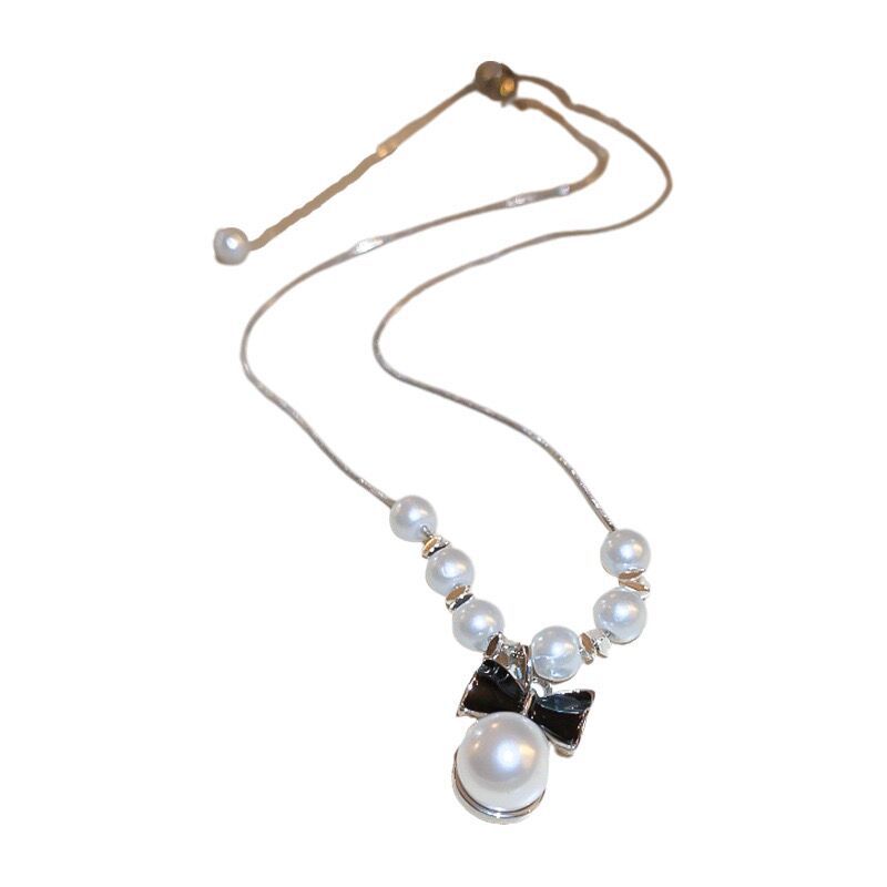 Collar con colgante de perla y lazo para mujer, cadena de suéter ligera de lujo con nicho, accesorios de collar populares para otoño e invierno 2024.