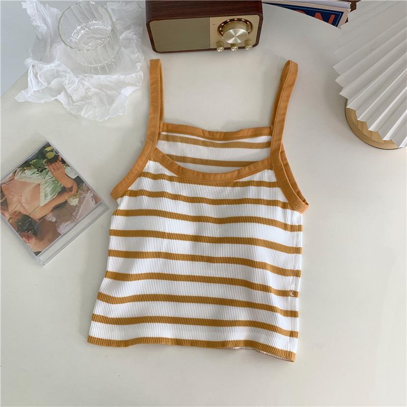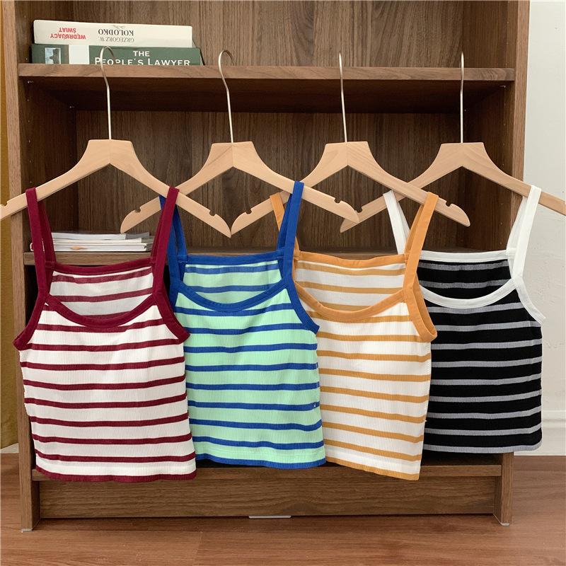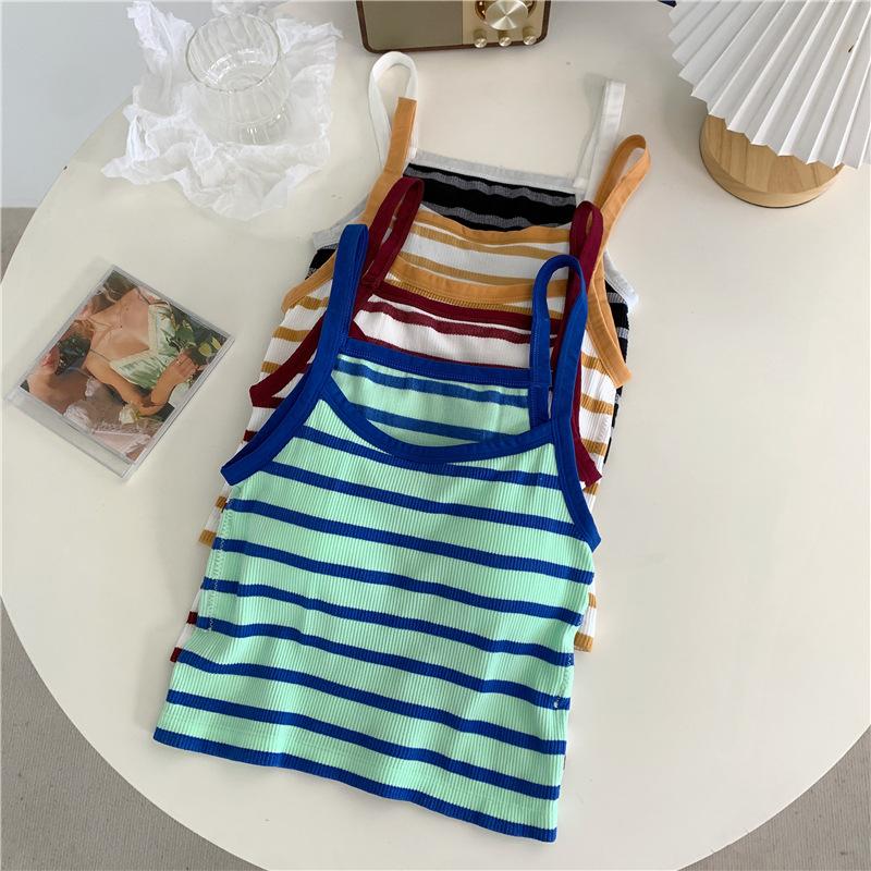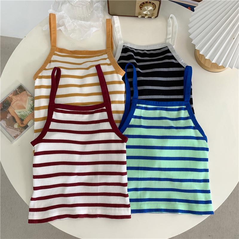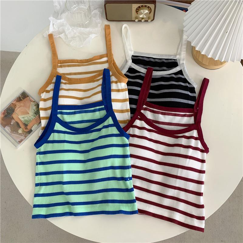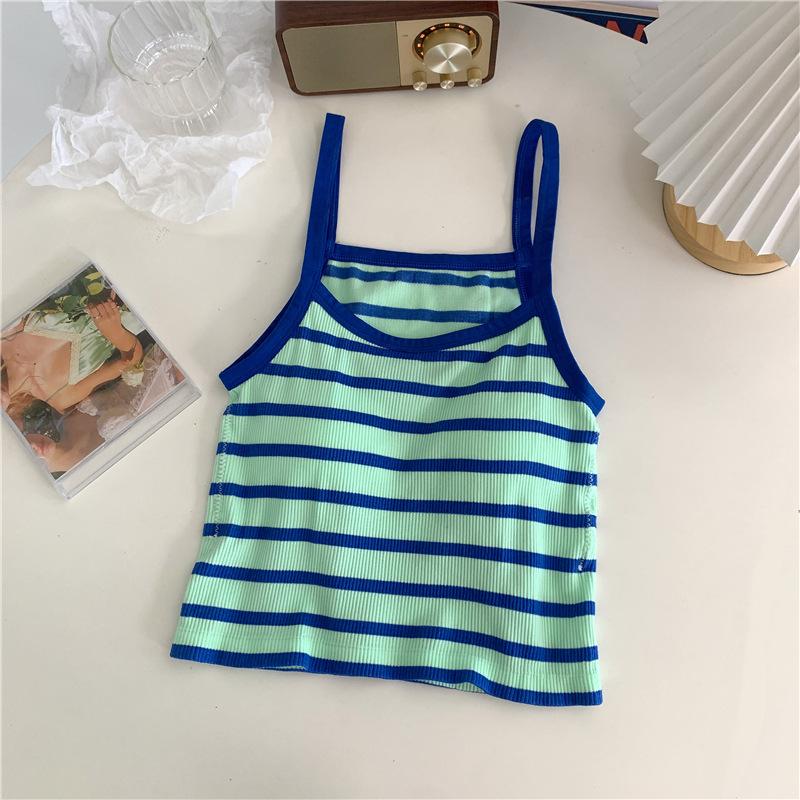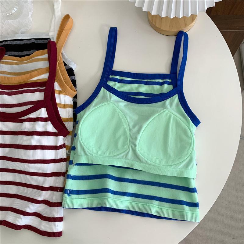 Camisola pequeña a rayas de color contrastante para mujer, ropa interior ajustada con almohadilla para el pecho, chaleco exterior dulce, novedad de verano de 2024