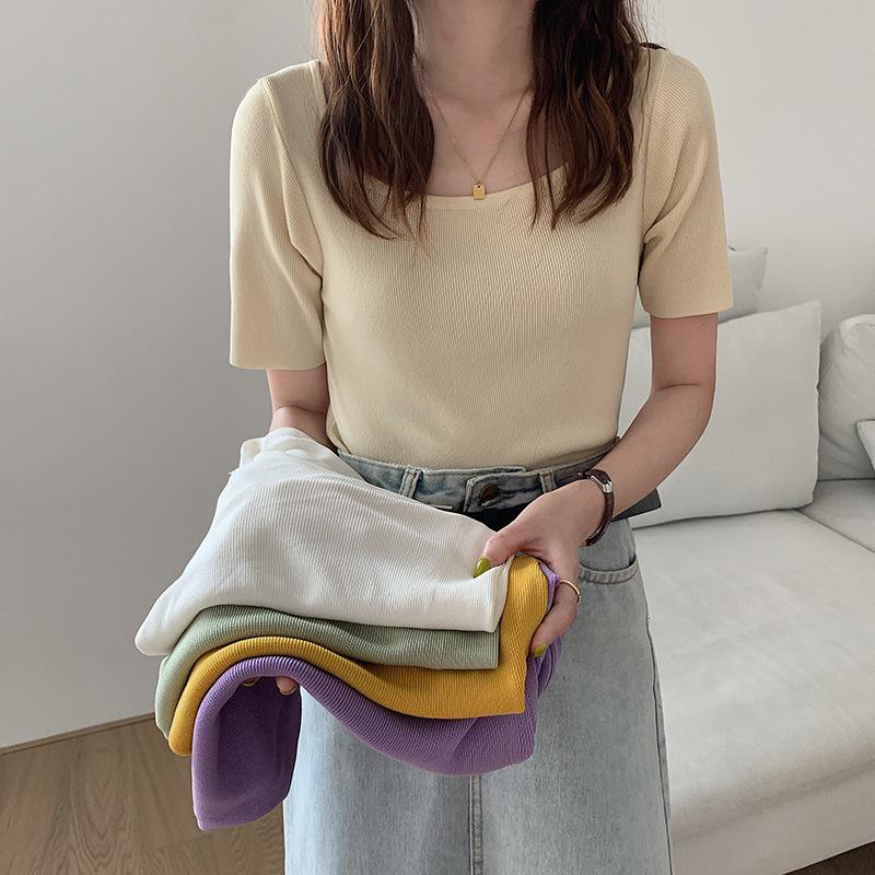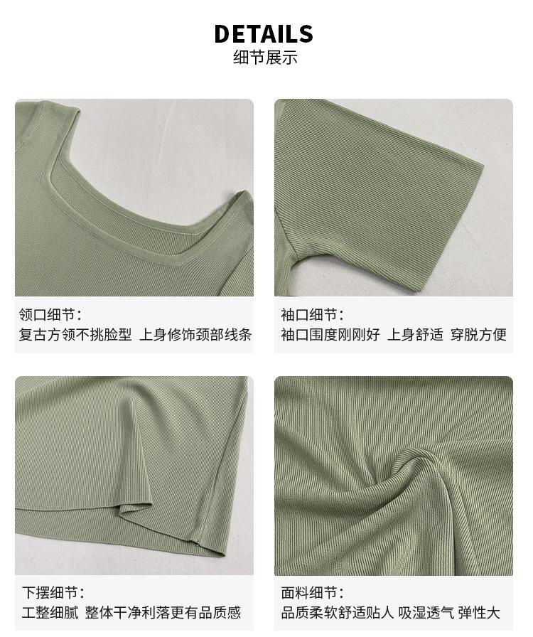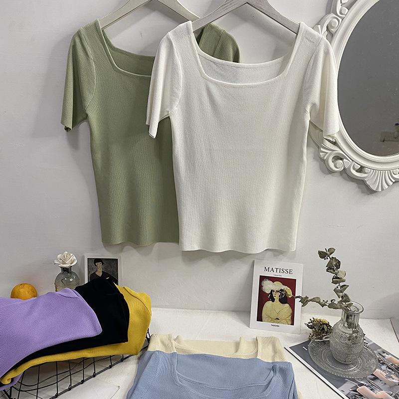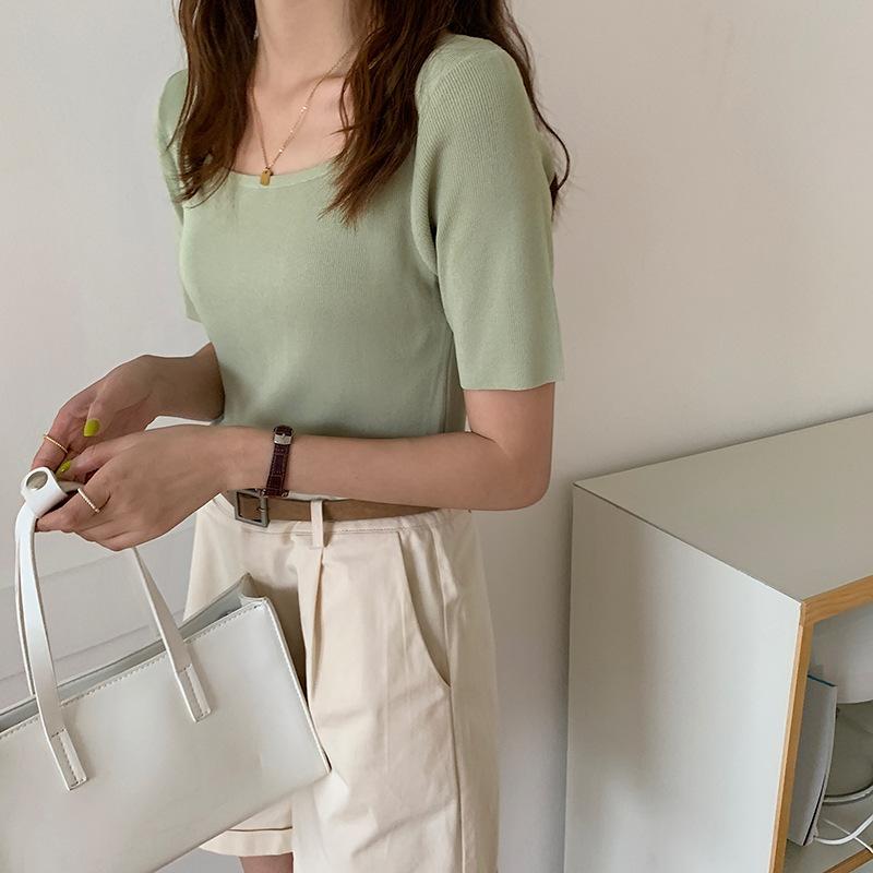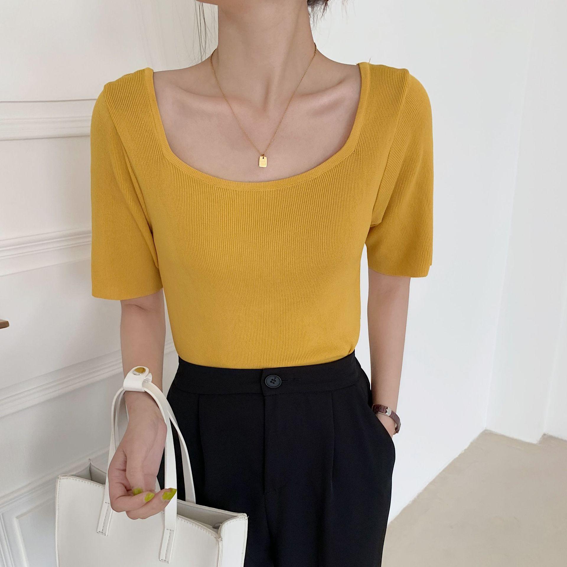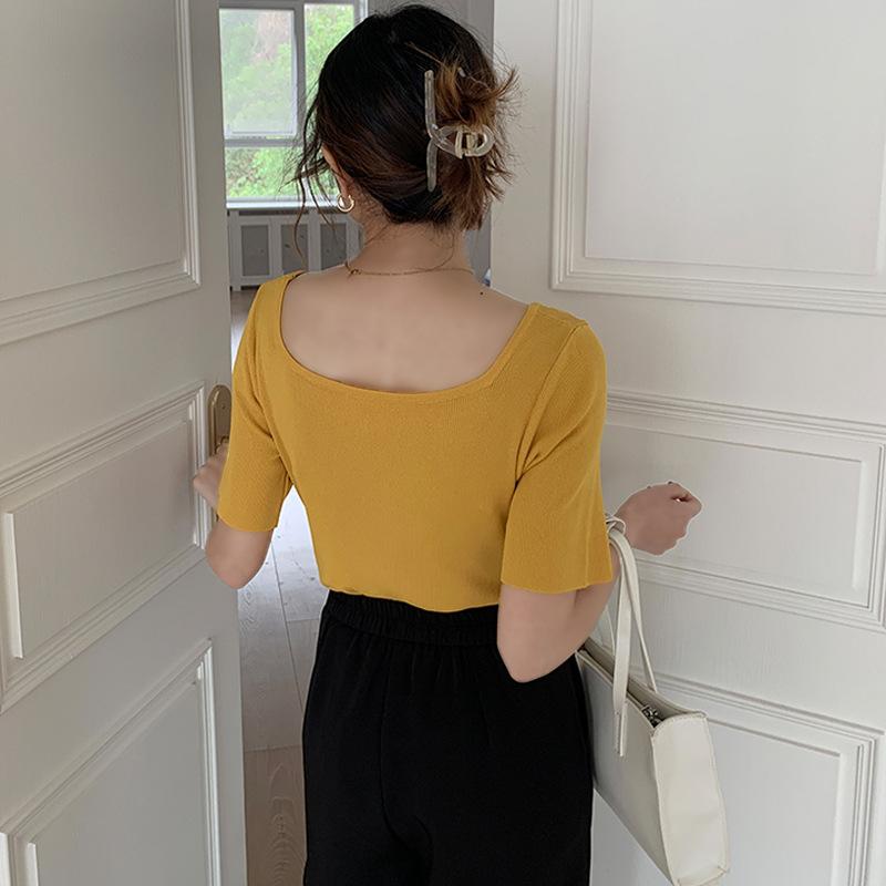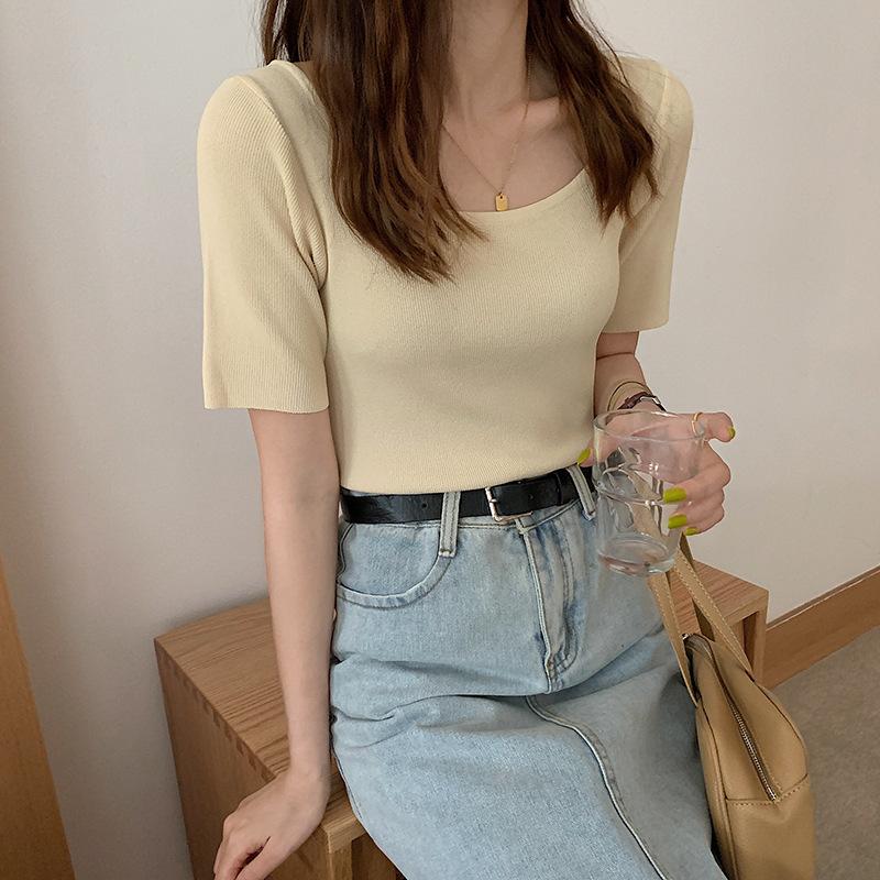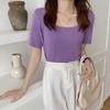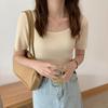 Suéter de punto básico de manga corta con cuello cuadrado francés para mujer, camiseta de seda helada adelgazante sin espalda de color liso, combina con todo.