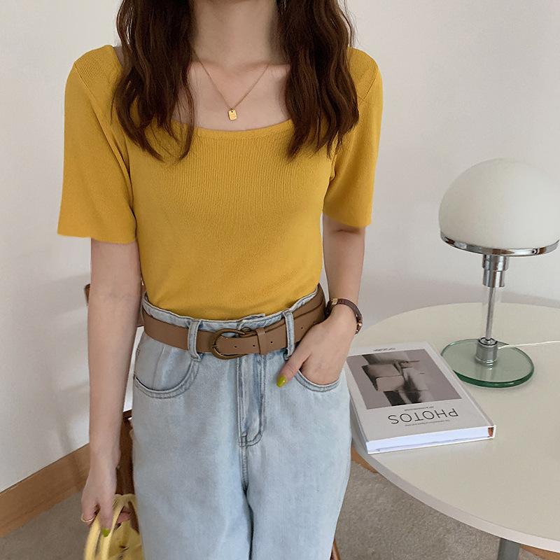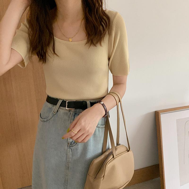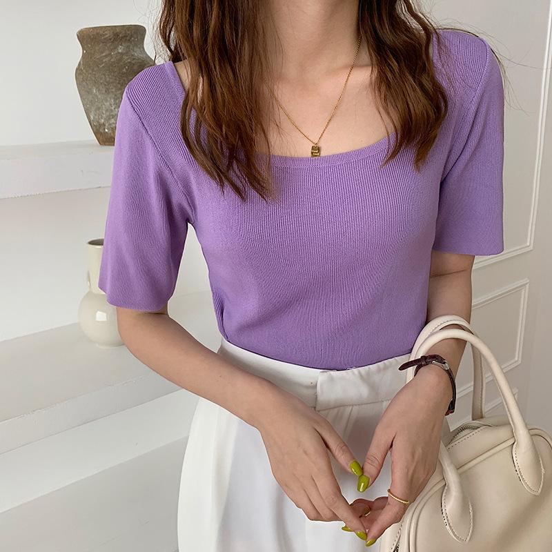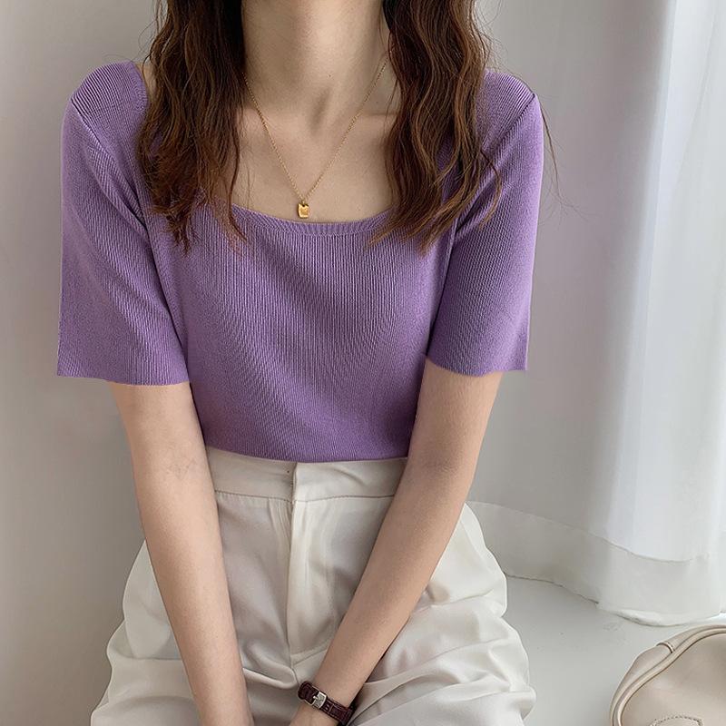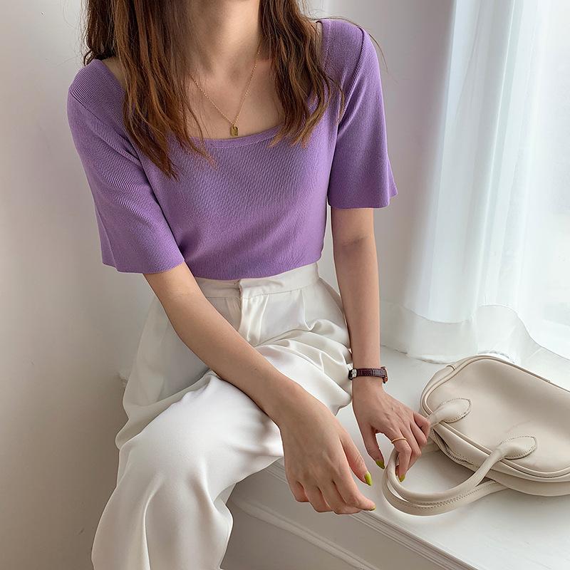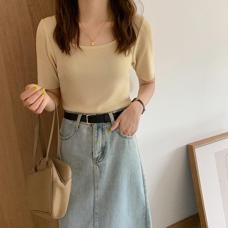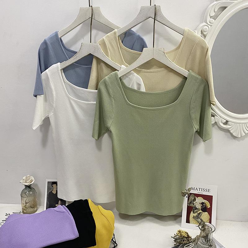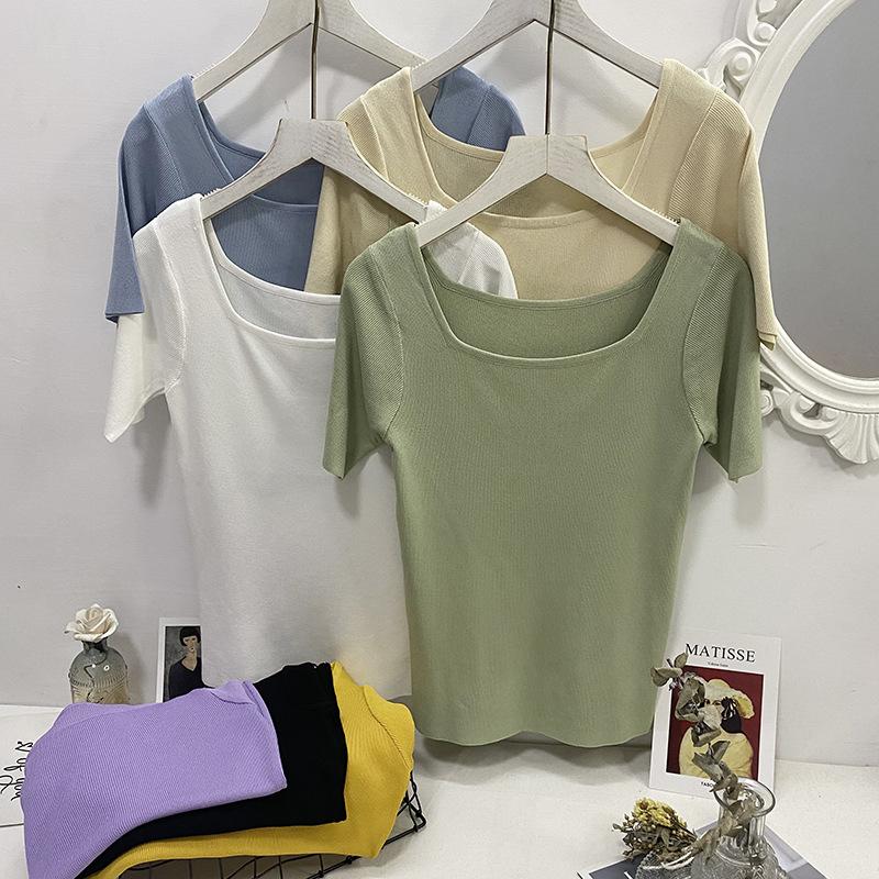 Suéter de punto básico de manga corta con cuello cuadrado francés para mujer, camiseta de seda helada adelgazante sin espalda de color liso, combina con todo.