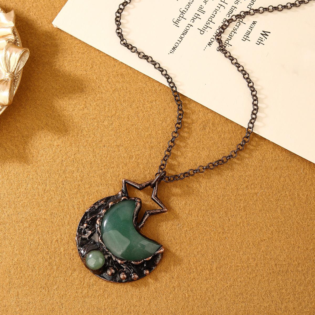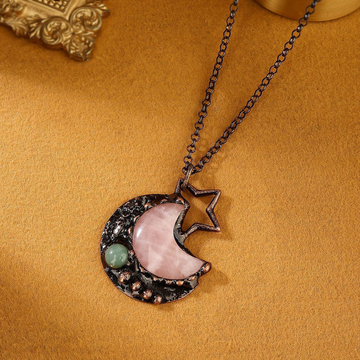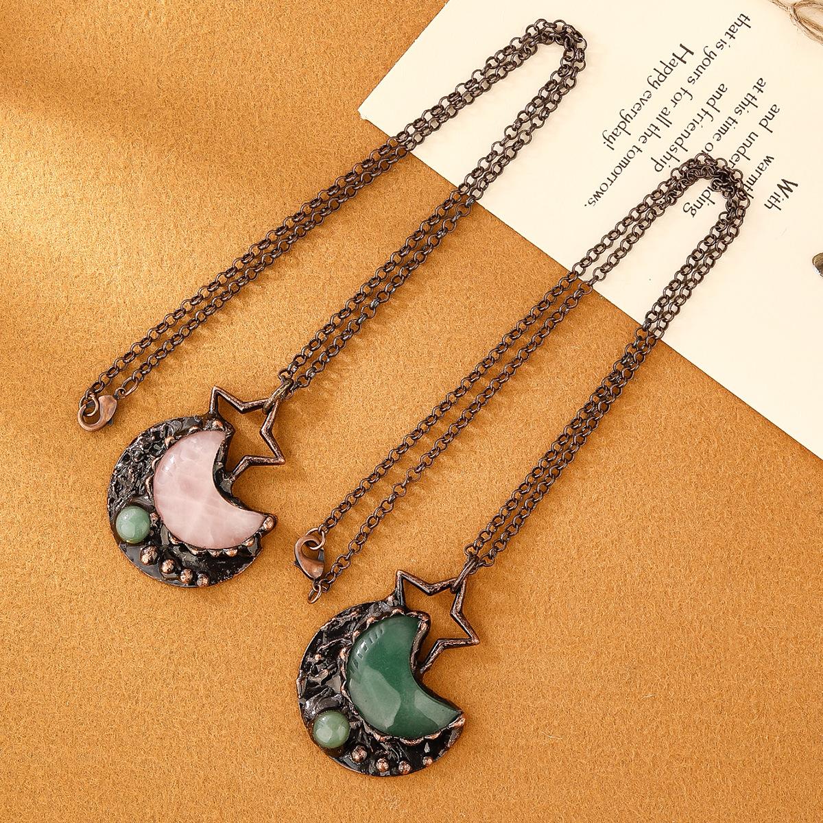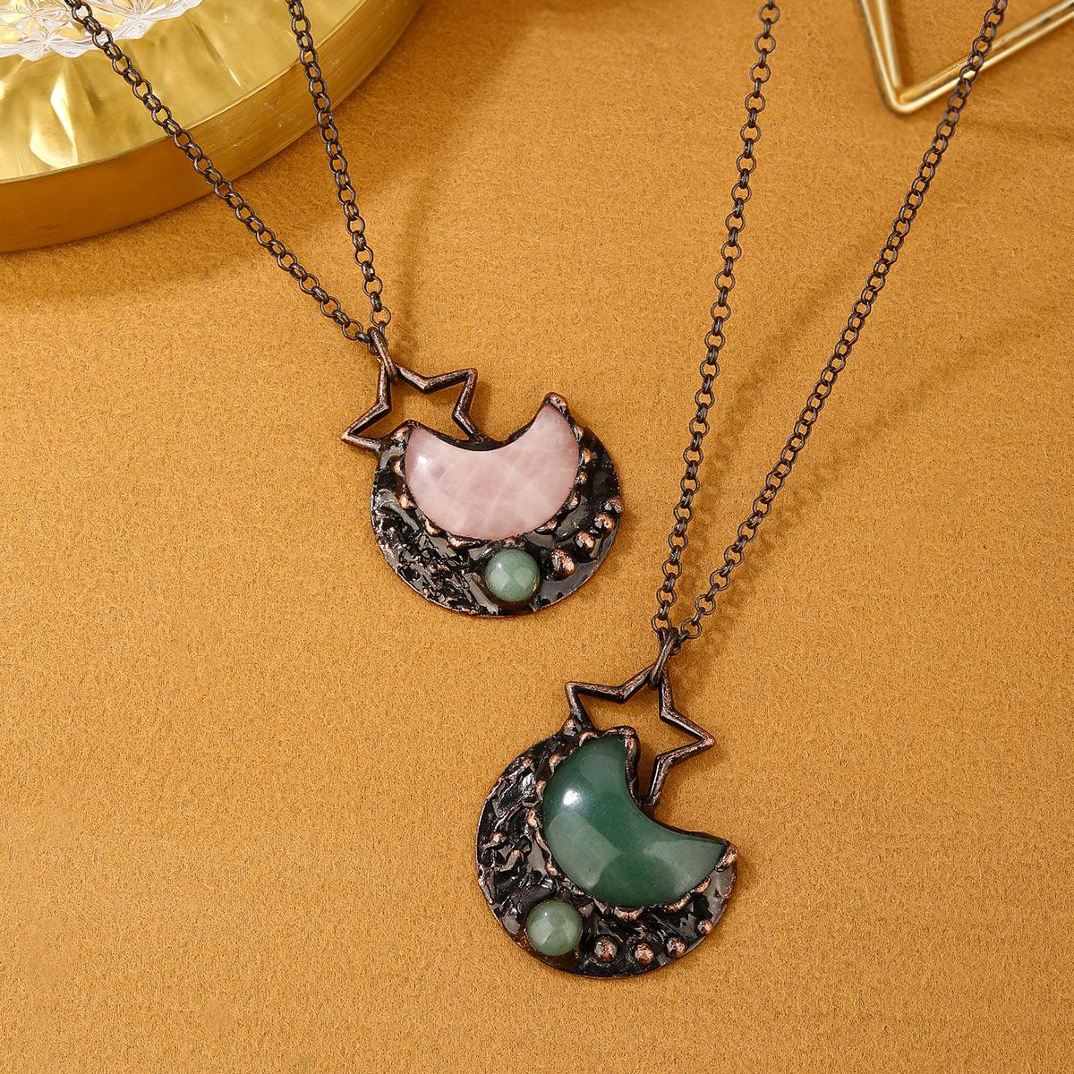 Collar con colgante de estrella lunar de jade Dongling verde de cristal rosa de estilo retro con incrustaciones de soldadura cocida a mano y superficie de huevo de jade Dongling verde