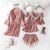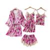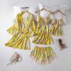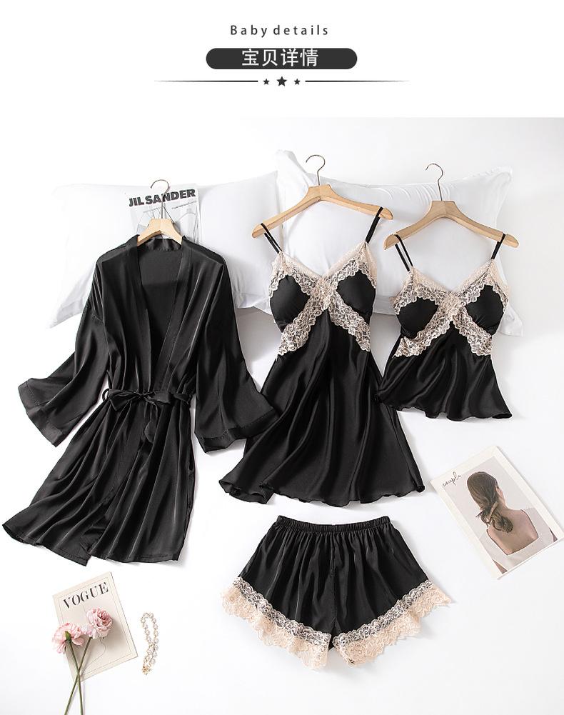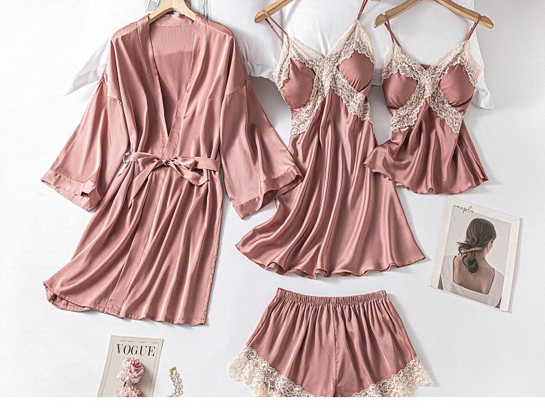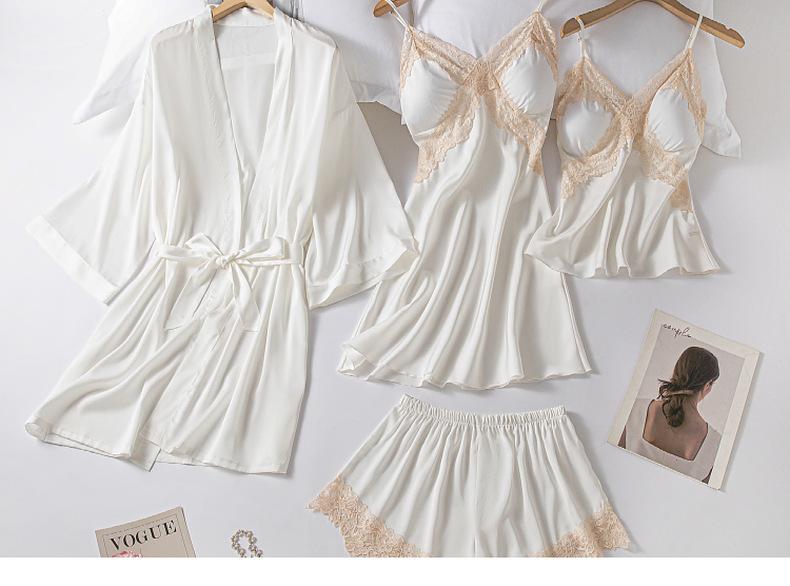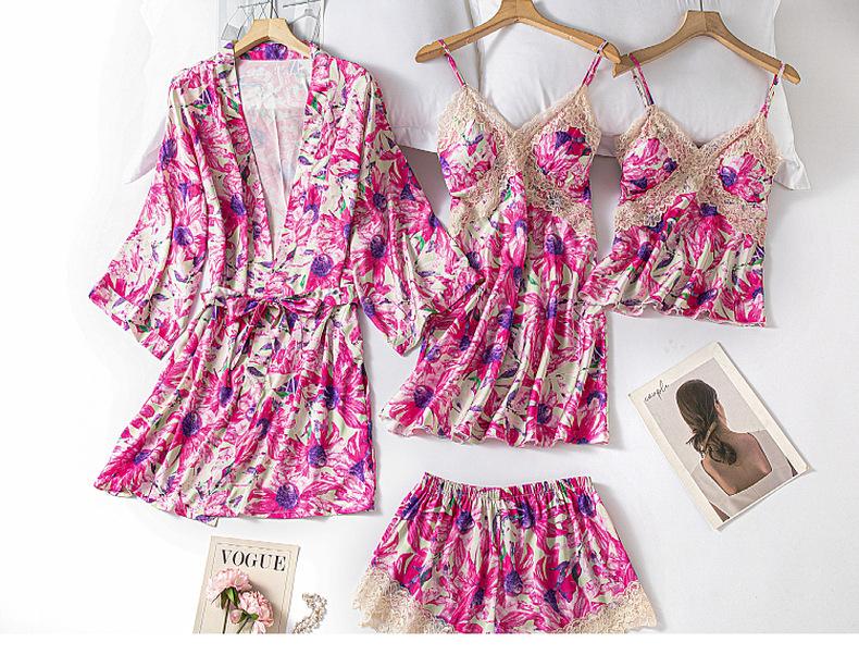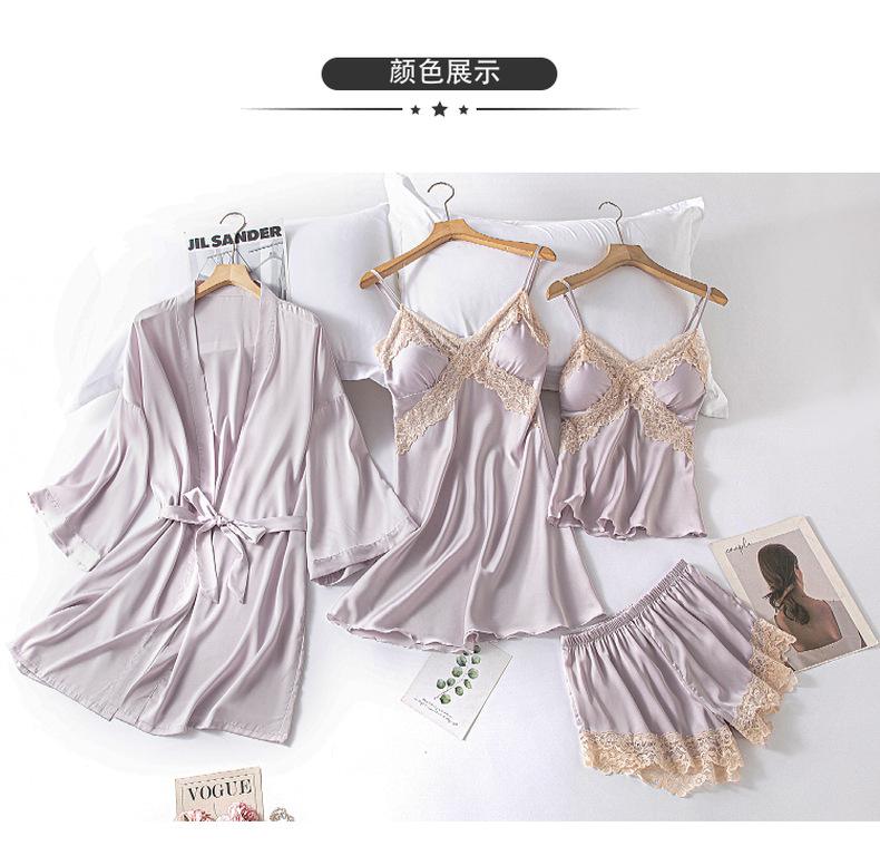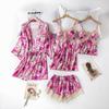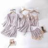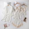 Pijamas de Verano para Mujer Pijamas Sexy Conjunto de Cuatro Piezas Estilo Coreano Pijamas con Tirantes Ropa para el Hogar para Mujer con Almohadilla en el Pecho Camisón Delgado de Seda