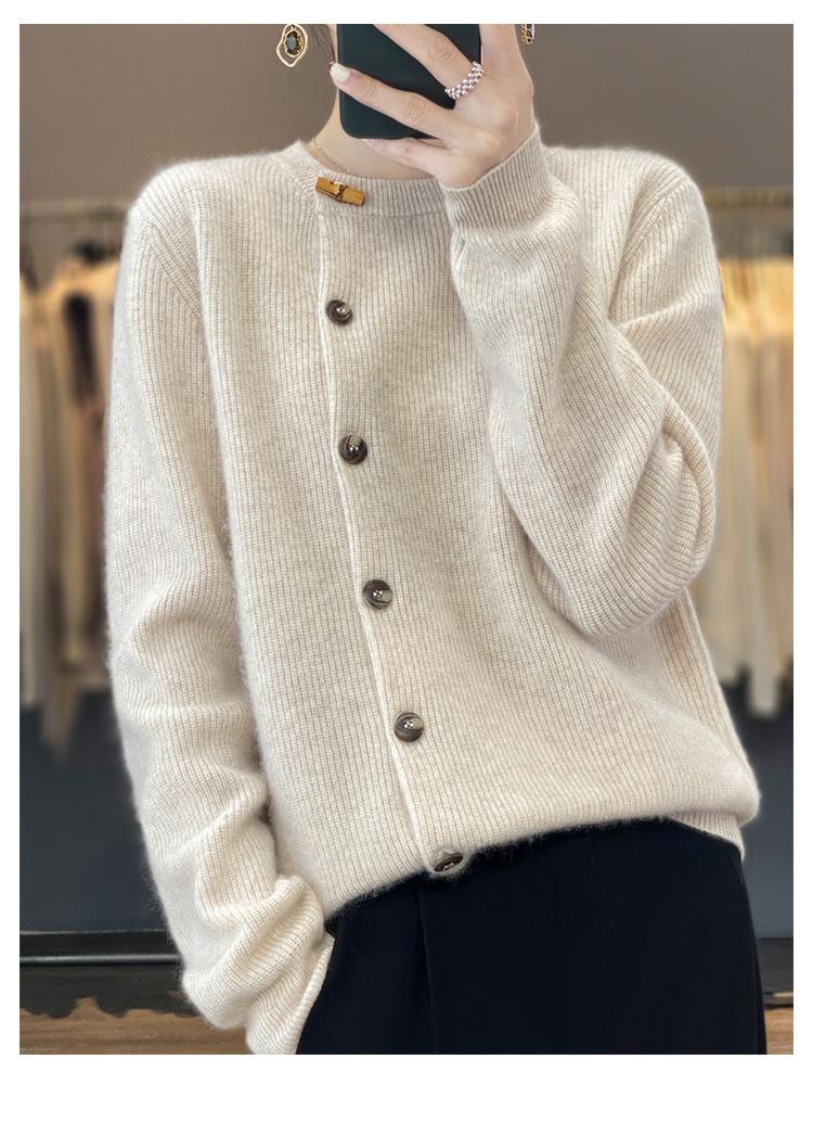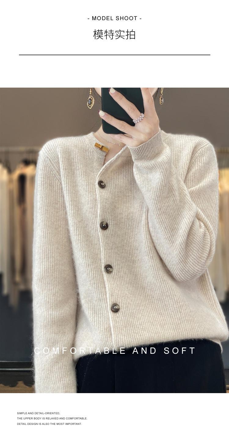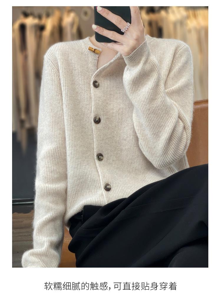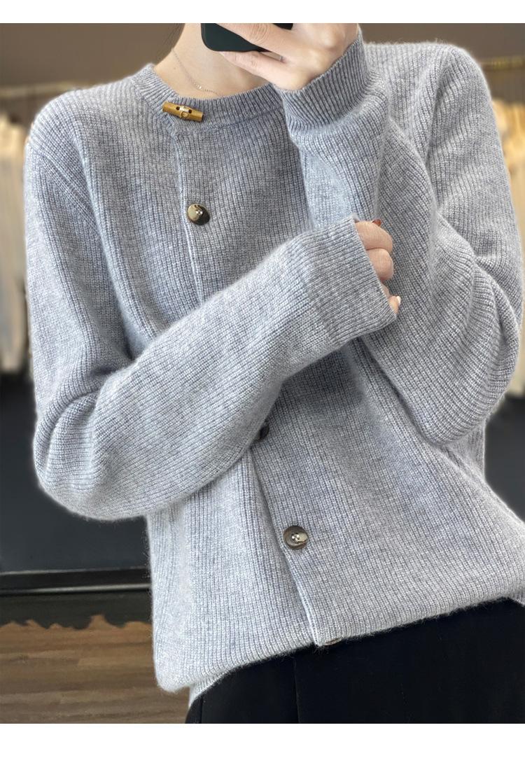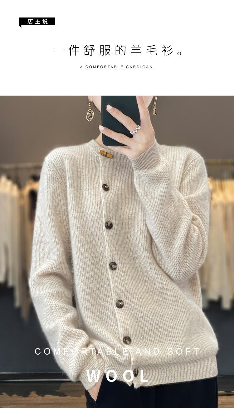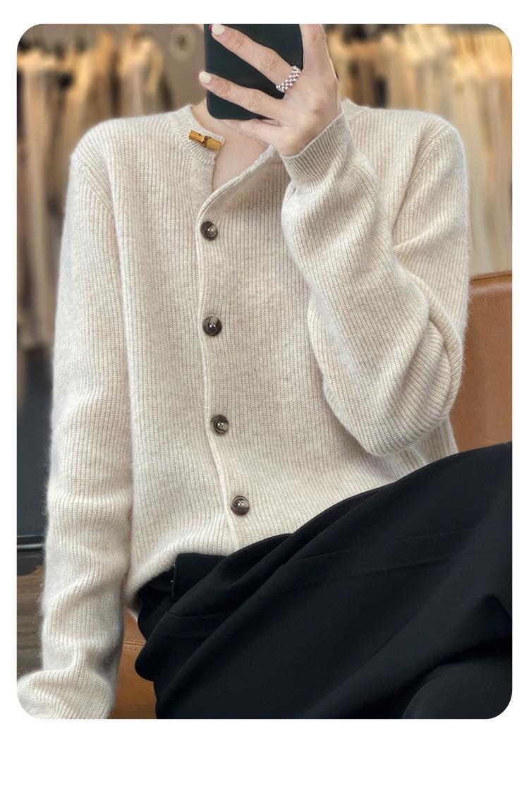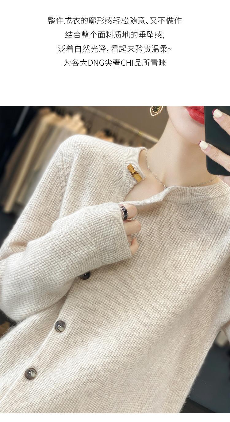 Suéter de lana confeccionado de primera línea, cárdigan de punto para mujer, chaqueta de suéter delgada, otoño e invierno, parte inferior de cuello redondo, manga larga, parte superior suelta