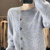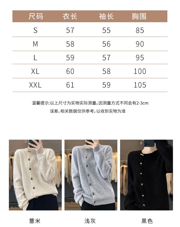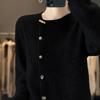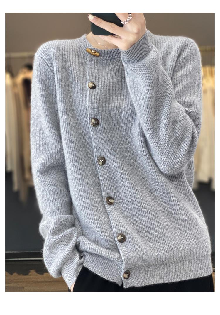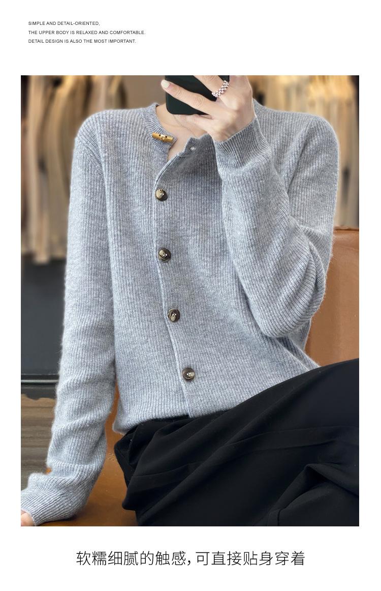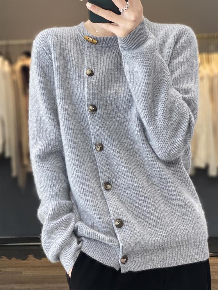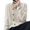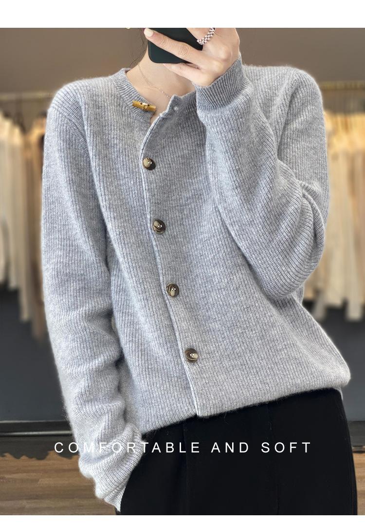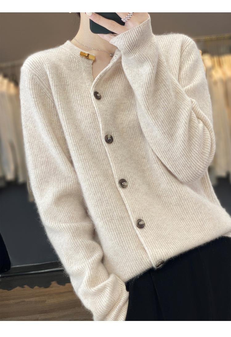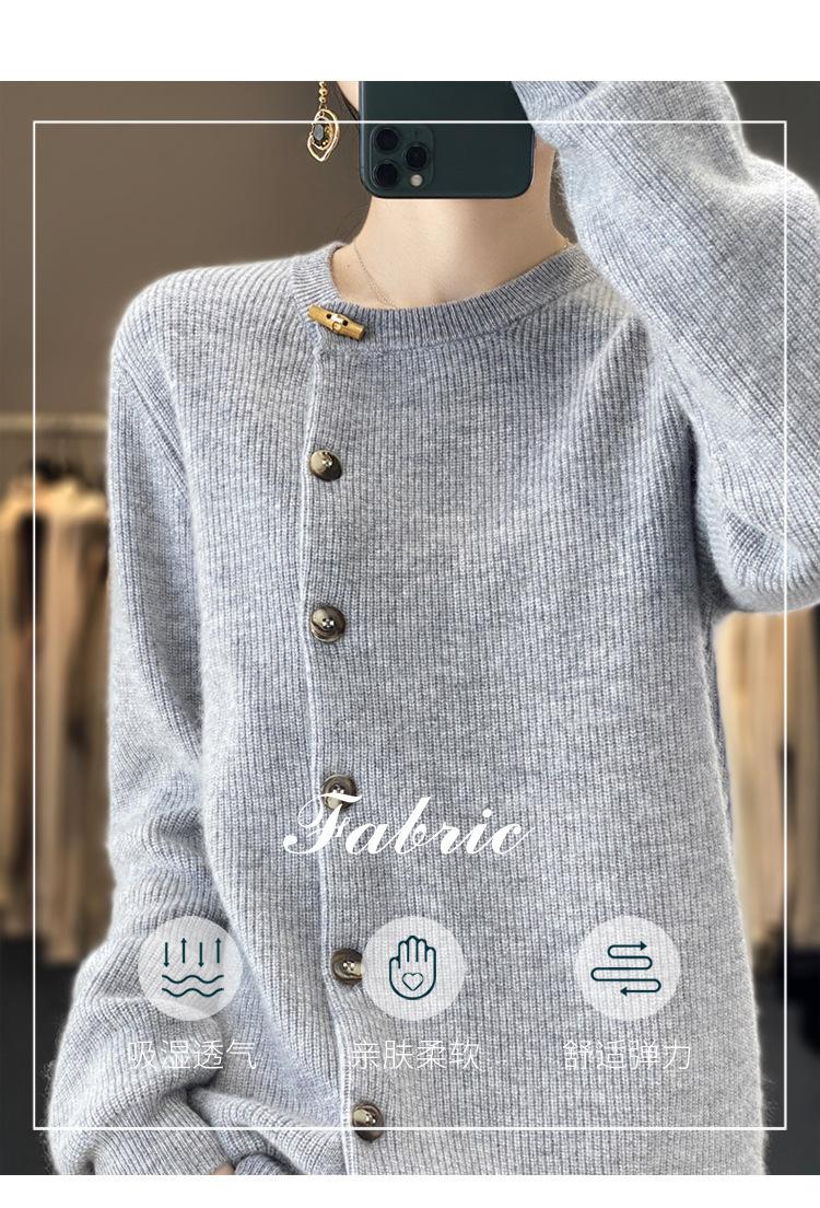 Suéter de lana confeccionado de primera línea, cárdigan de punto para mujer, chaqueta de suéter delgada, otoño e invierno, parte inferior de cuello redondo, manga larga, parte superior suelta