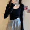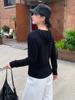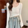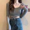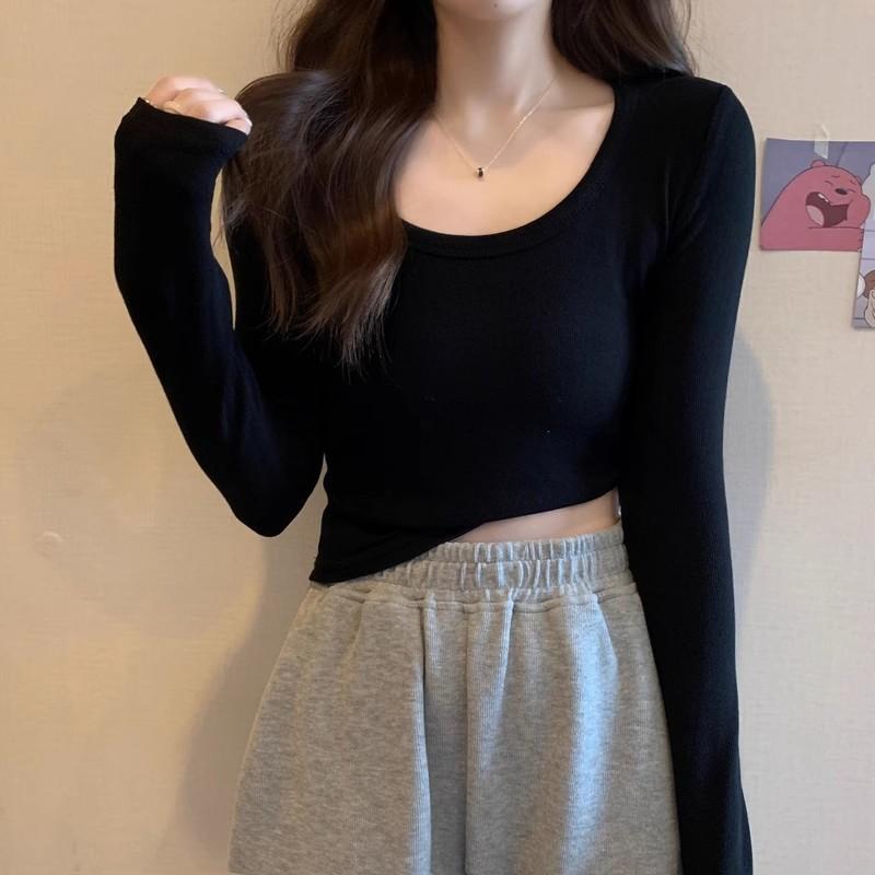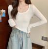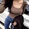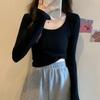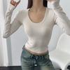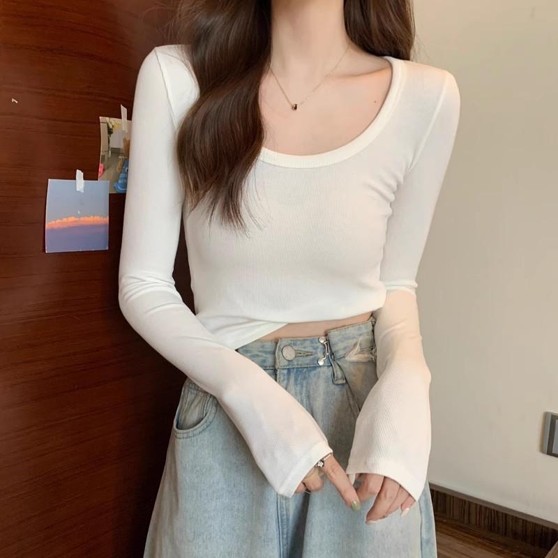Camiseta de manga larga estilo coreano para mujer, otoño e invierno 2025, cuello bajo, cuello en U, hilo de algodón, hombros descubiertos, ajustada, combinable con todo, top básico con cuello en U para mujer
