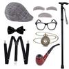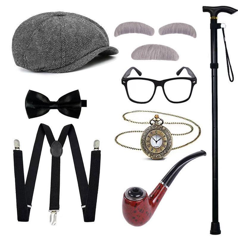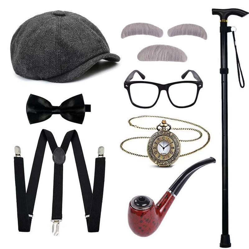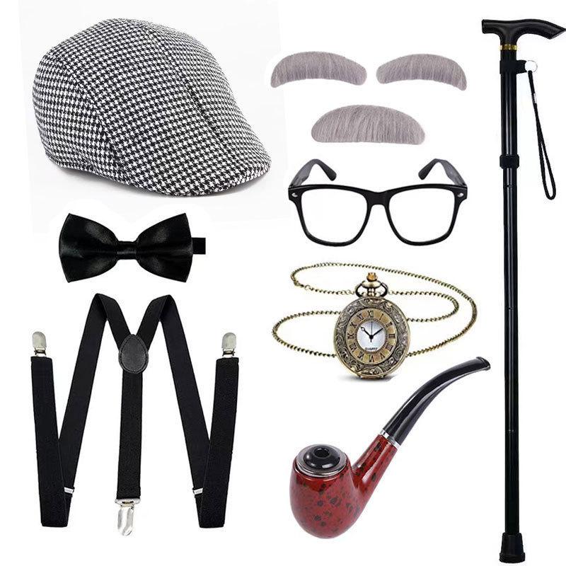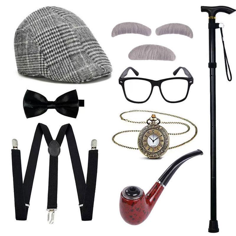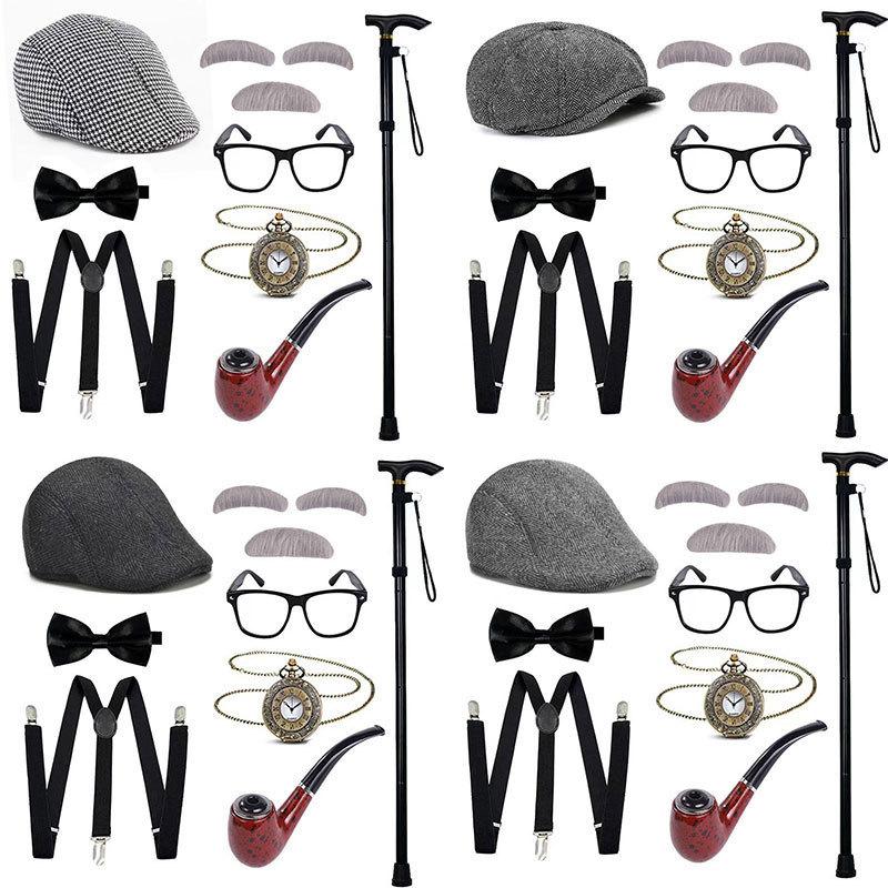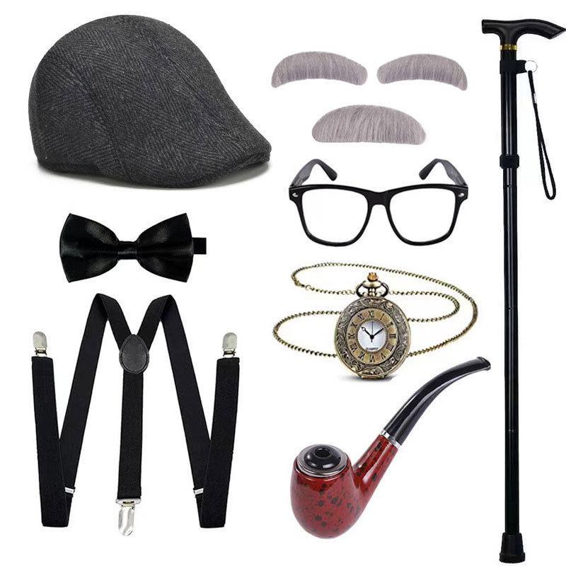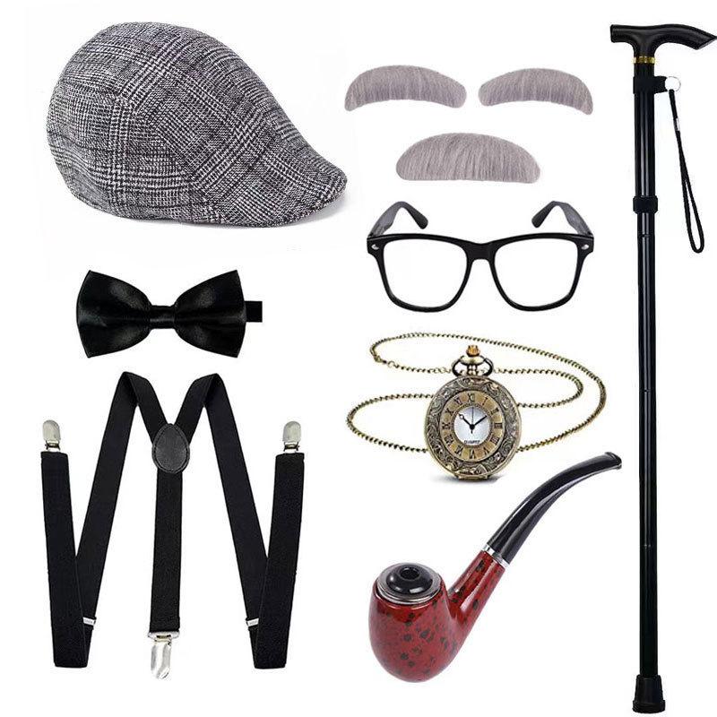Halloween COS Peluca de Abuelo Sombrero Barba Muleta Accesorios Disfraz Chaleco de Anciano Set de Vestir para Show