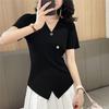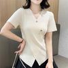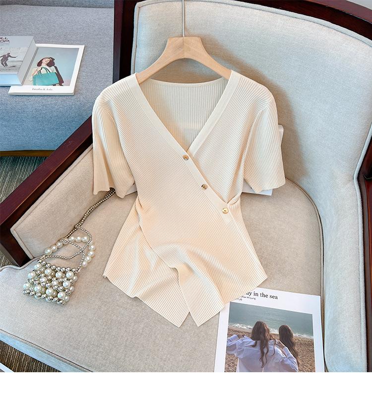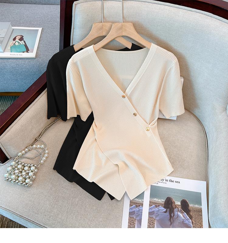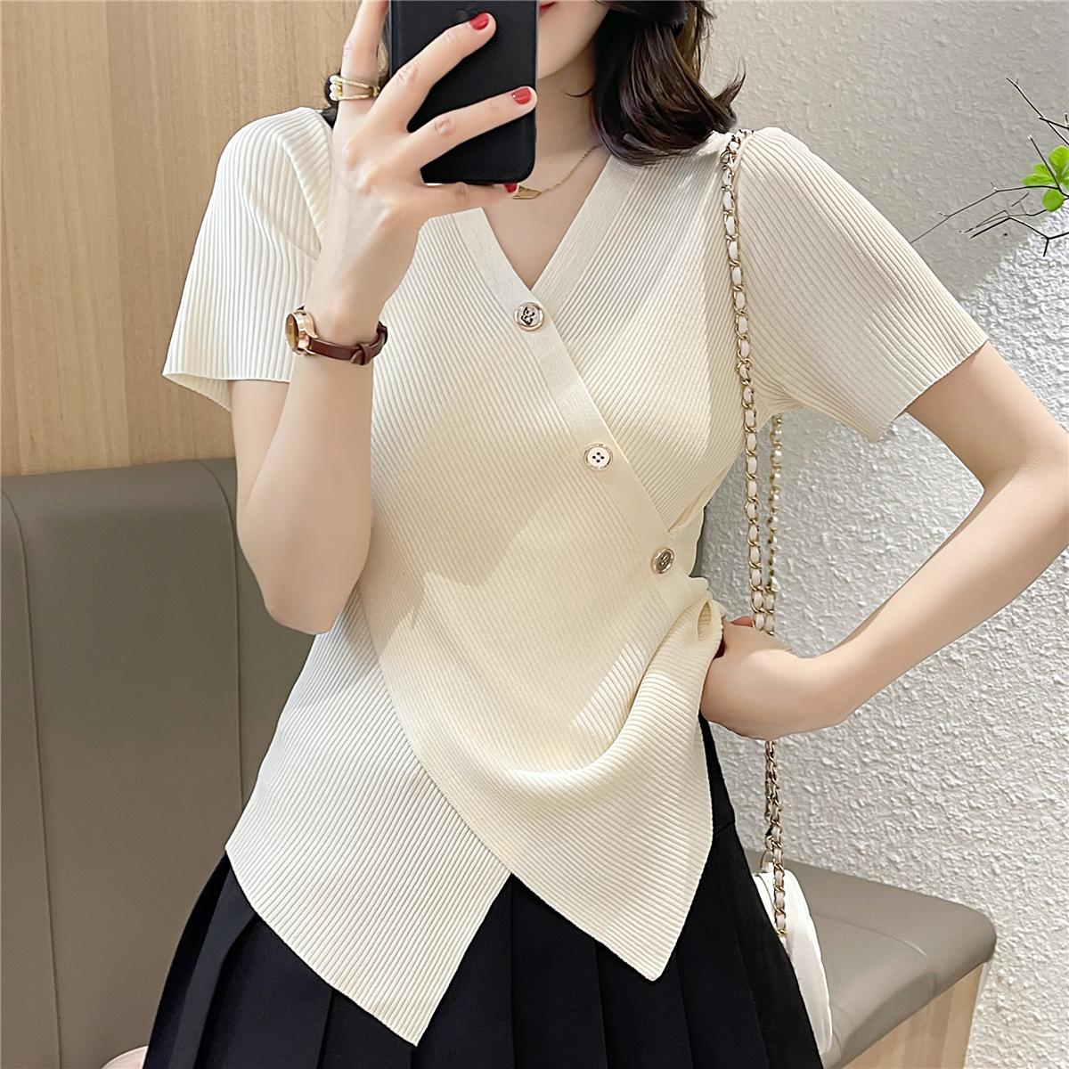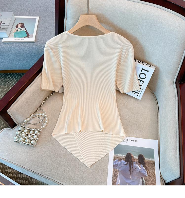 Suéter de manga corta de seda helada para mujer de talla grande, diseño de verano, camiseta de nicho con sensación de estilo, top adelgazante irregular, moda