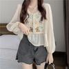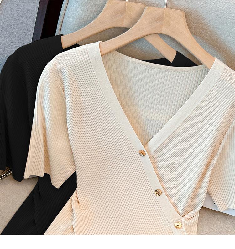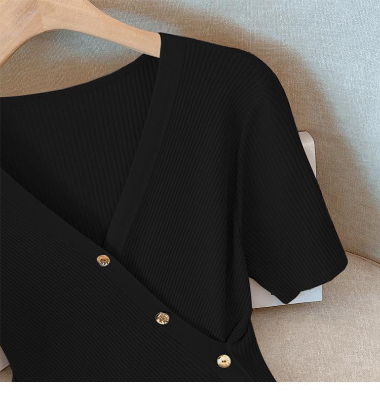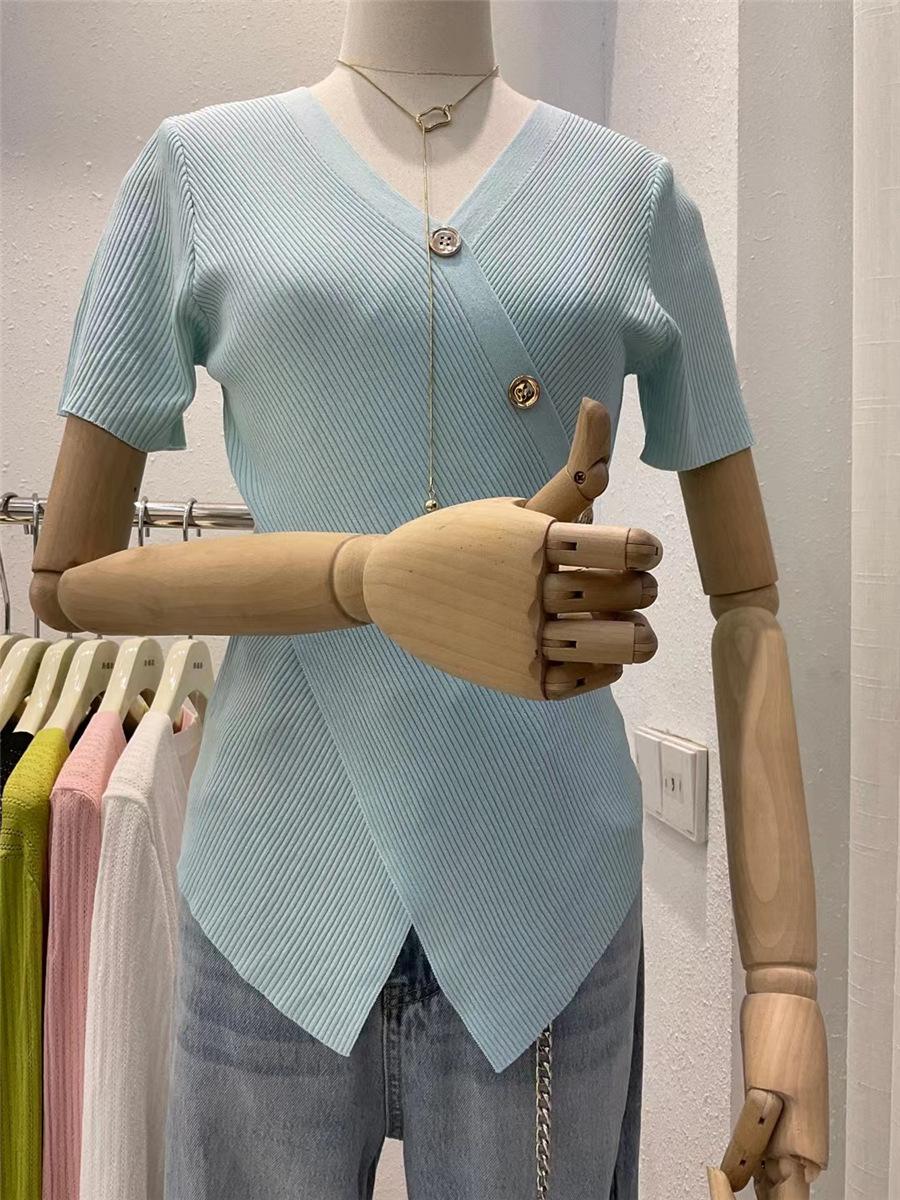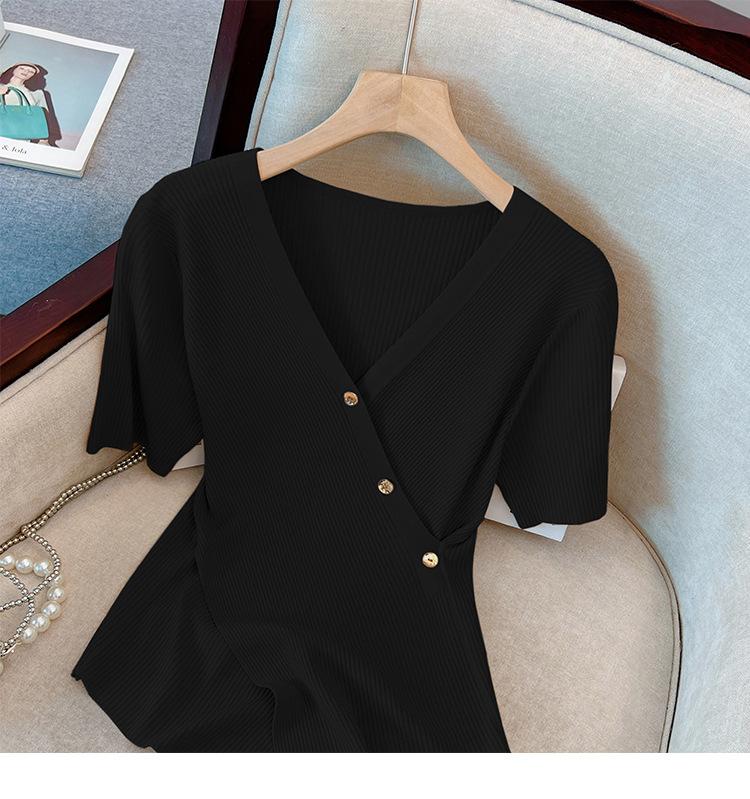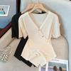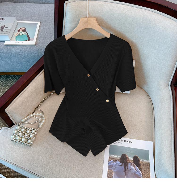 Suéter de manga corta de seda helada para mujer de talla grande, diseño de verano, camiseta de nicho con sensación de estilo, top adelgazante irregular, moda