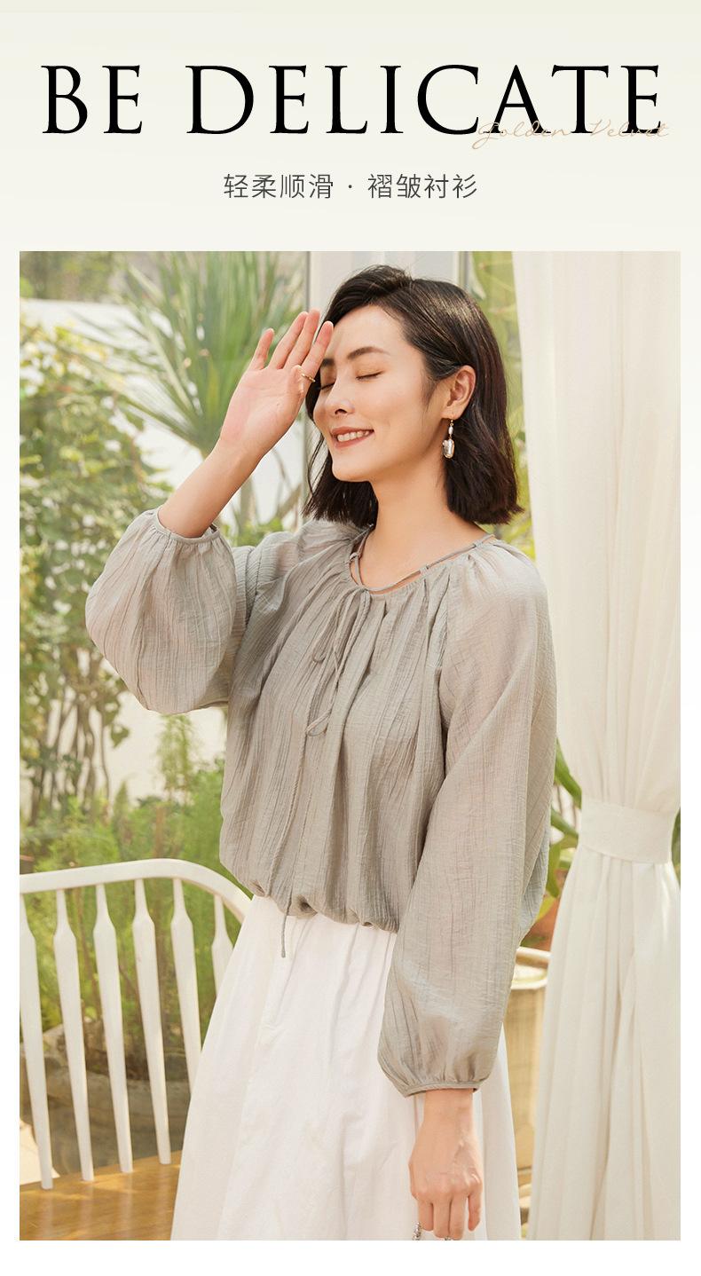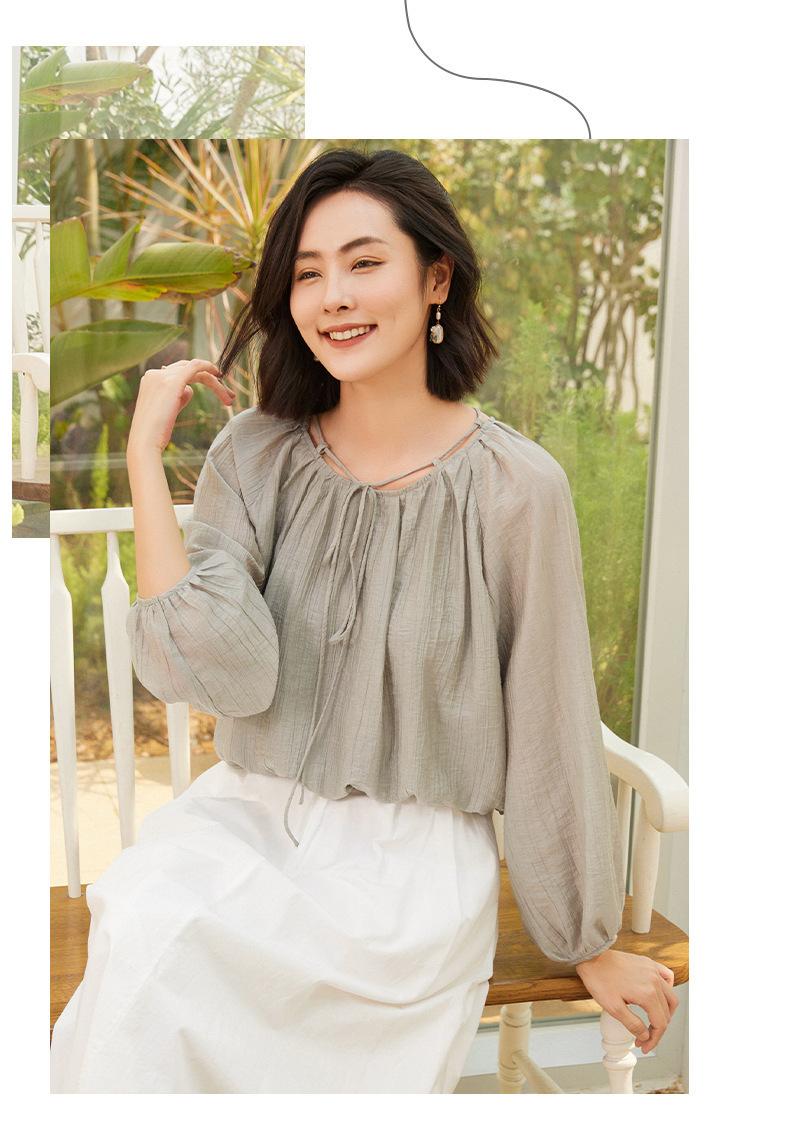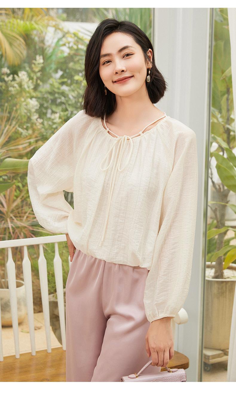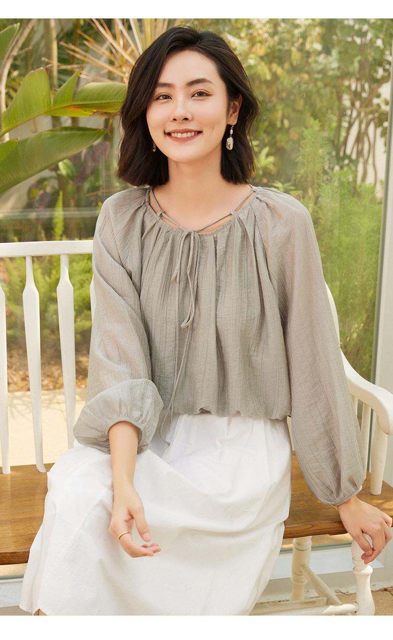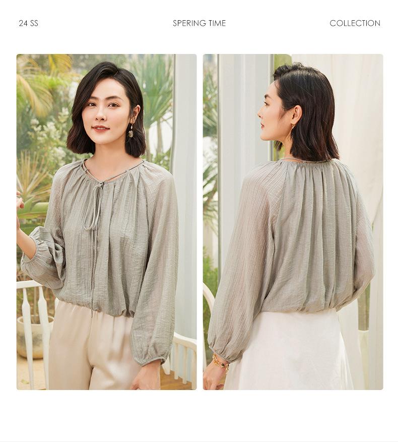 Protector Solar de Verano Nueva Camisa Elegante Pequeña de Tencel para Mujer Suelta Plisada Cuello Redondo con Cordones Casual Manga Linterna Top Camisa