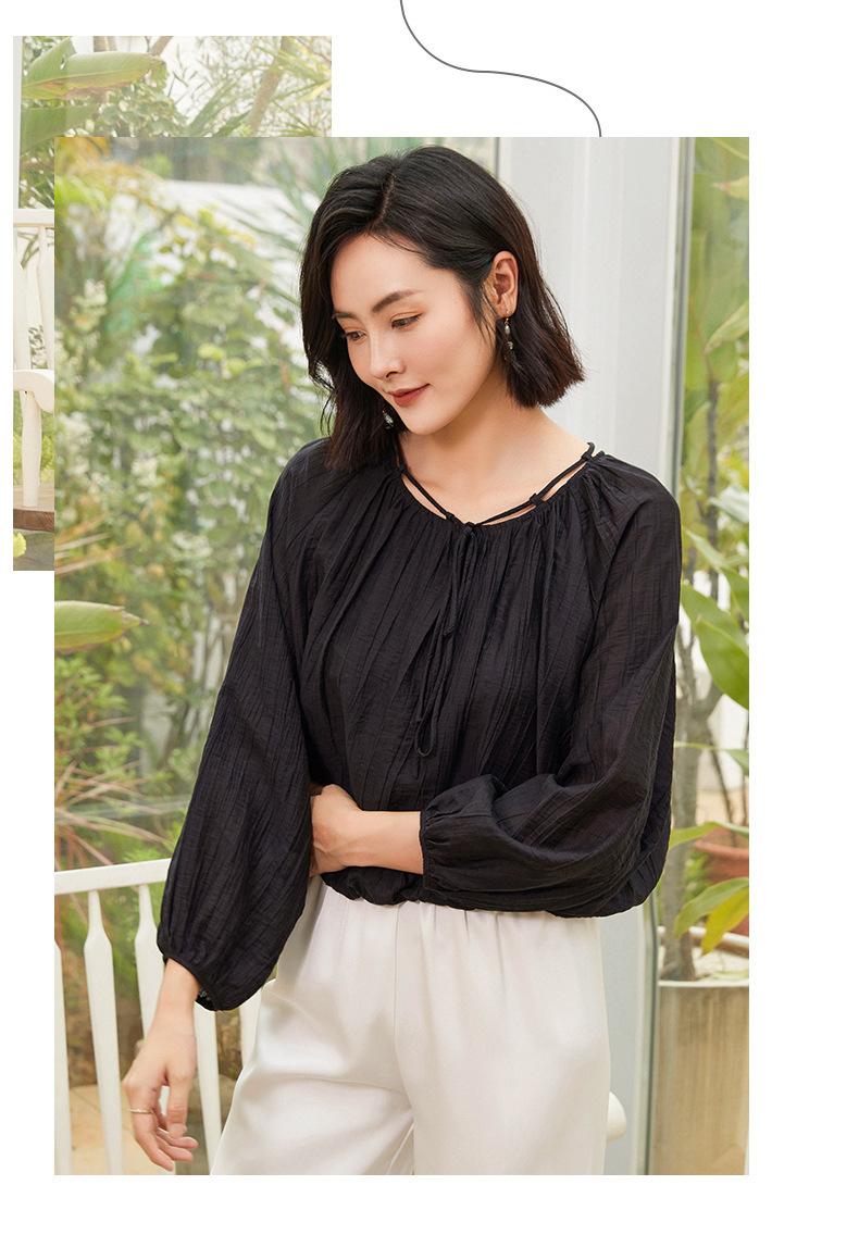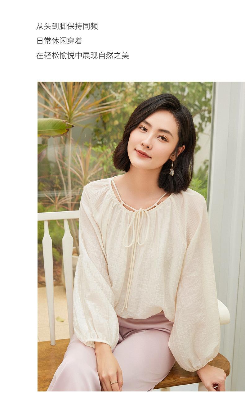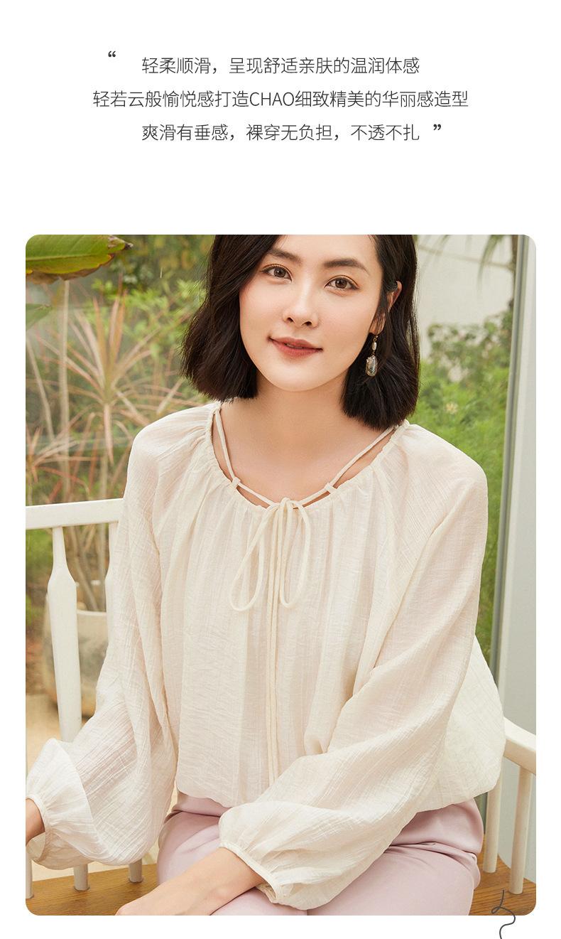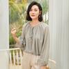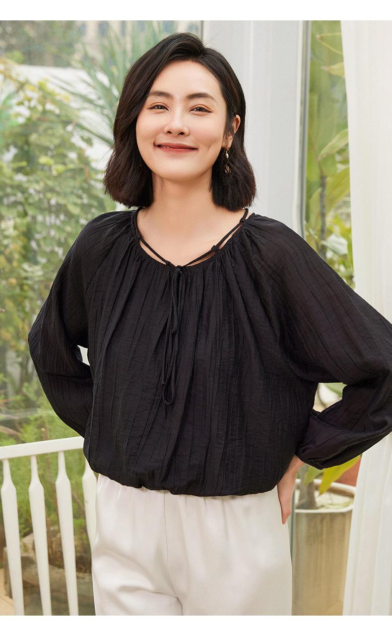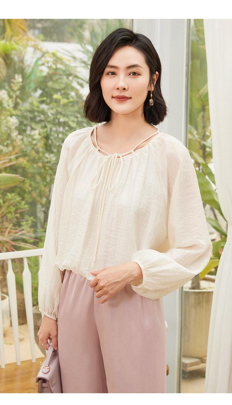 Protector Solar de Verano Nueva Camisa Elegante Pequeña de Tencel para Mujer Suelta Plisada Cuello Redondo con Cordones Casual Manga Linterna Top Camisa