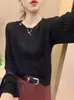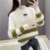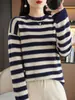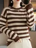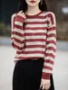 Suéter fino de primavera y otoño para mujer, conjunto de camisa de base a rayas con cuello redondo, top de base de punto, top adelgazante suelto