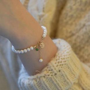 | Pulsera de perlas de agua dulce naturales con colgante de la marca Fu, diseño de nicho de moda femenina, circonita verde de alta gama, nueva joyería de mano de estilo chino |