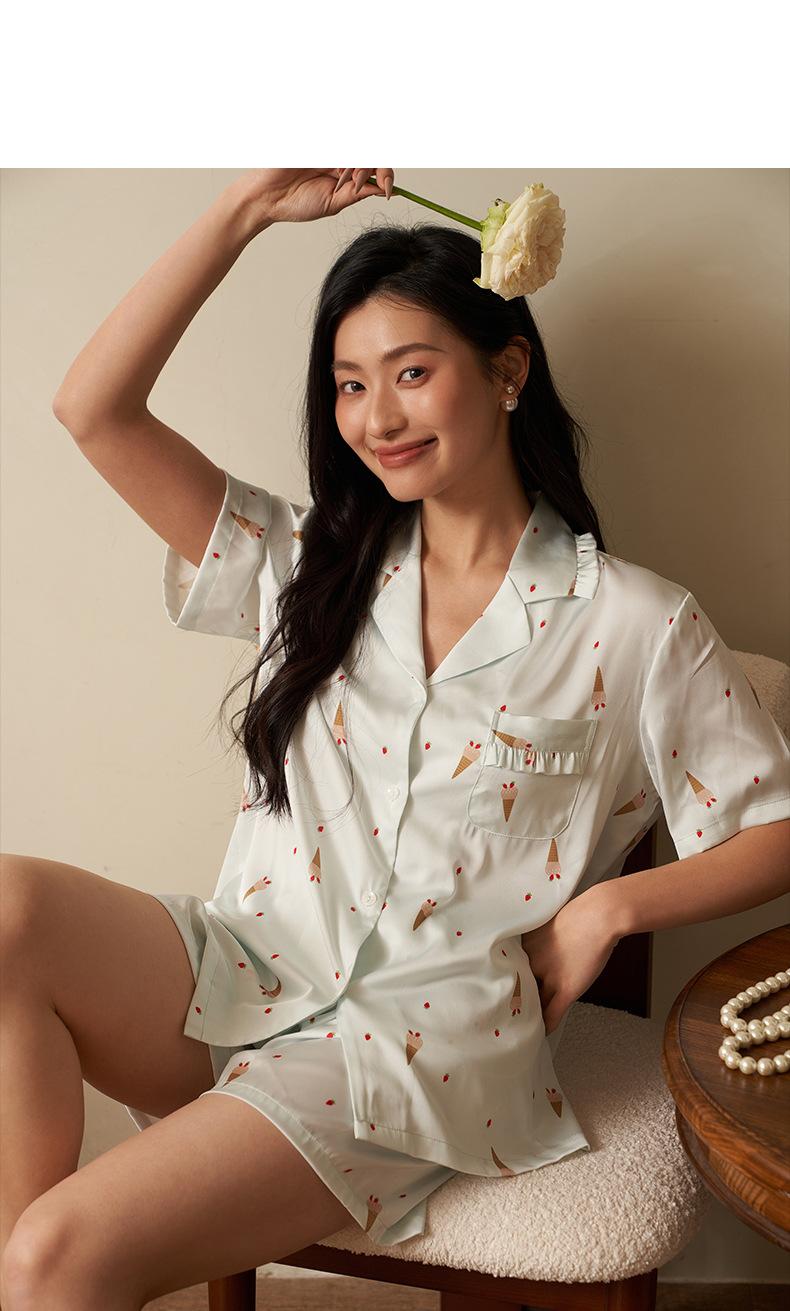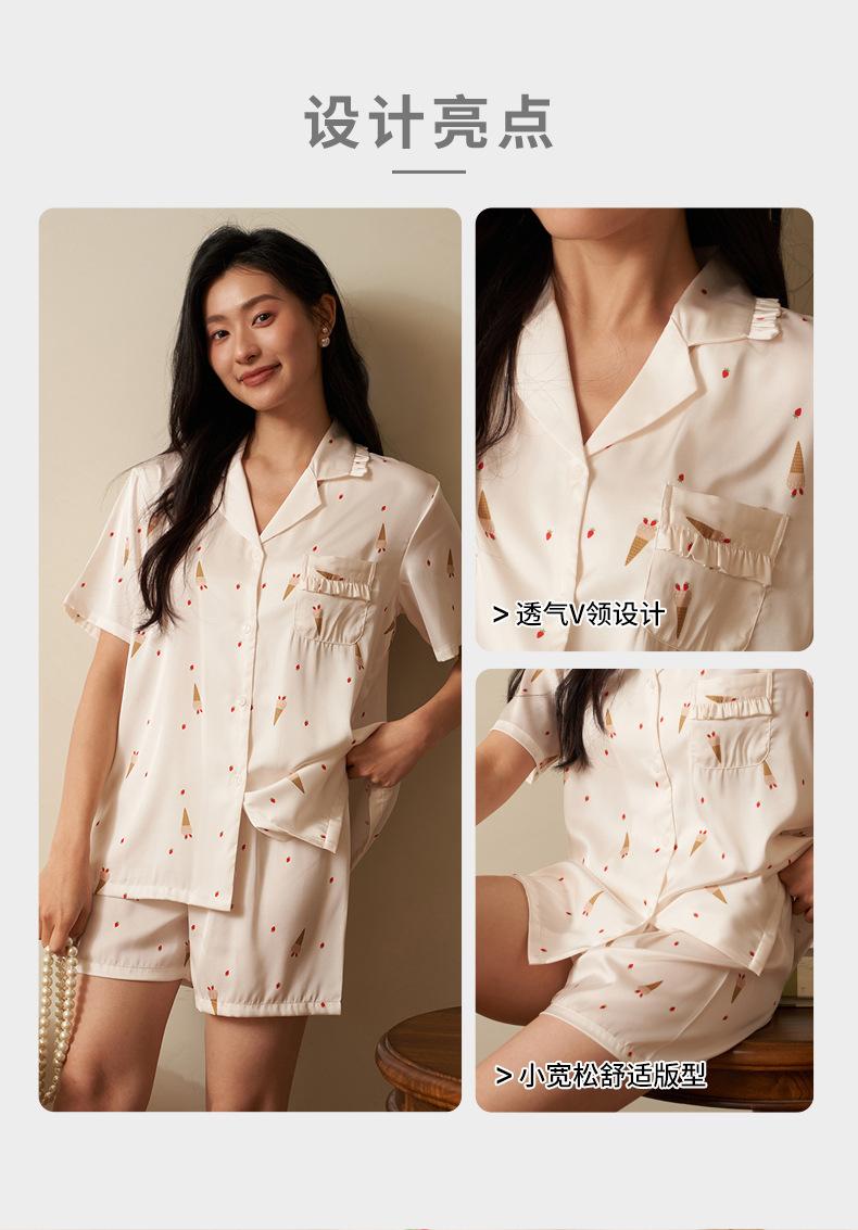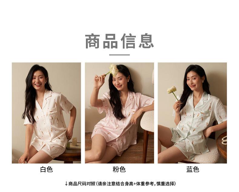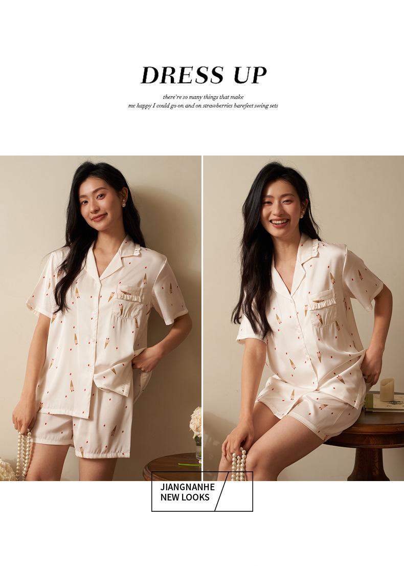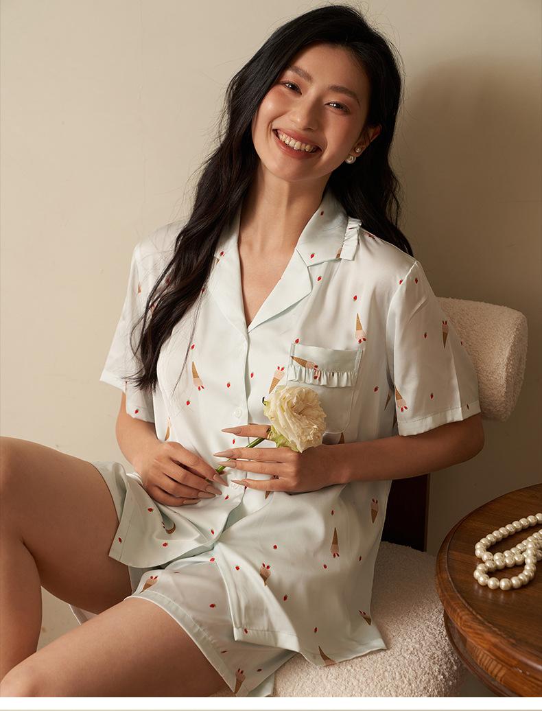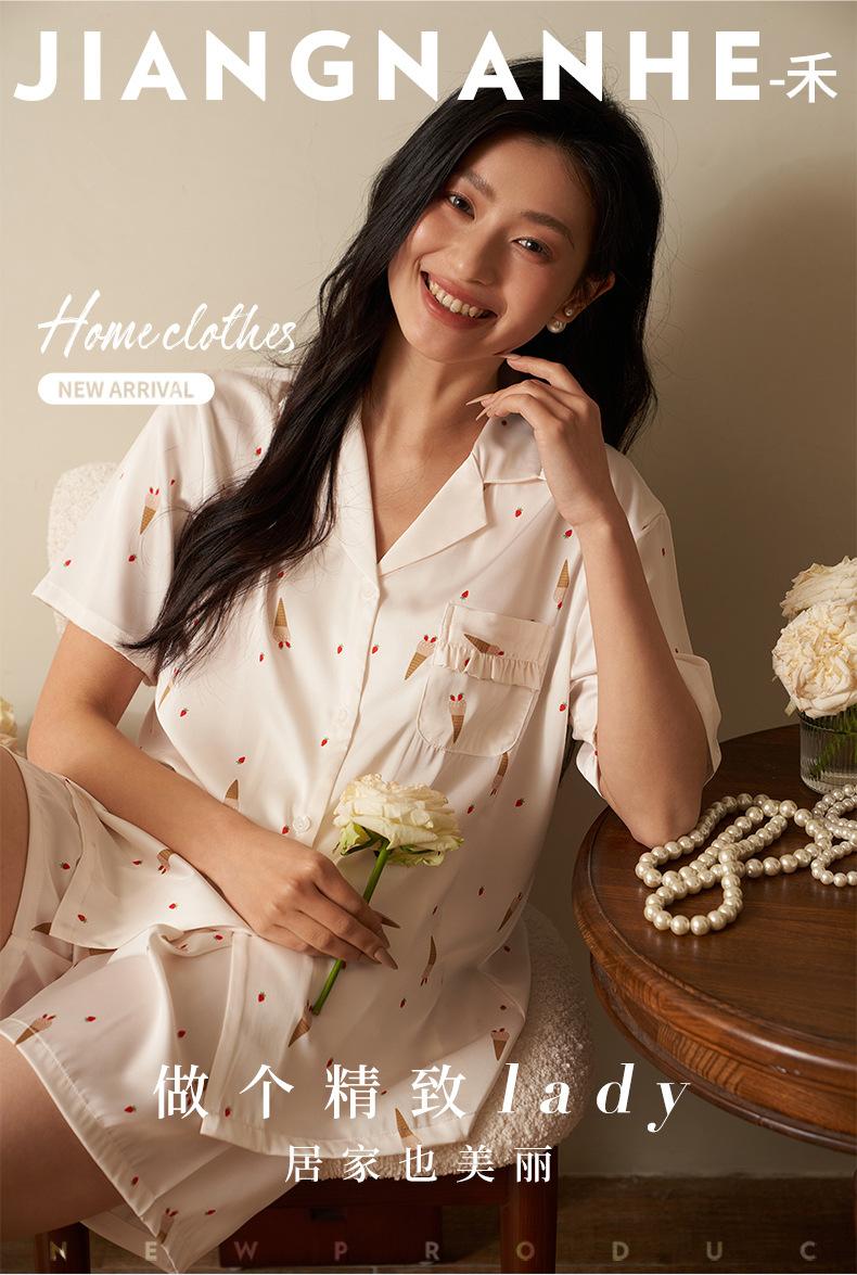 Jiangnan Wo 2024 - Pijama de seda helada para mujer, pantalones cortos de manga corta con cuello de hoja de loto, conjunto de ropa para el hogar con helado, novedad de verano