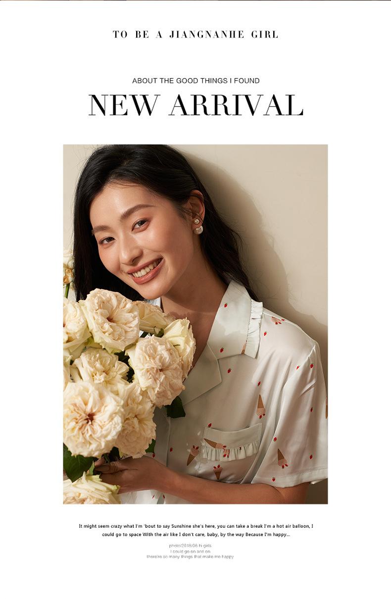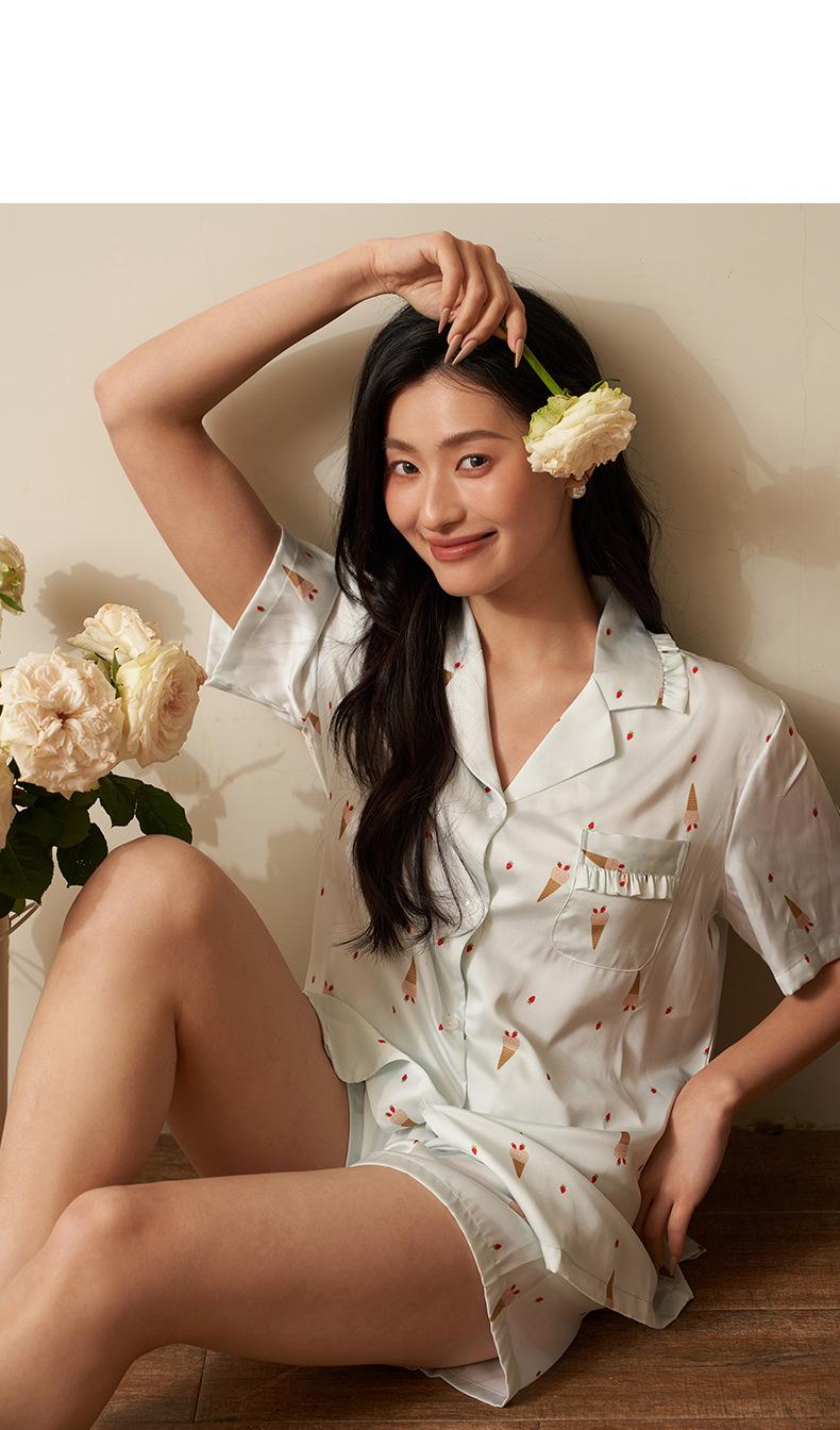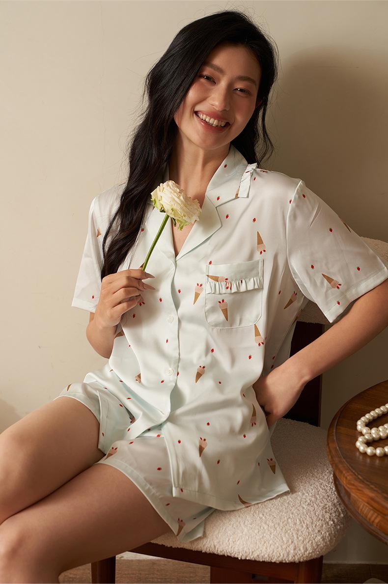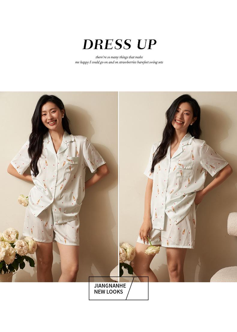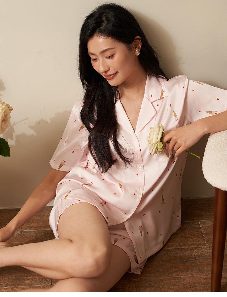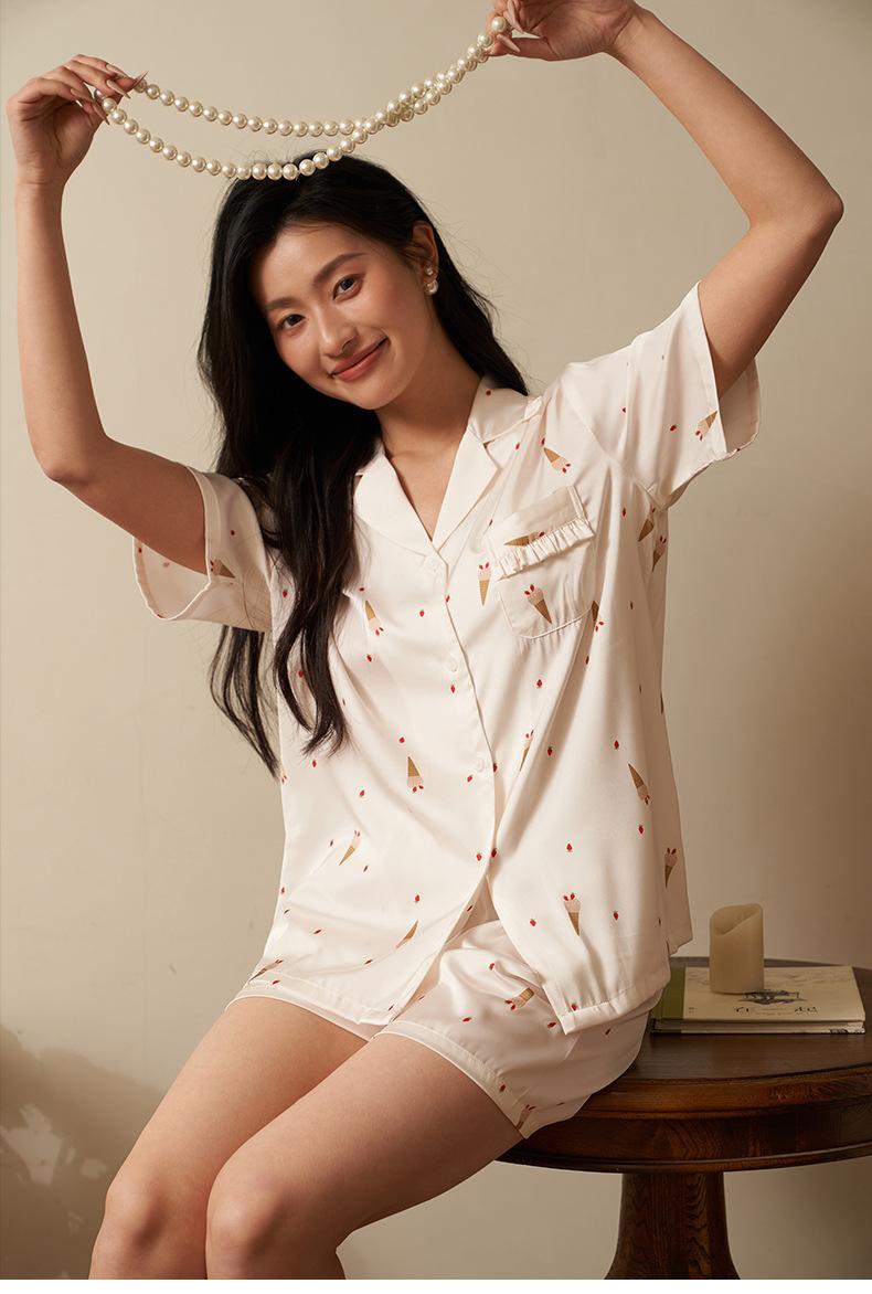 Jiangnan Wo 2024 - Pijama de seda helada para mujer, pantalones cortos de manga corta con cuello de hoja de loto, conjunto de ropa para el hogar con helado, novedad de verano